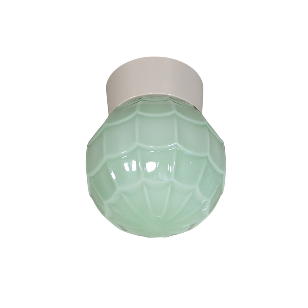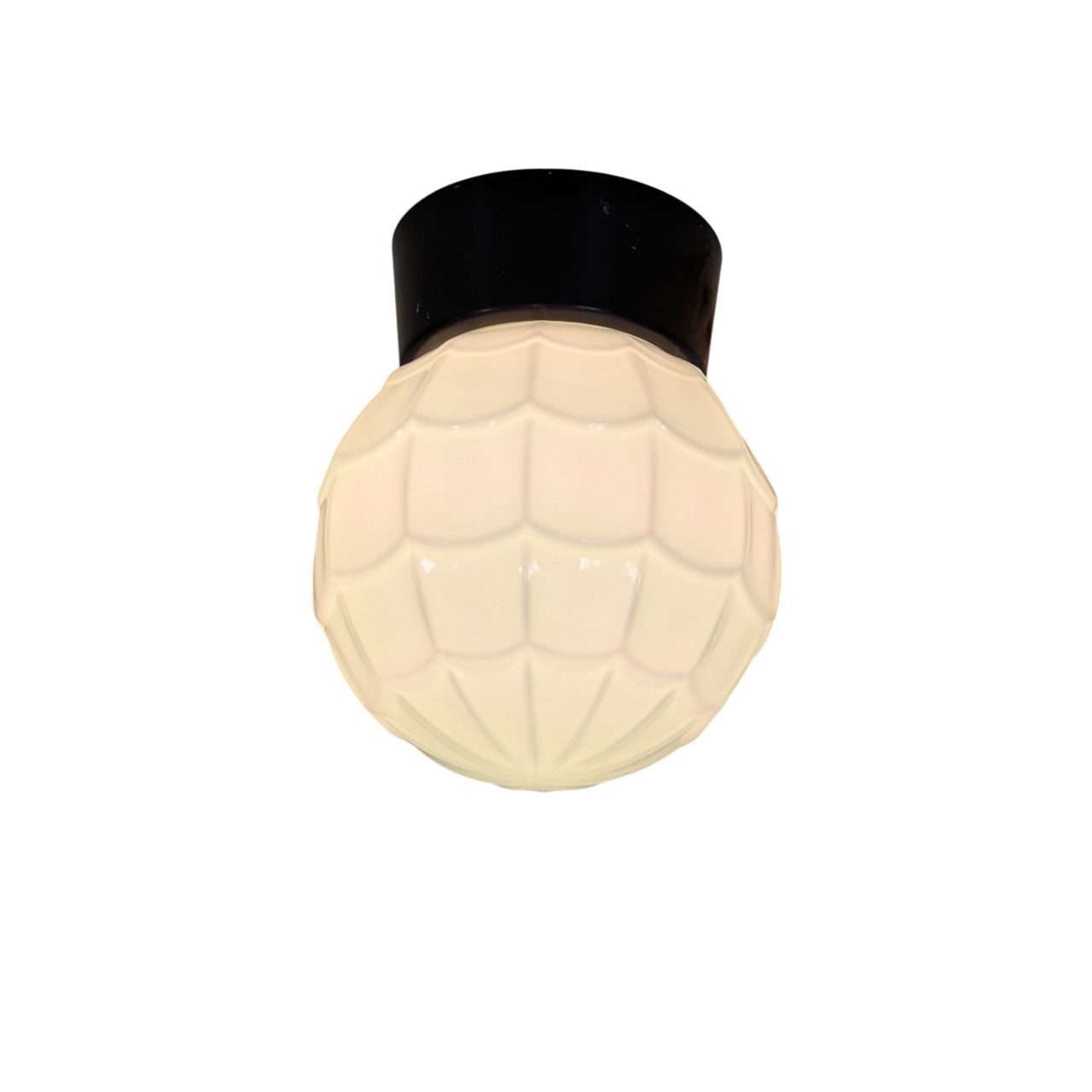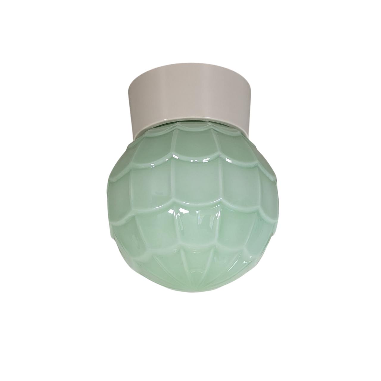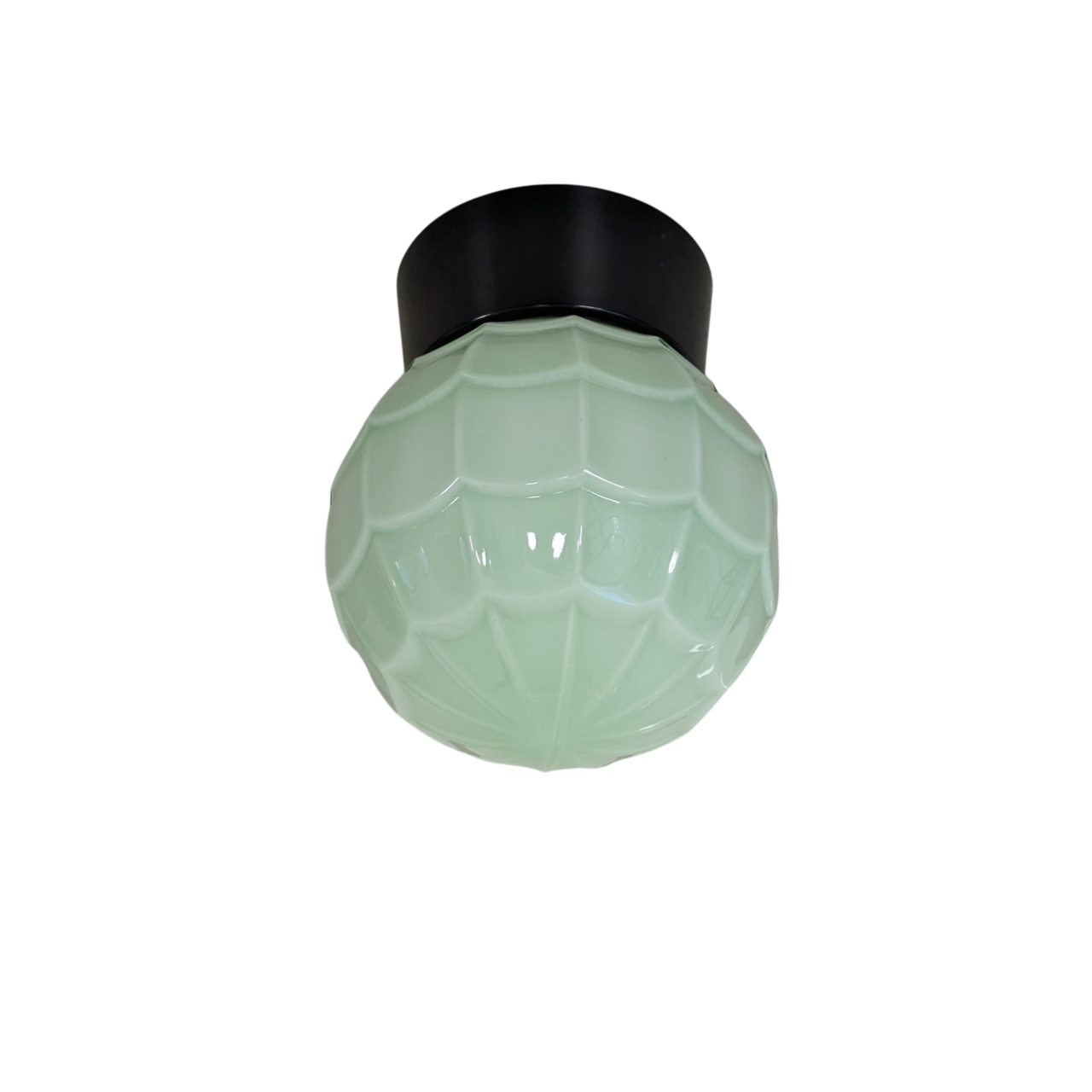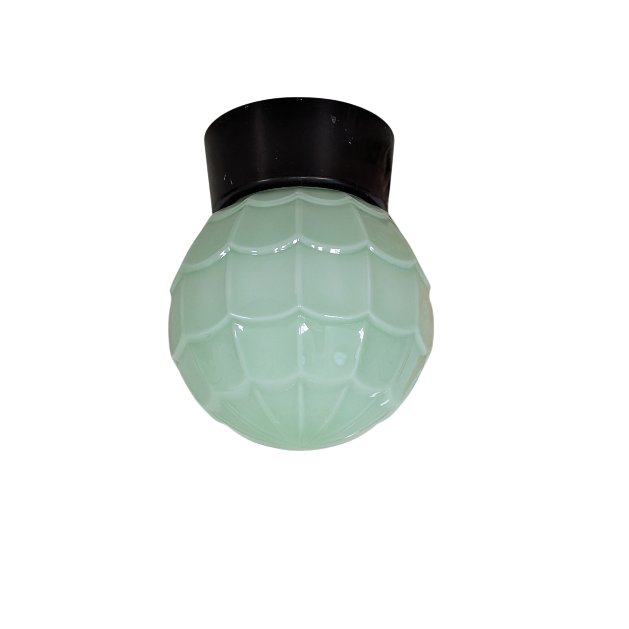 Plafondlamp, bakelieten houder, opaal groen glas model ‘Artisjok’. De lamp komt uit de serie Thabur van bakelieten verlichting. Combineer de glazen kappen met een plafondhouder van wit of zwart bakeliet. Bij bestelling dit aangeven. Gratis verzending NL.