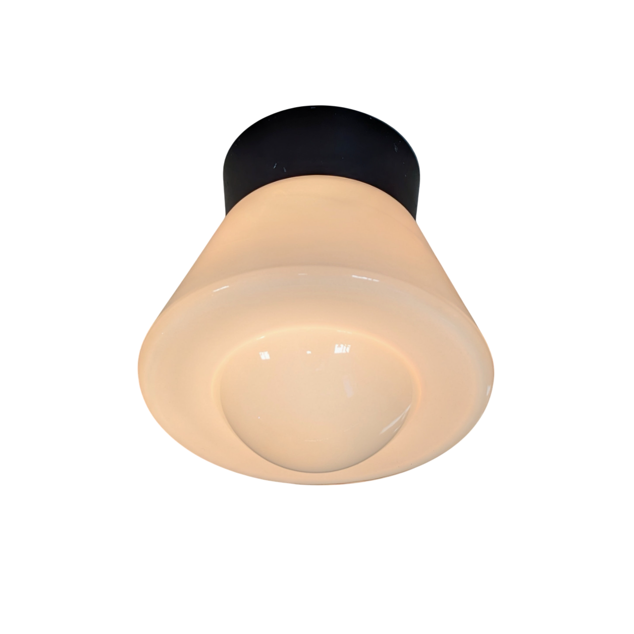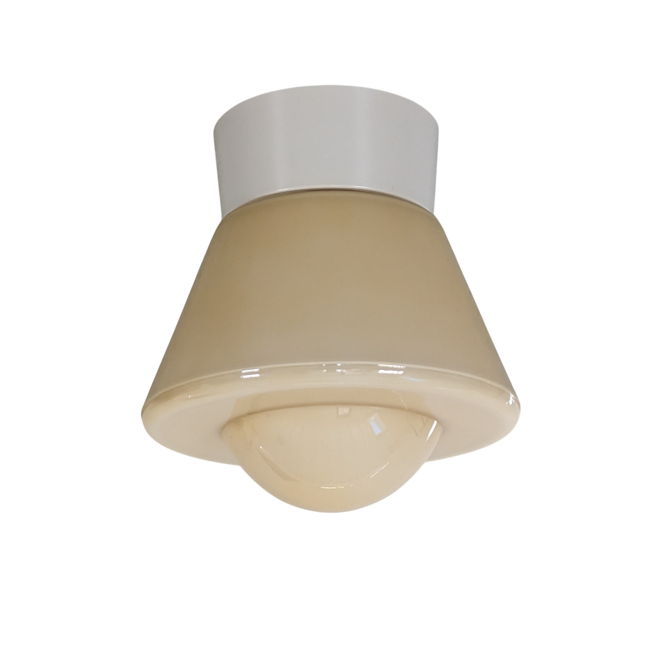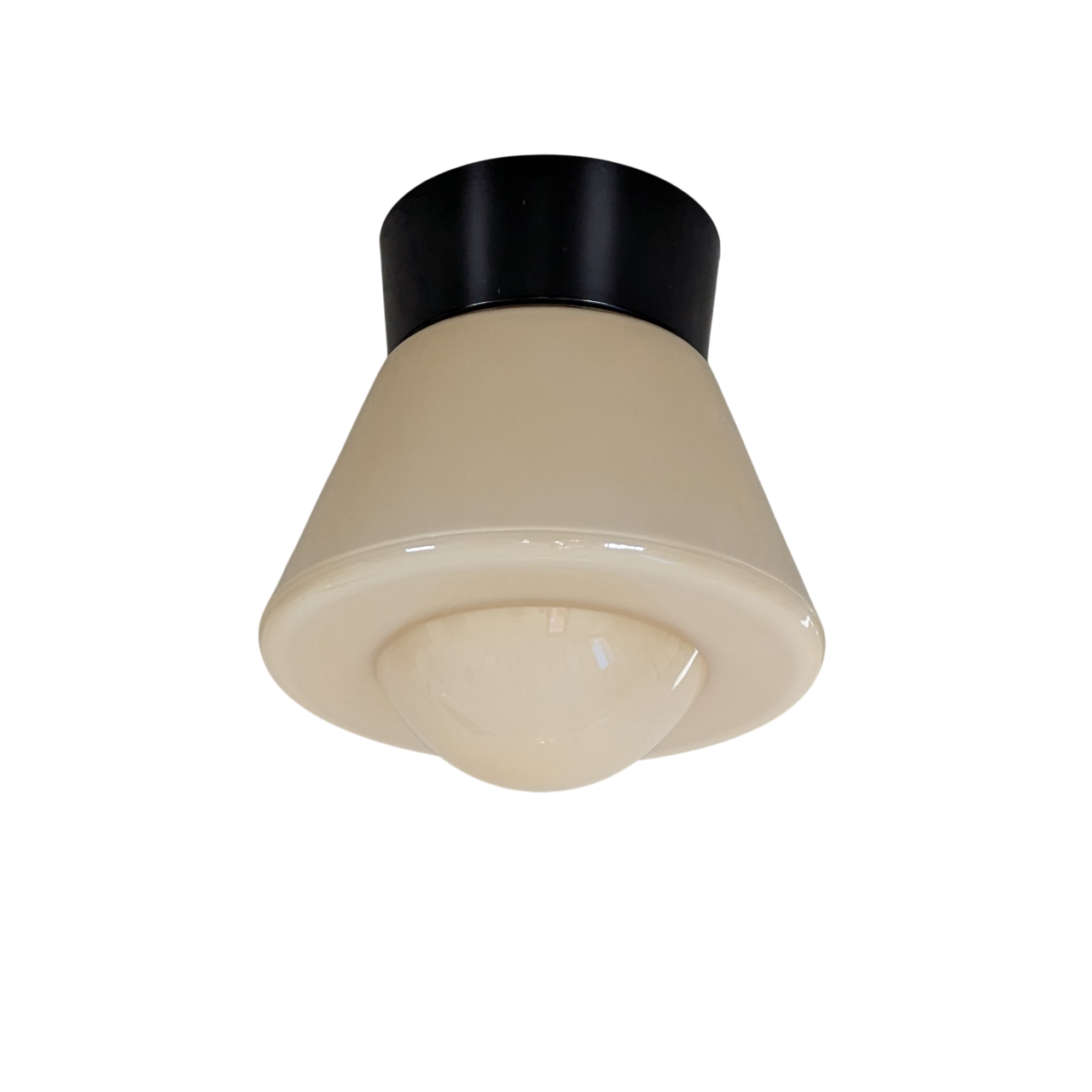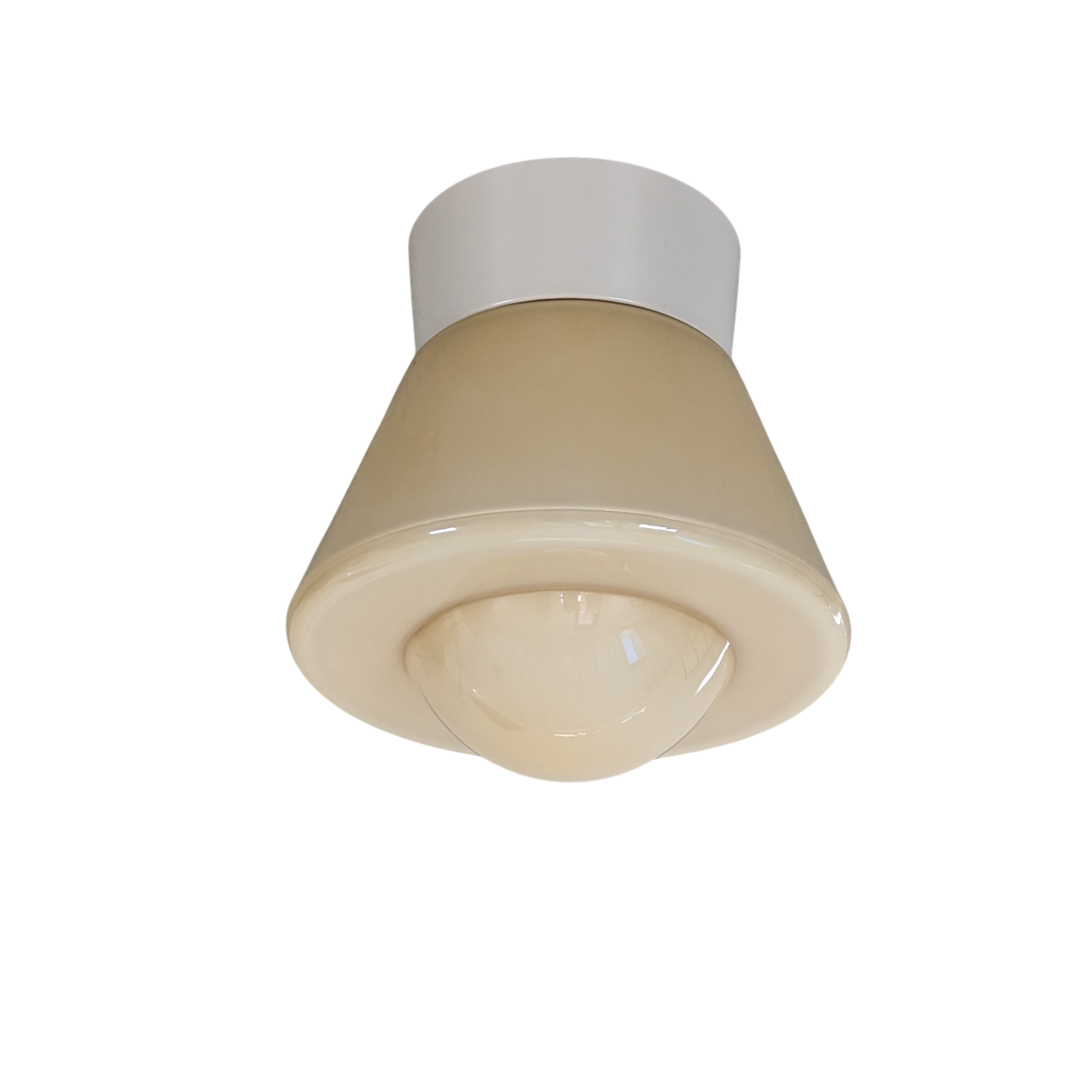 Plafondamp, bakelieten houder, opaal oker glas model ‘Komeet’. De lamp komt uit de serie Thabur van bakelieten verlichting. Combineer de glazen kappen met een plafondhouder van wit of van zwart bakeliet. Bij bestelling dit aangeven. Gratis verzending NL.