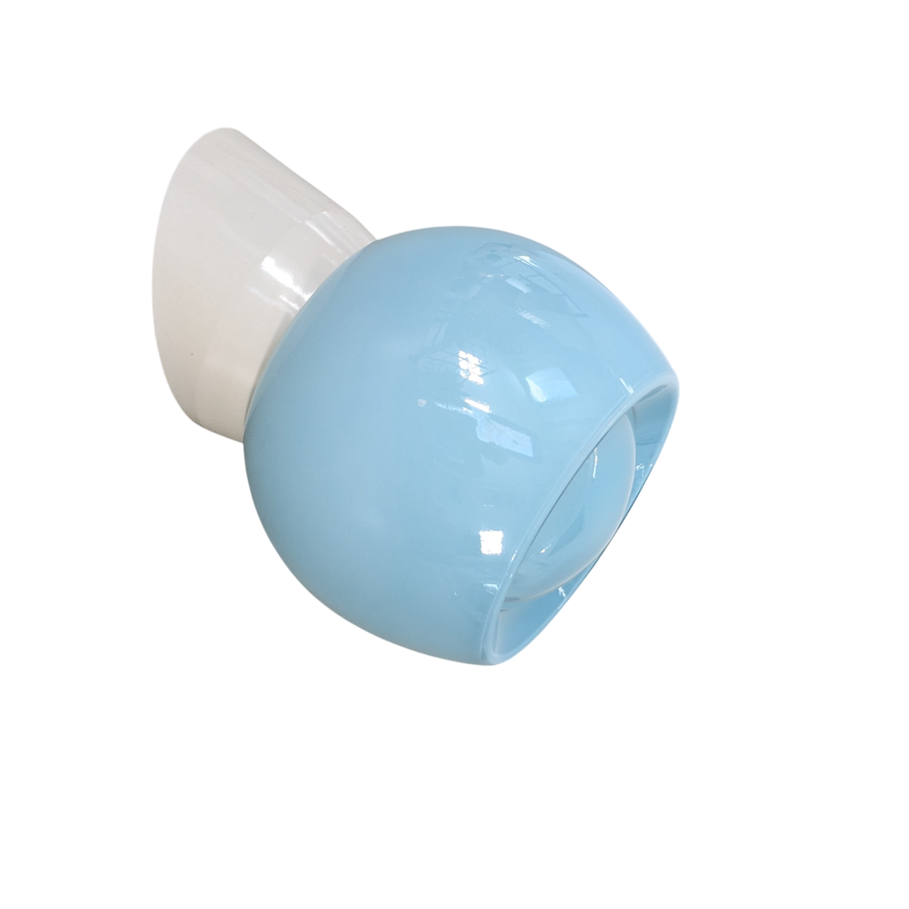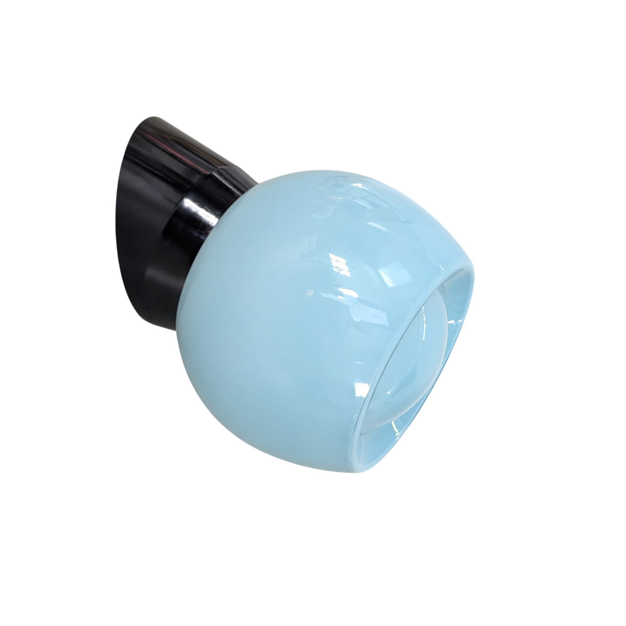Wandlamp, bakelieten houder, opaal blauw glas model ‘Knop’. De lamp komt uit de serie Thabur van bakelieten verlichting. Combineer de glazen kappen met een wandhouder van wit of zwart bakeliet. Bij bestelling dit aangeven. Gratis verzending NL.