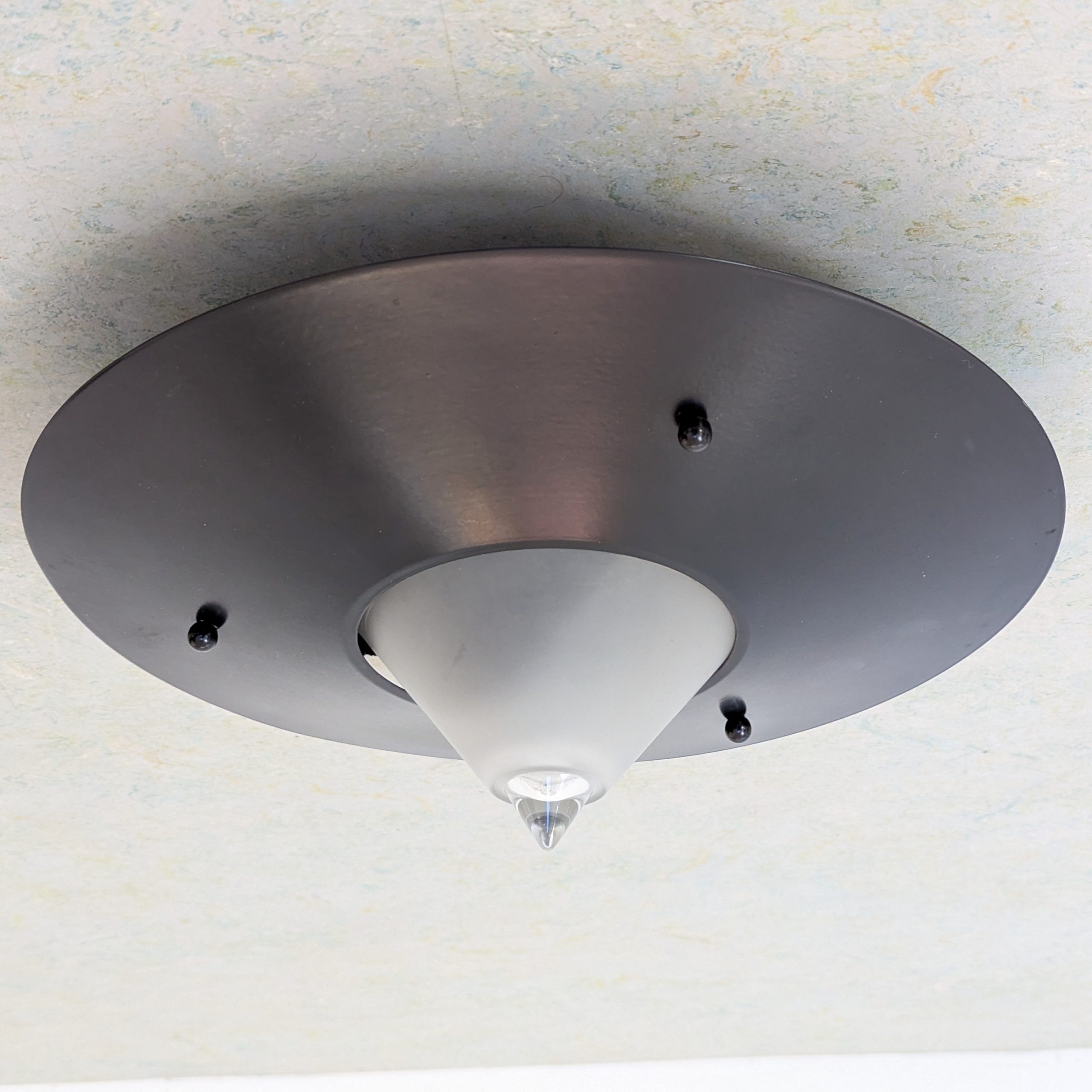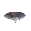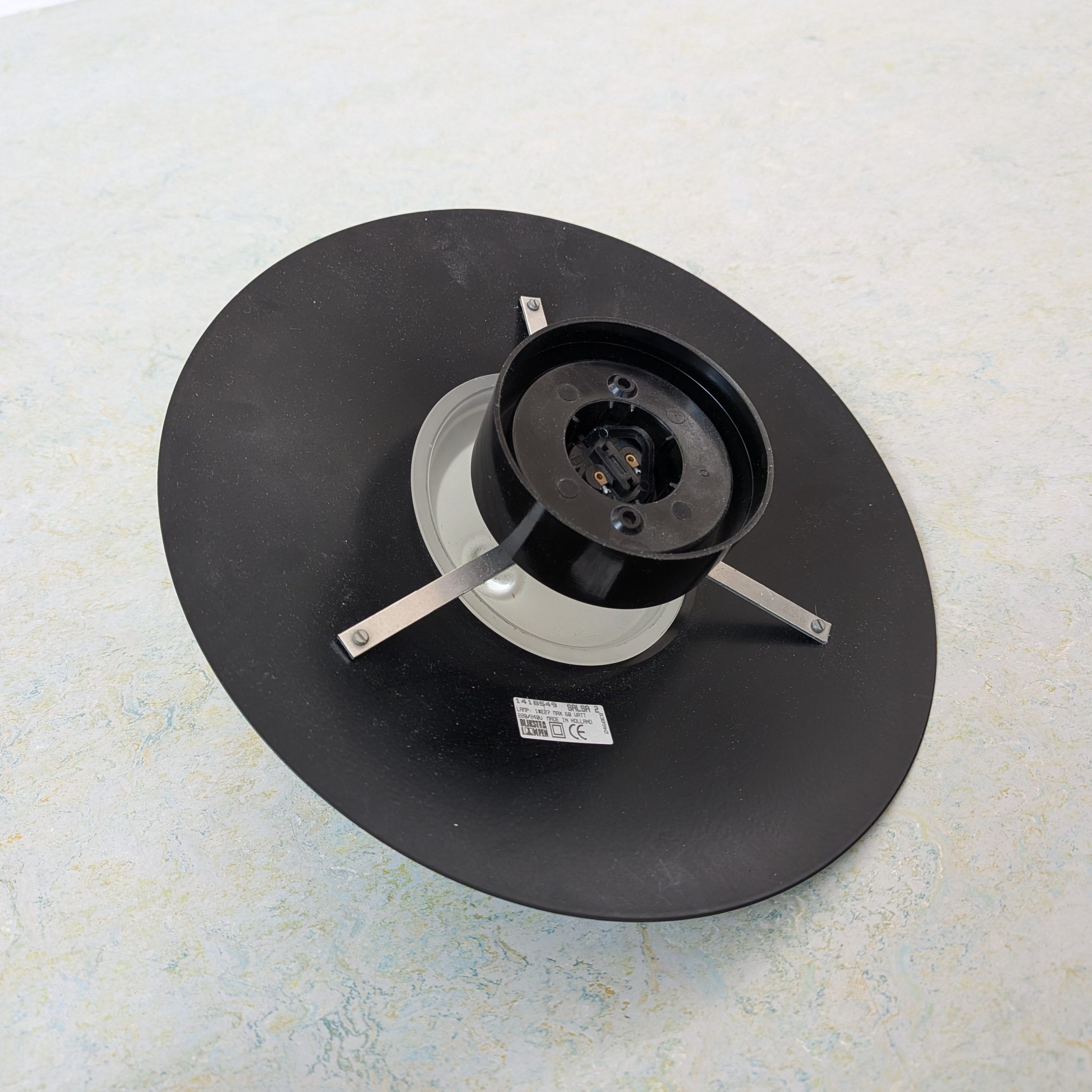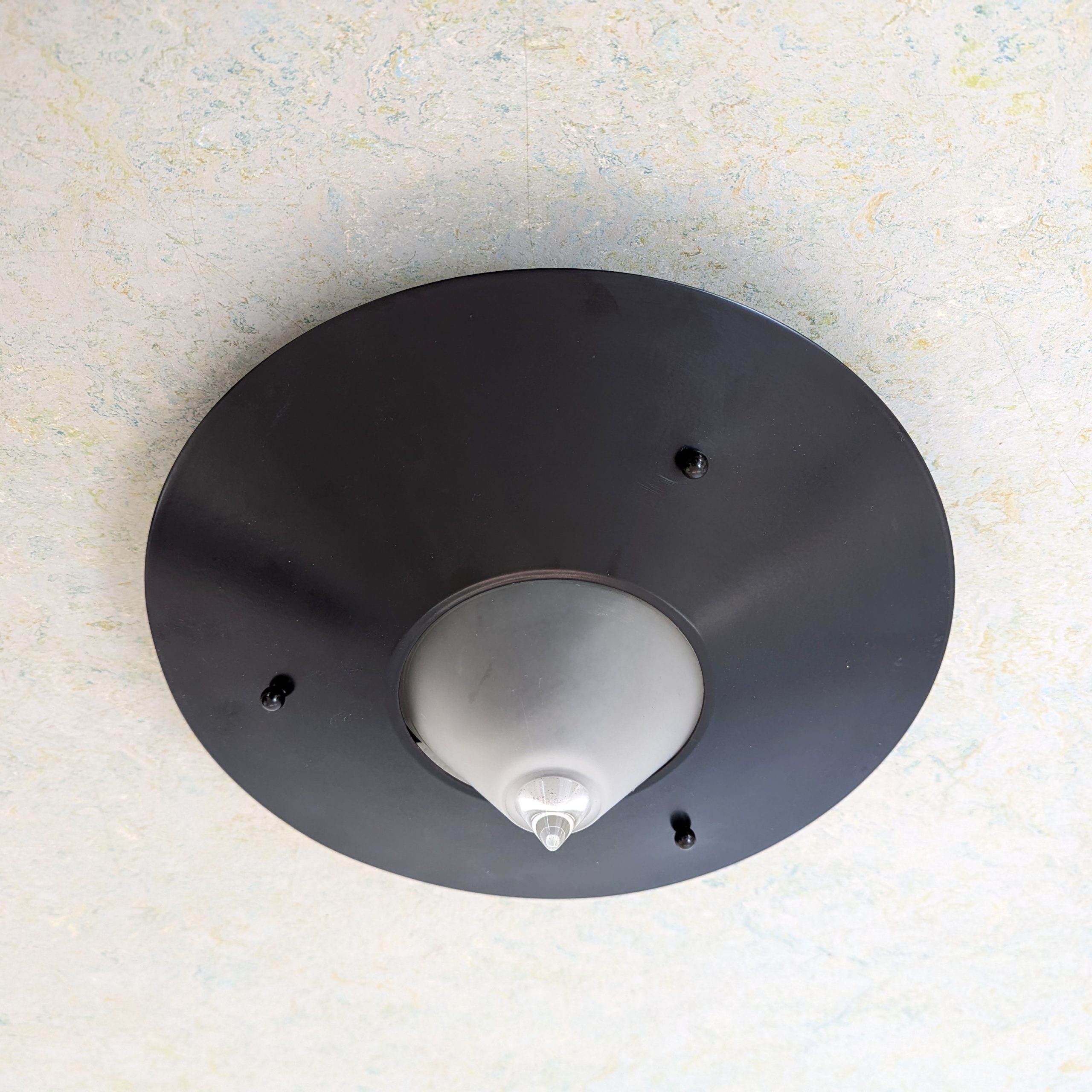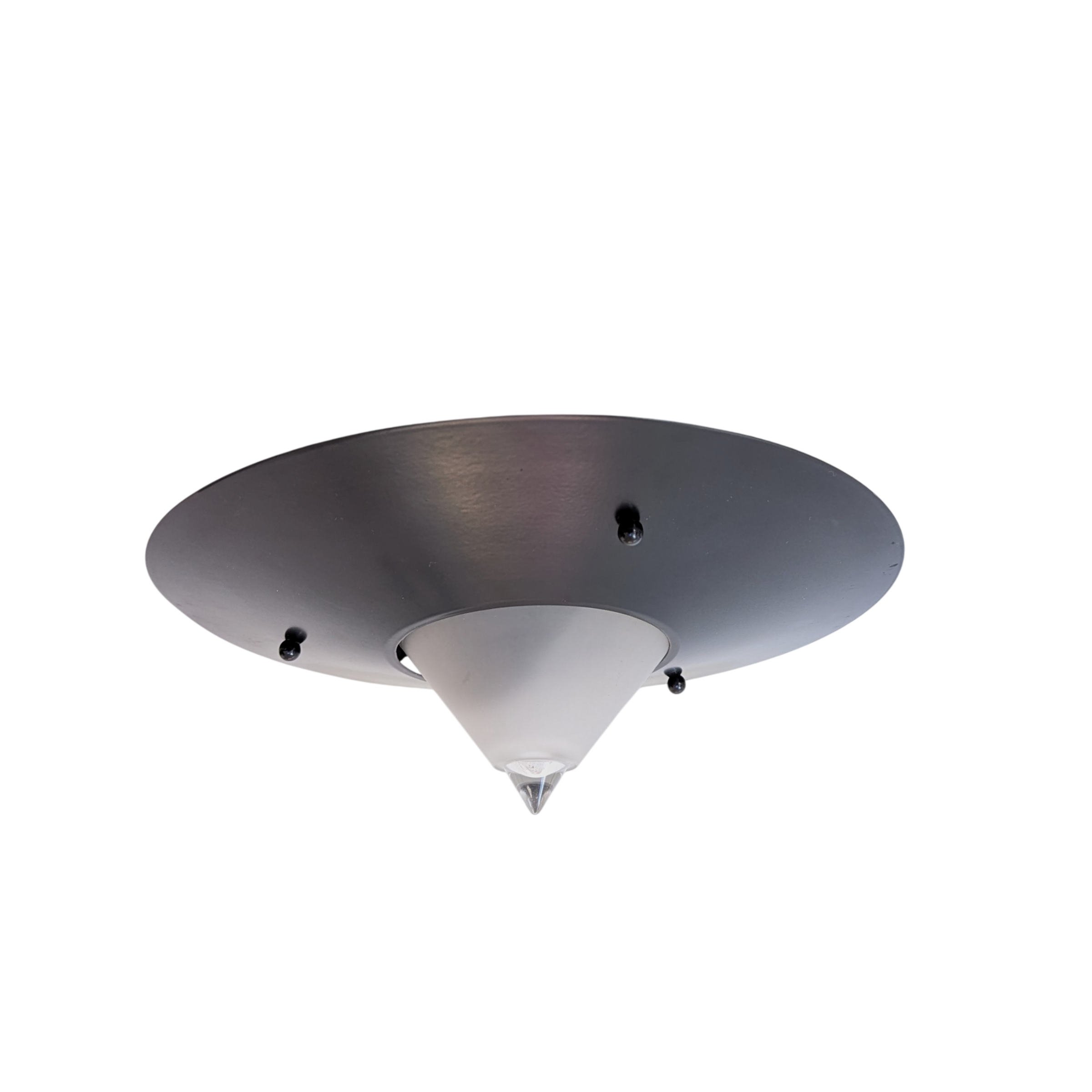 Plafondlamp Jaren 80 van Dijkstra lampen. Gematteerd glazen punt en een zwart gespoten aluminium kap. In een zeer goede staat, nagenoeg nieuwstaat.