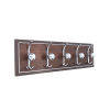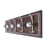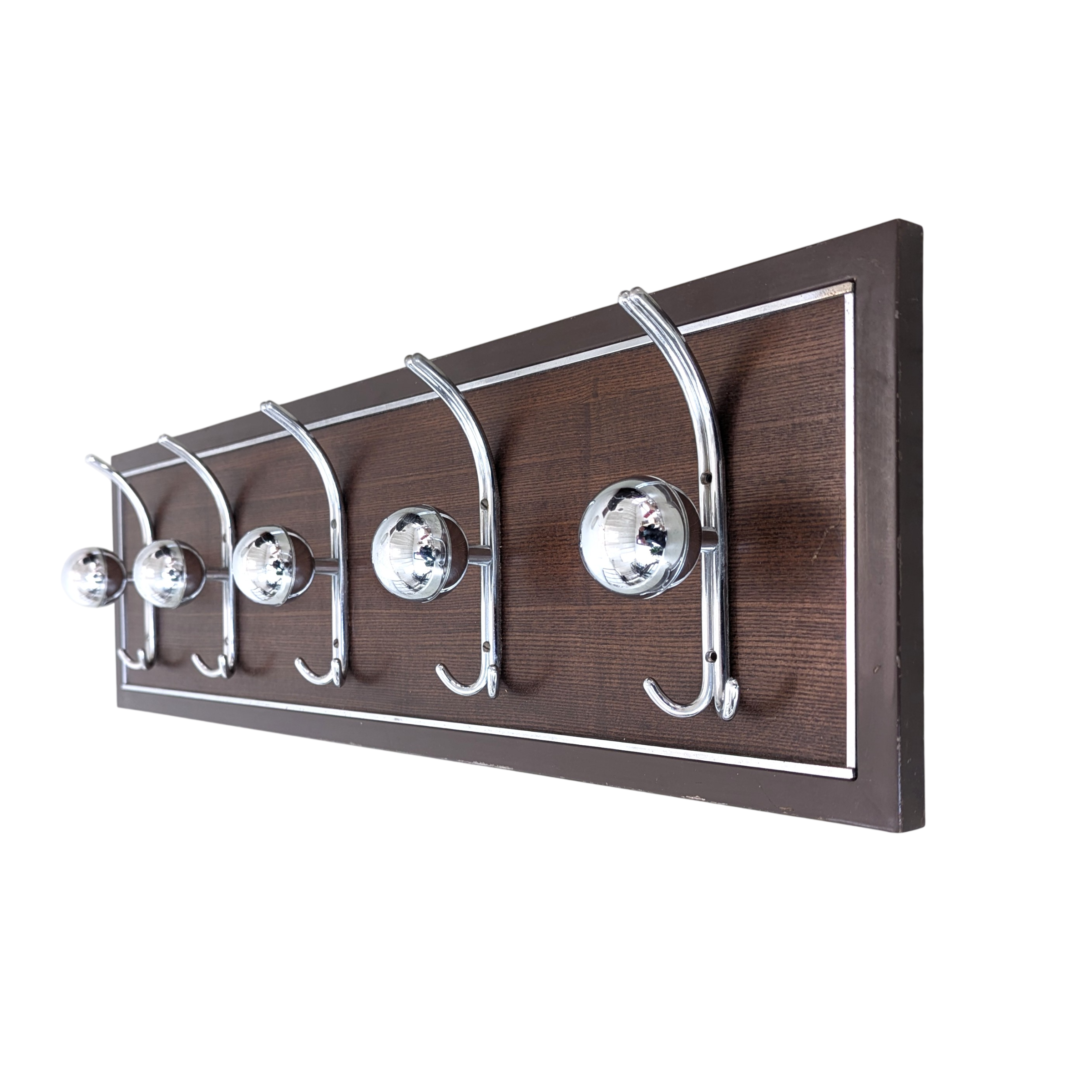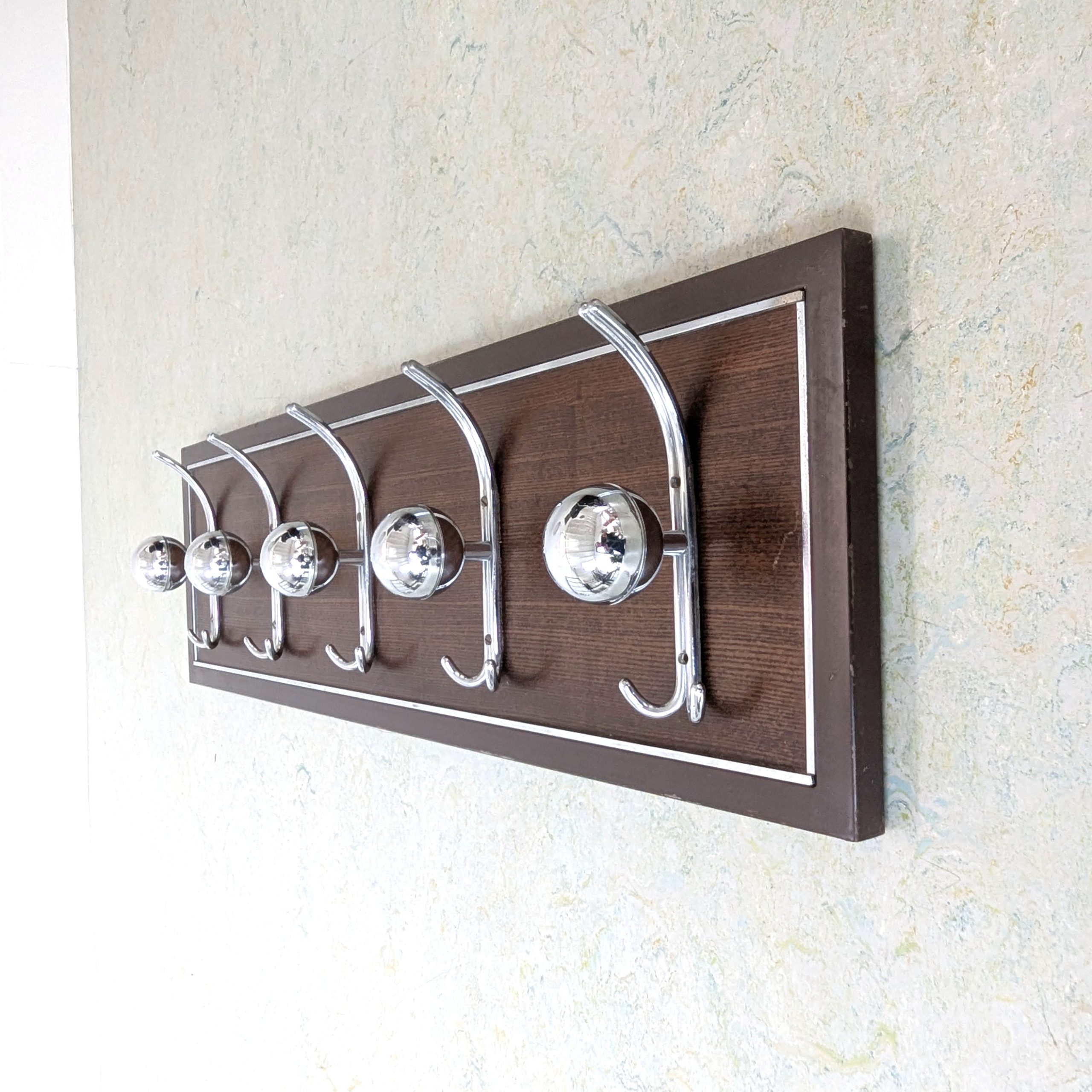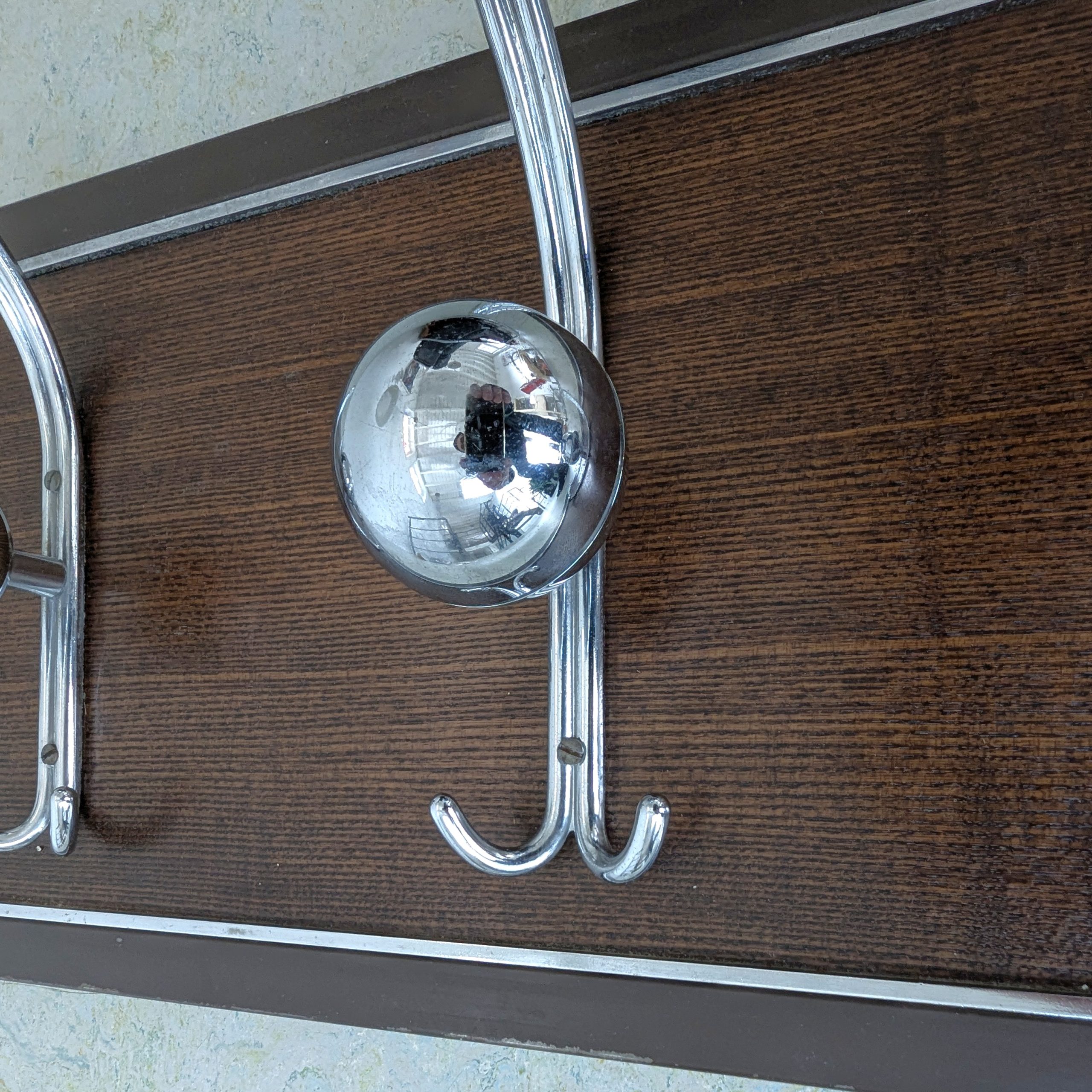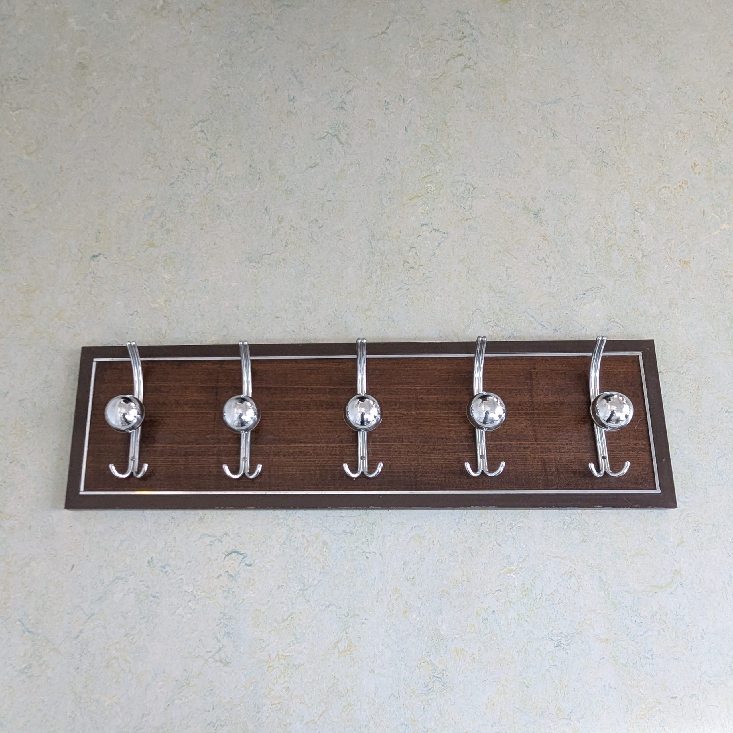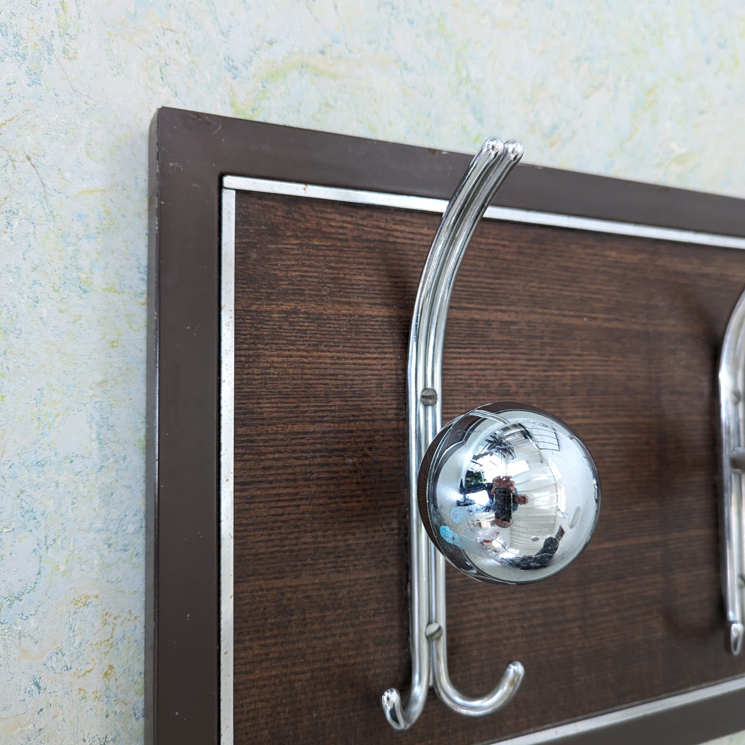 Wand kapstok. Uitgesproken jaren 70 vormgeving en kleurstelling. Hout, metalen rand, verchroomd kunststof en metaal. In een goede staat.
