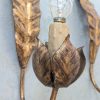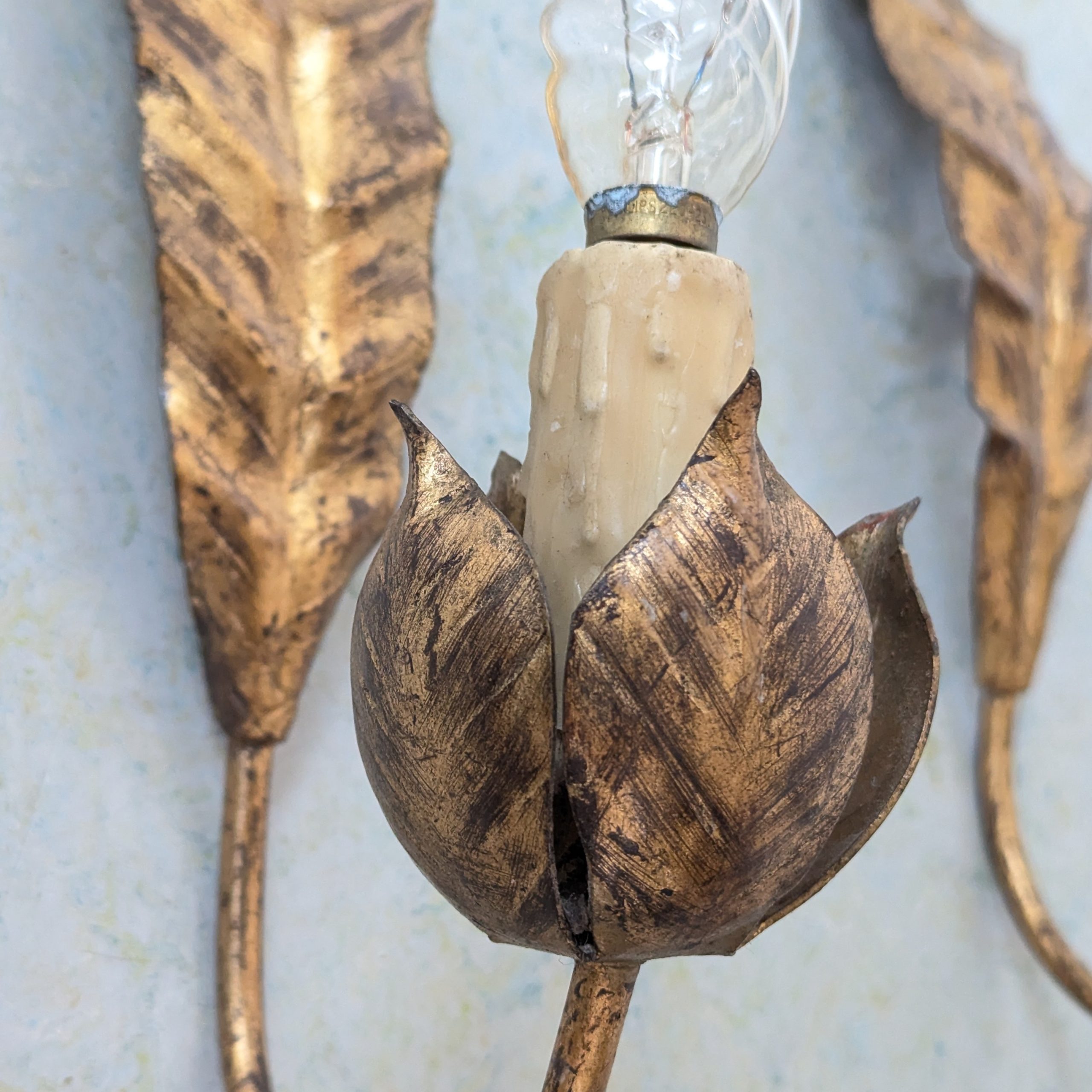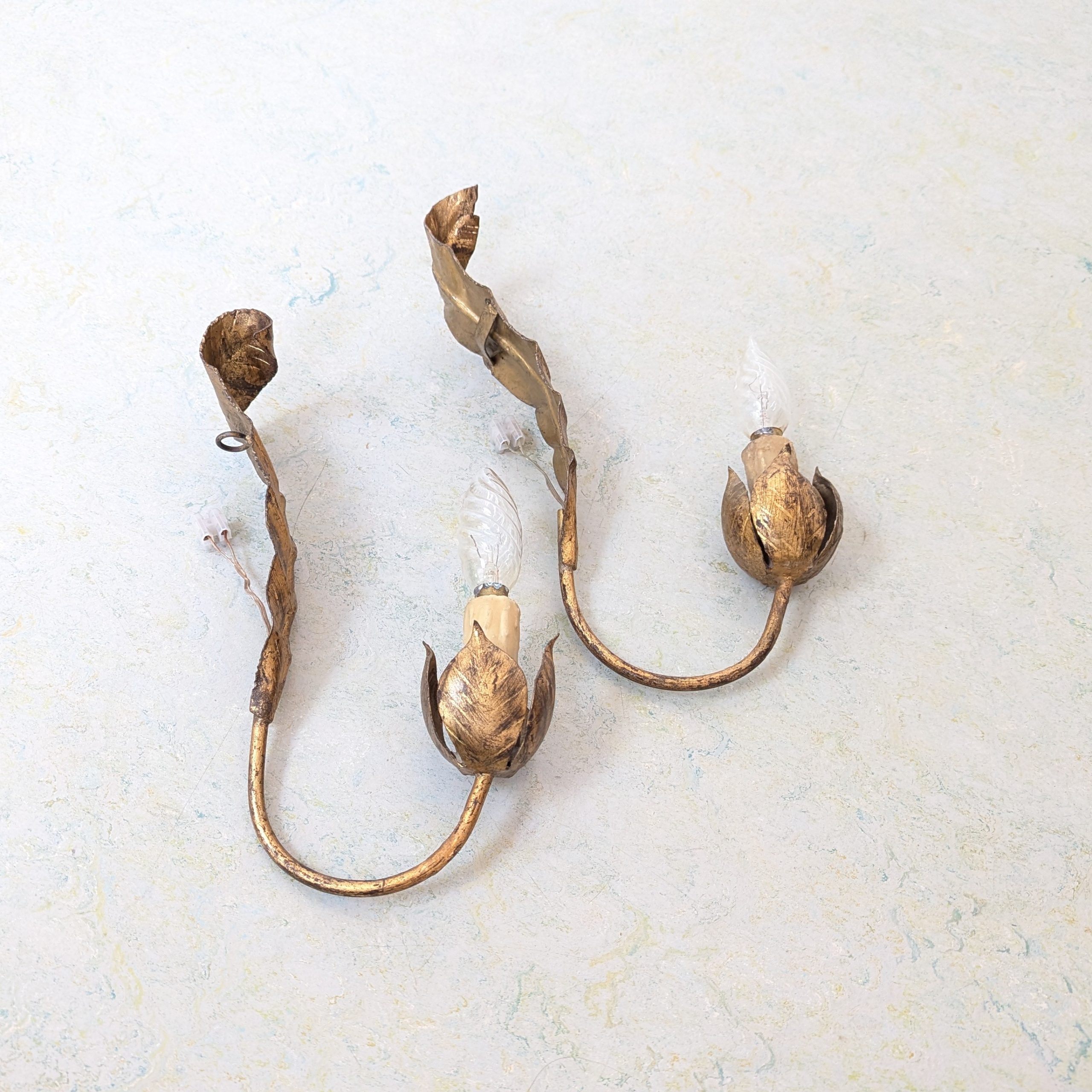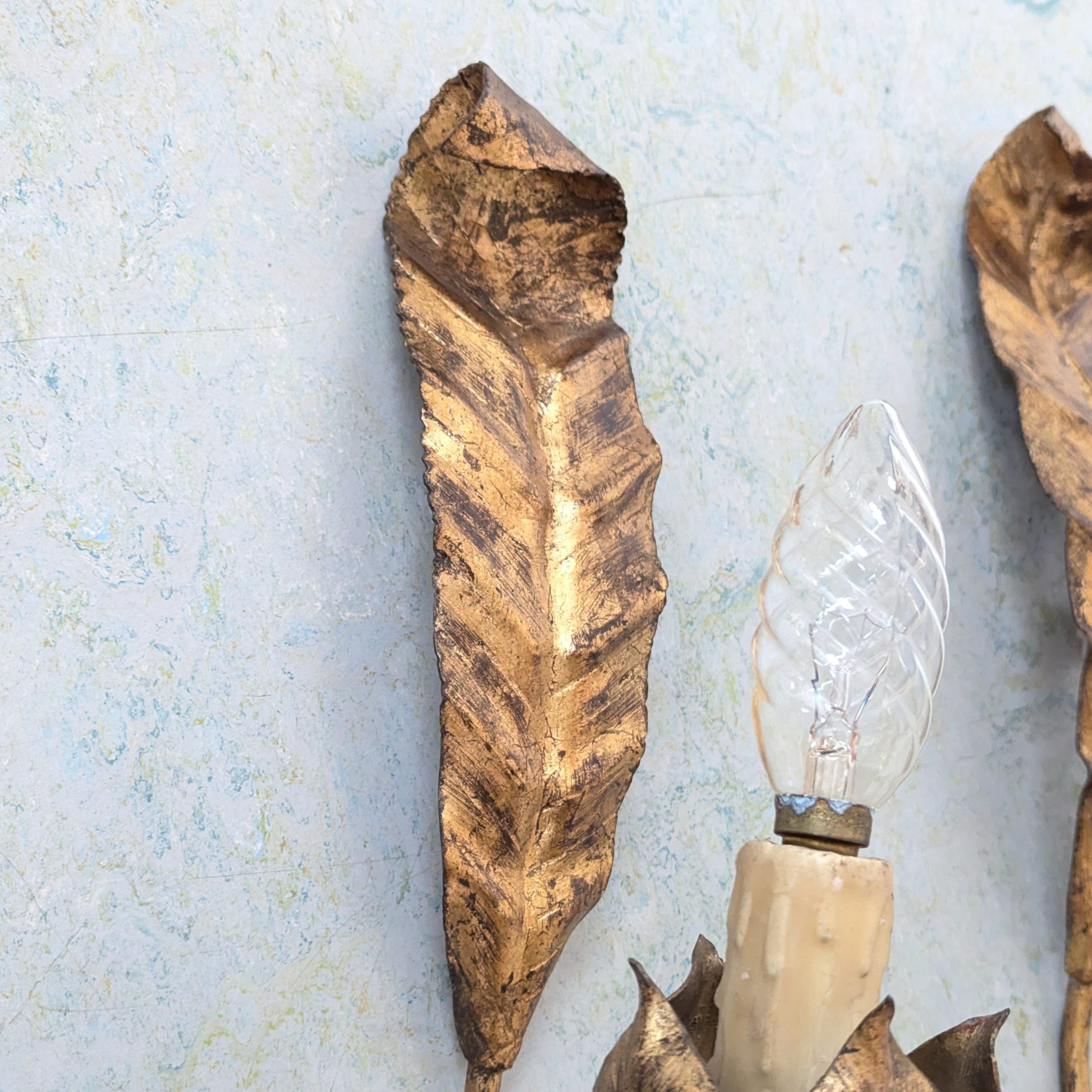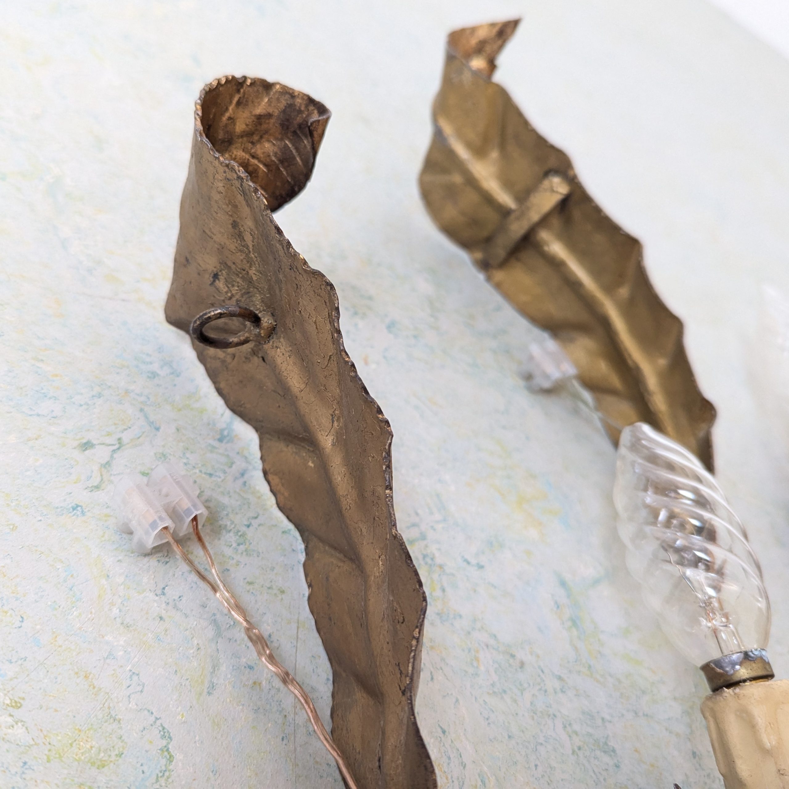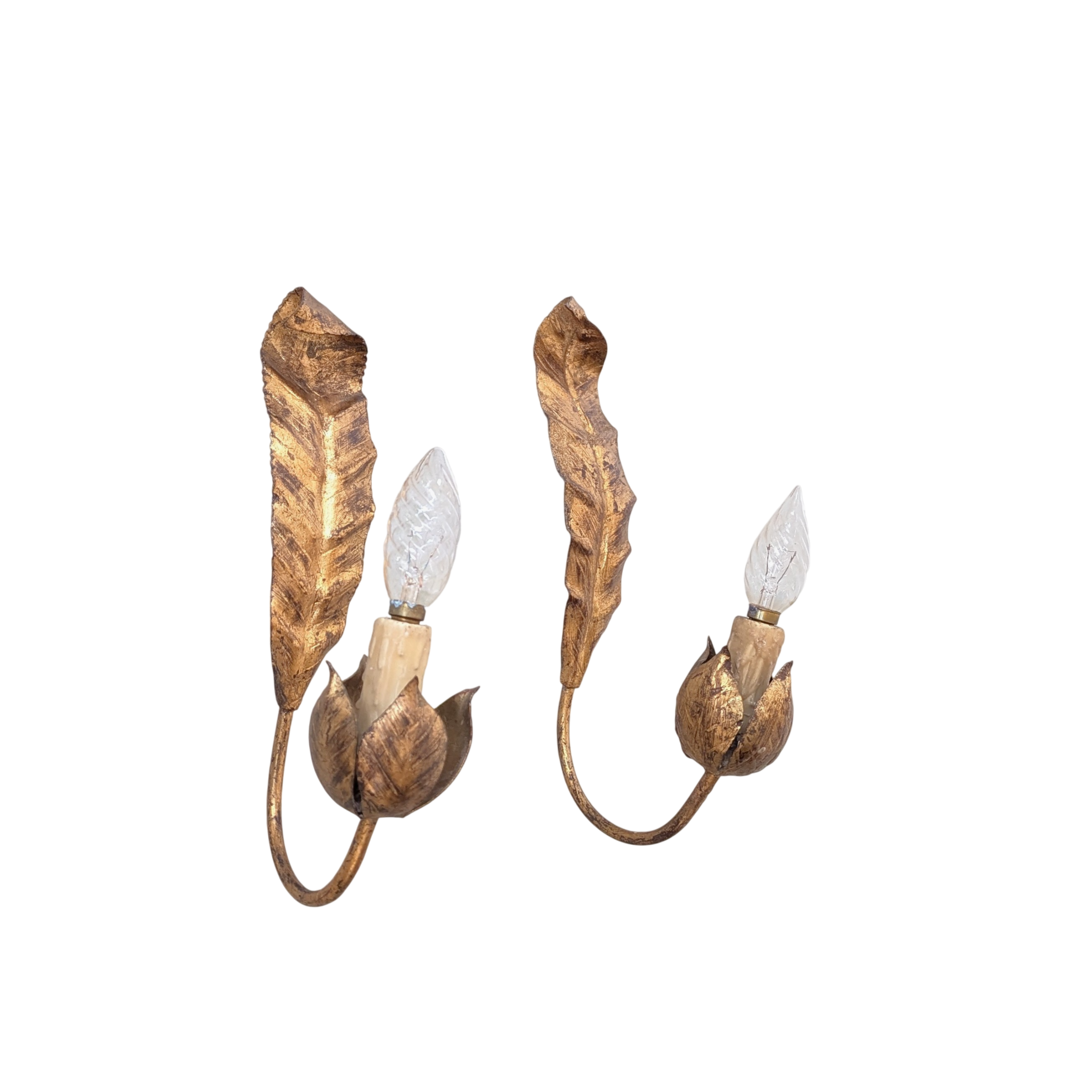 Een paar aparte wandlampen in bladvorm van Ferro Art, Spanje, 1960-1970. Metaal verguld. Handwerk, in een goede en in werkende staat.