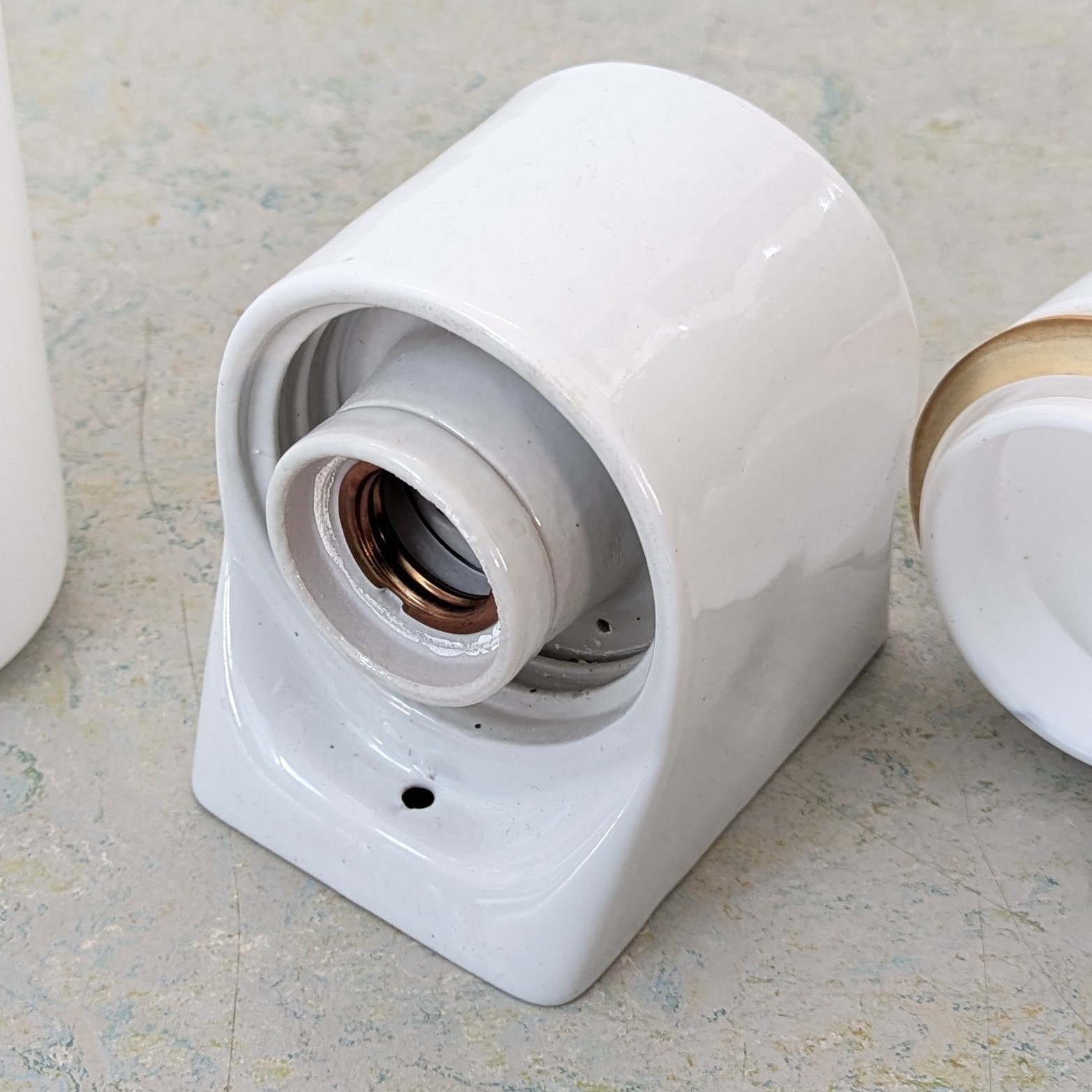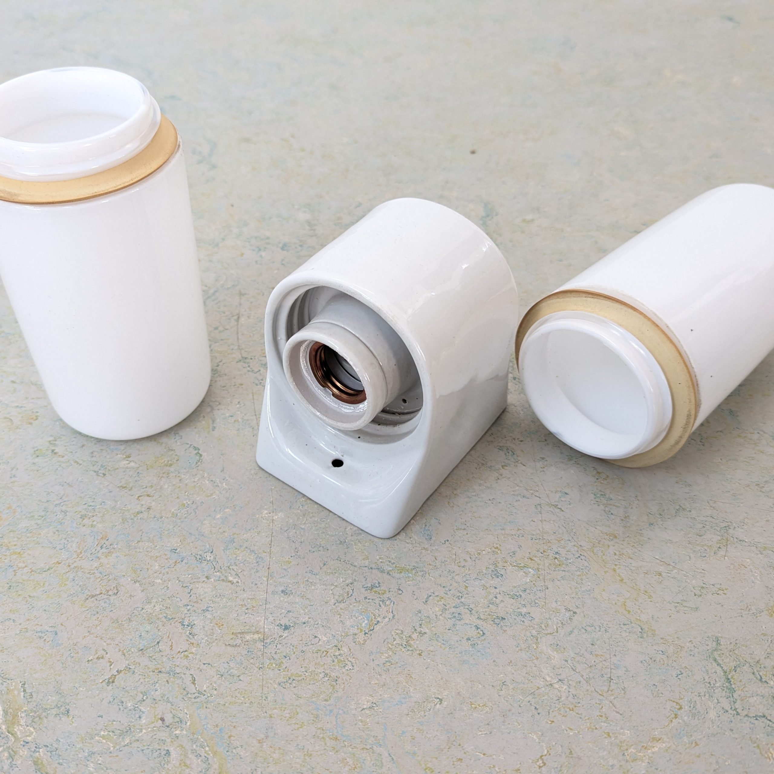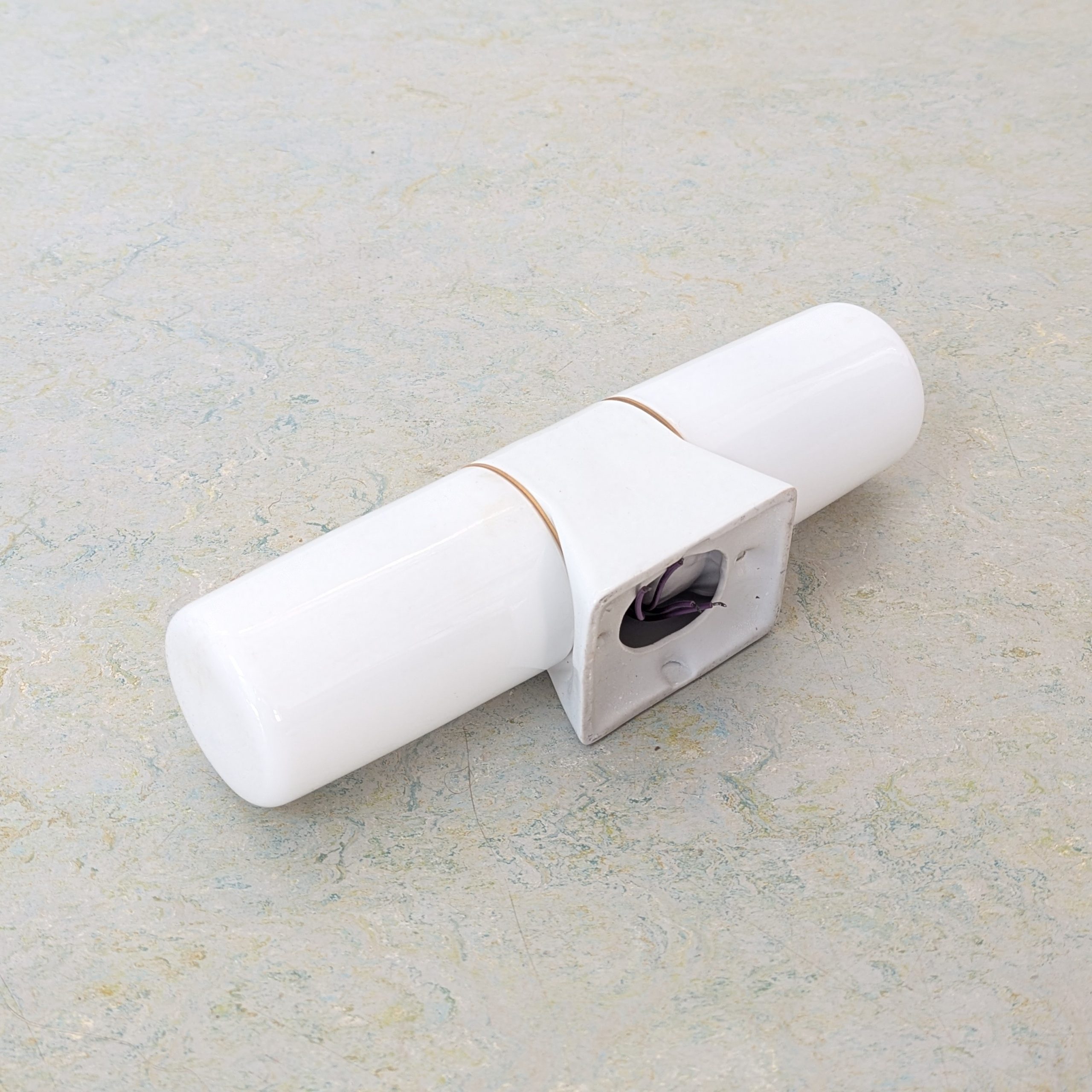 Witte keramische/porseleinen houder met een 2 opaal glazen kappen. Vintage lamp in de geest van het Bauhaus, ontwerp van Wilhelm Wagenfeld voor de Duitse fabrikant Lindner&co Bamberg. Deze lampen werden in de jaren 50 gebruikt in badkamers en wc ruimtes boven of naast spiegels.