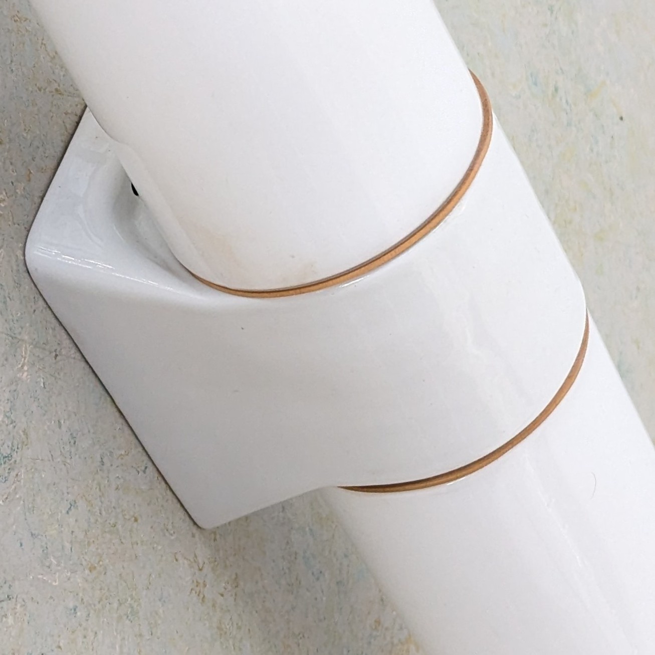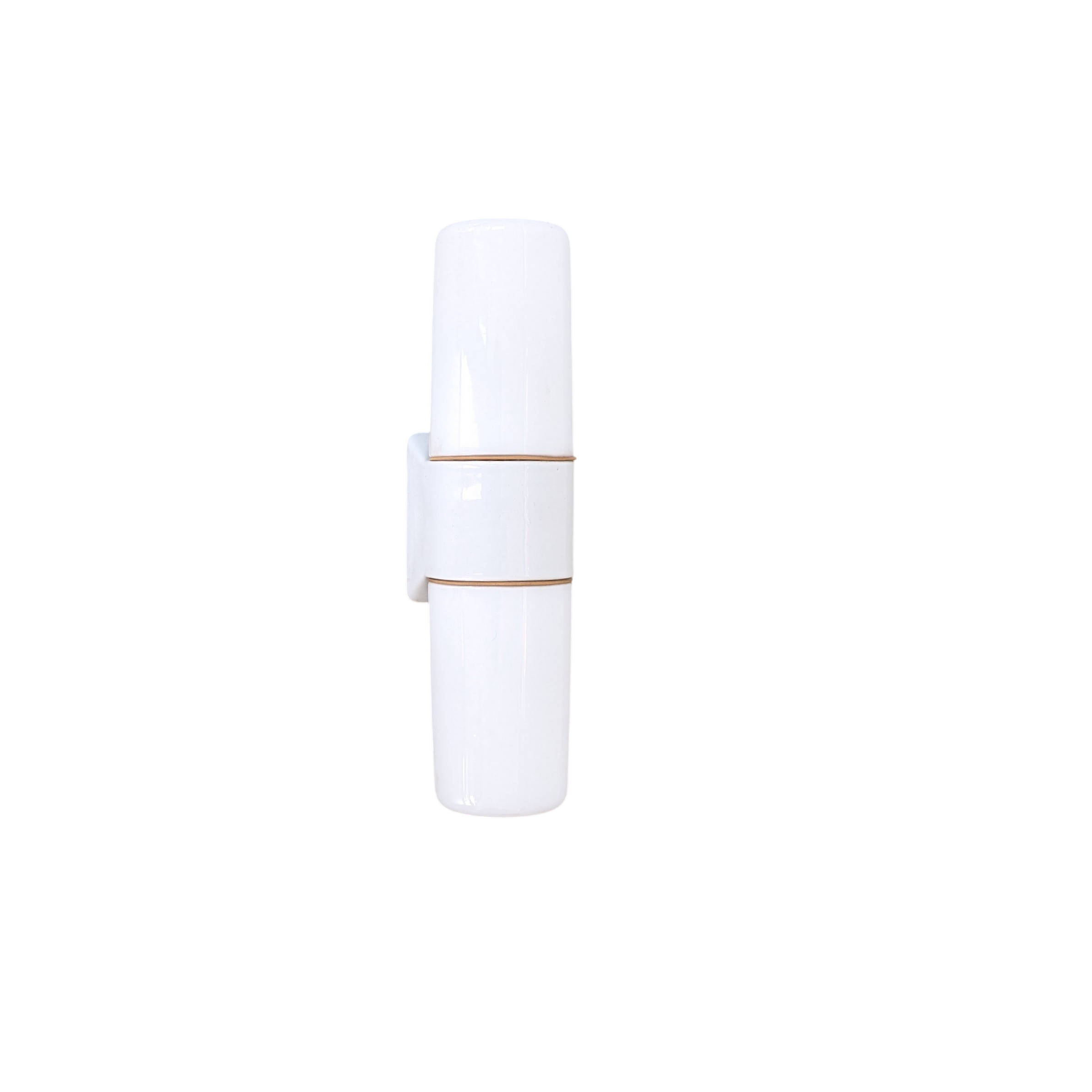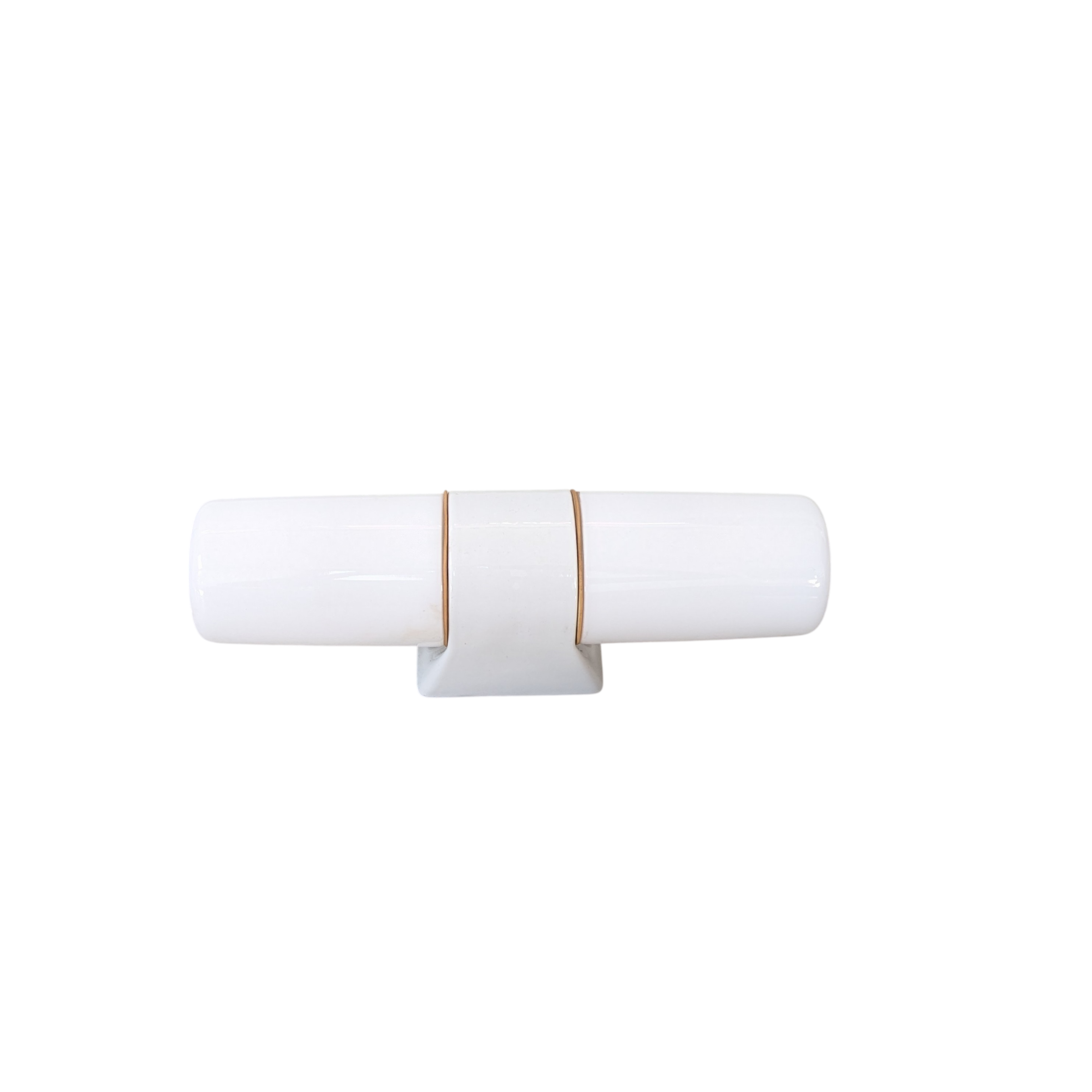 Witte keramische/porseleinen houder met een 2 opaal glazen kappen. Vintage lamp in de geest van het Bauhaus, ontwerp van Wilhelm Wagenfeld voor de Duitse fabrikant Lindner&co Bamberg. Deze lampen werden in de jaren 50 gebruikt in badkamers en wc ruimtes boven of naast spiegels.
