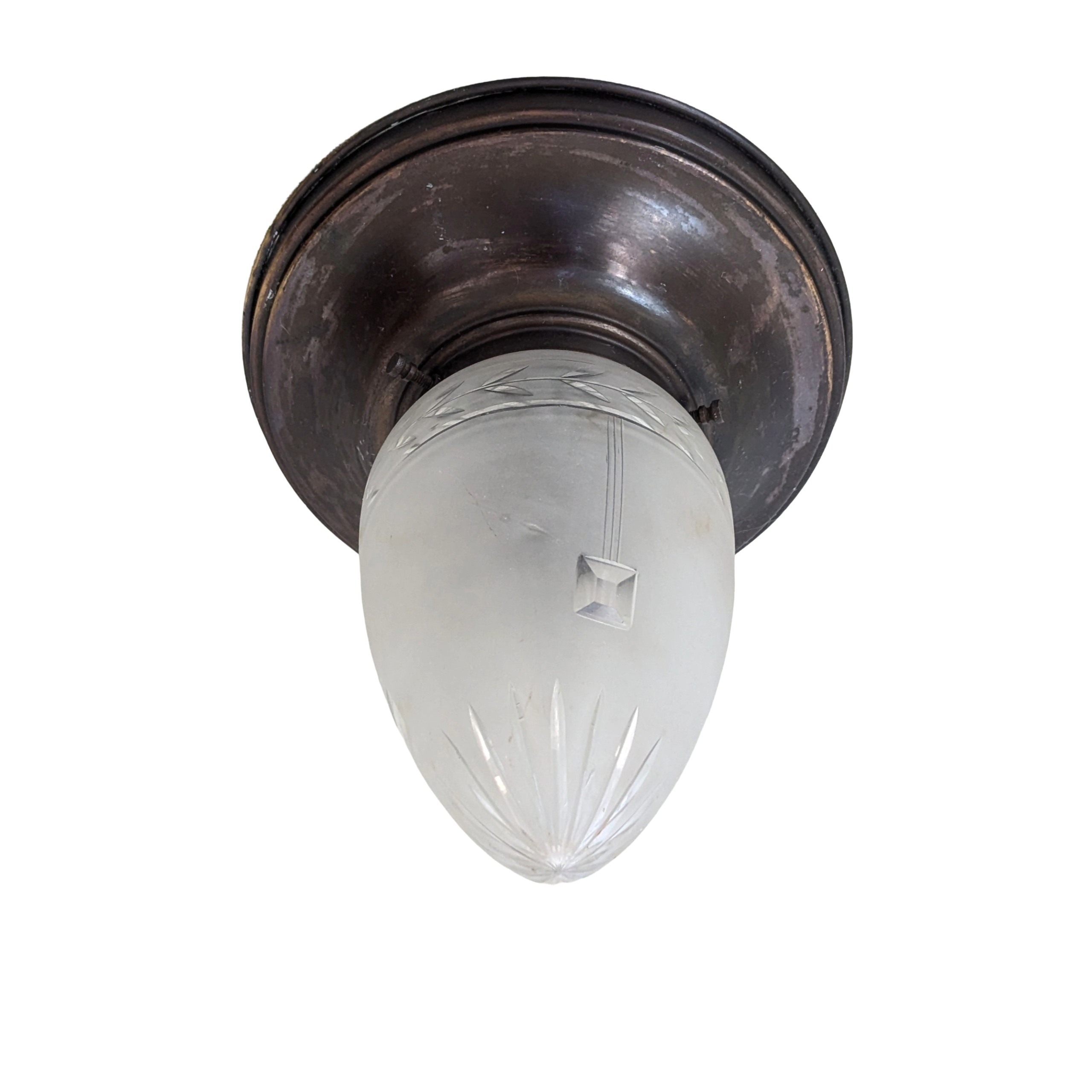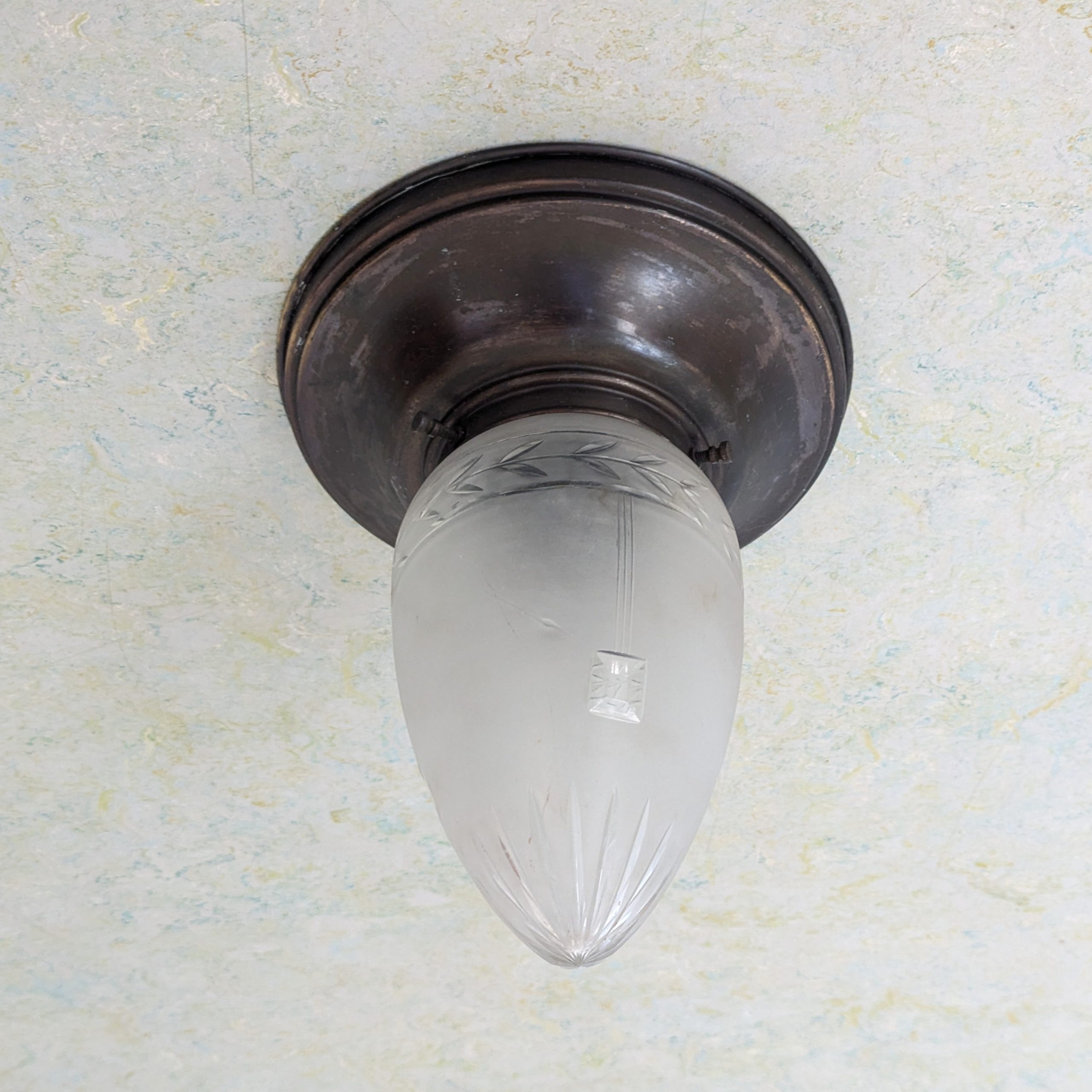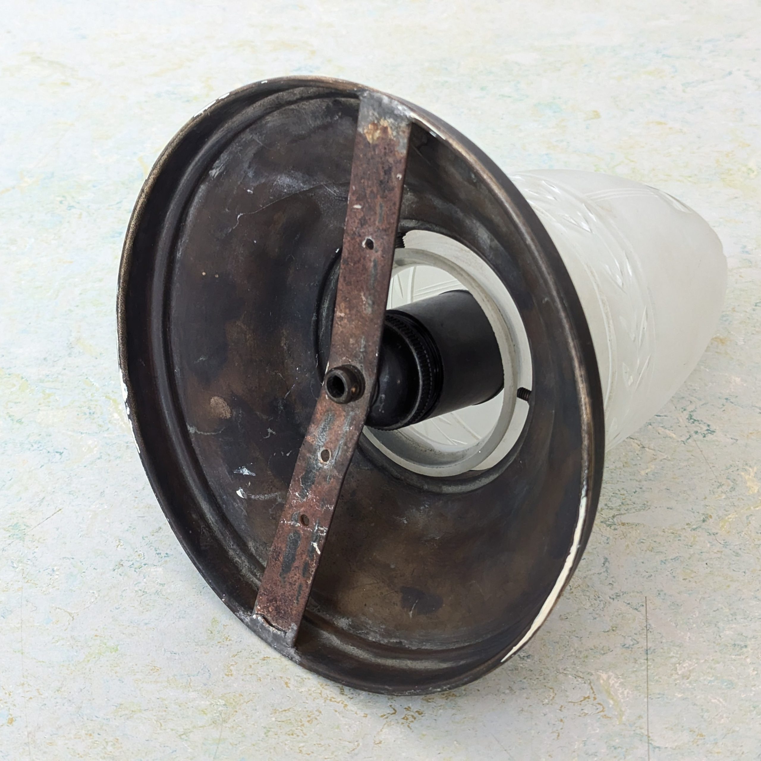 Klassieke plafondlamp uit de jaren 20, geslepen glas en een rood koperen houder. In een goede staat en werkend.