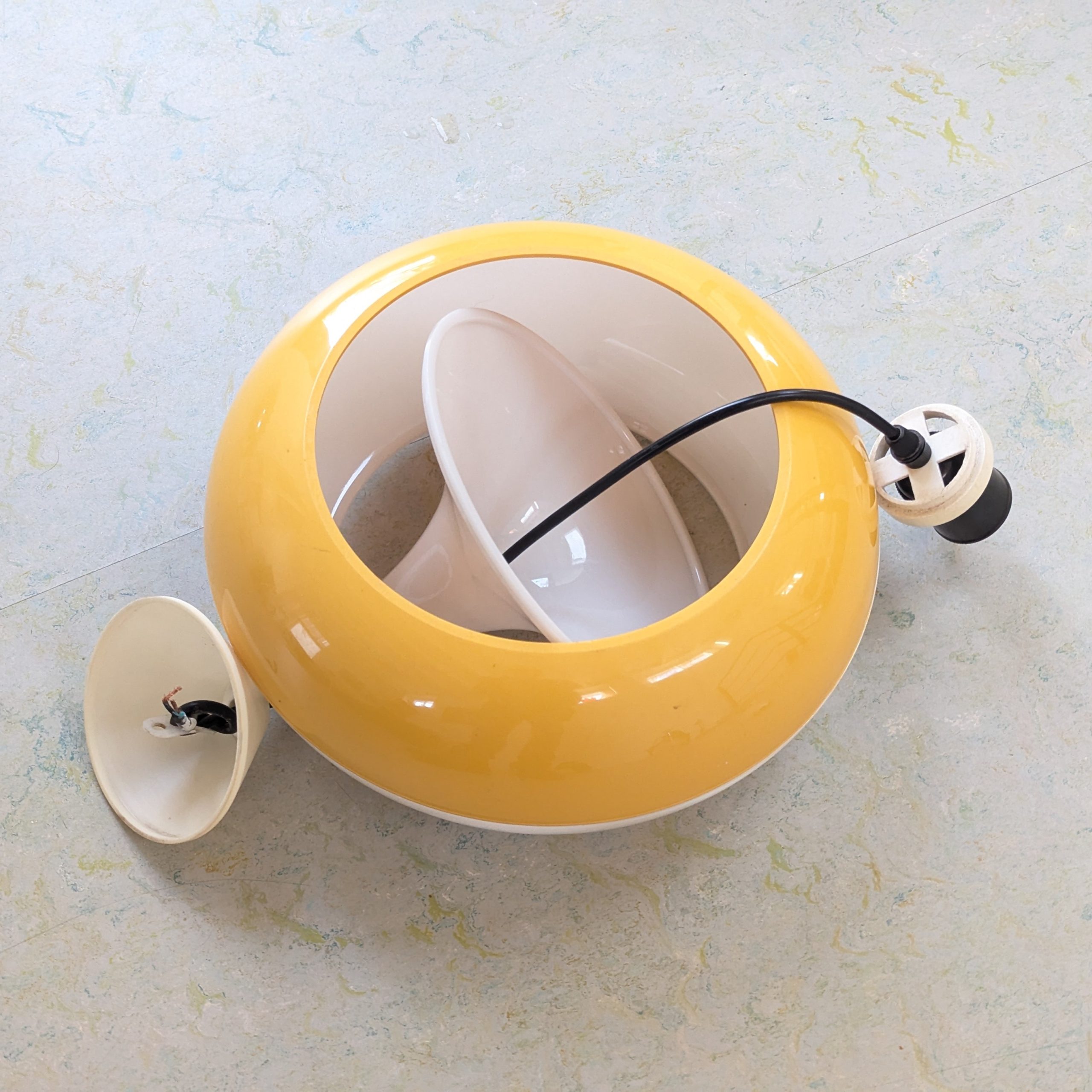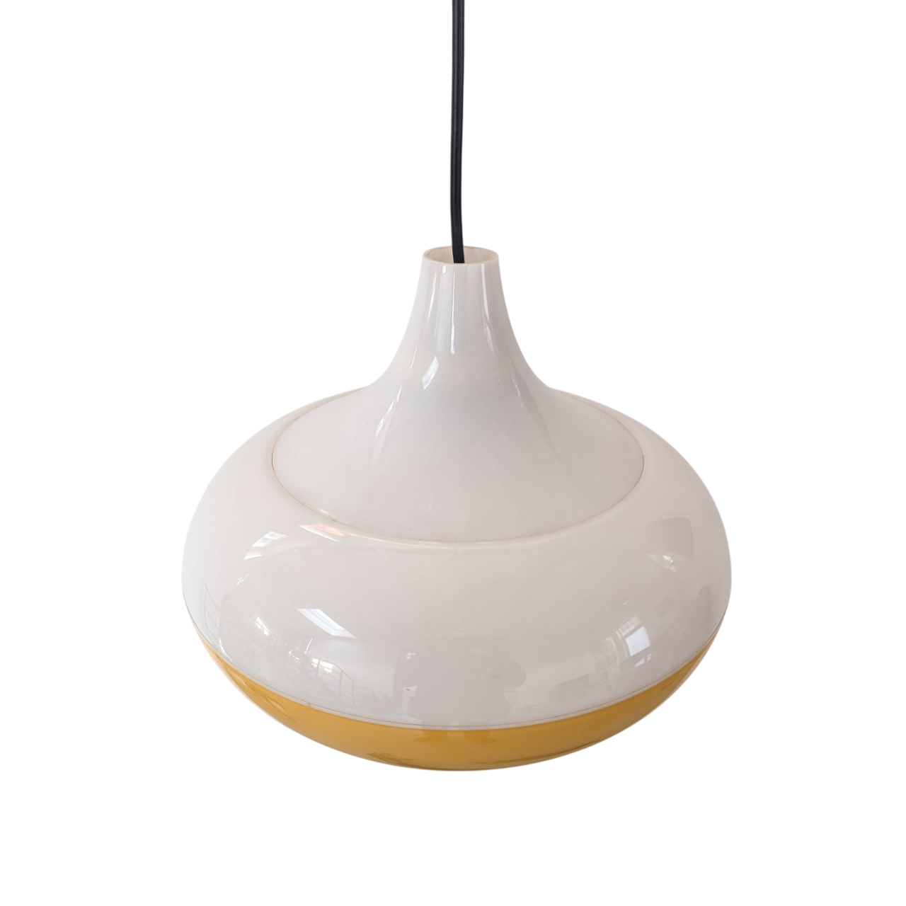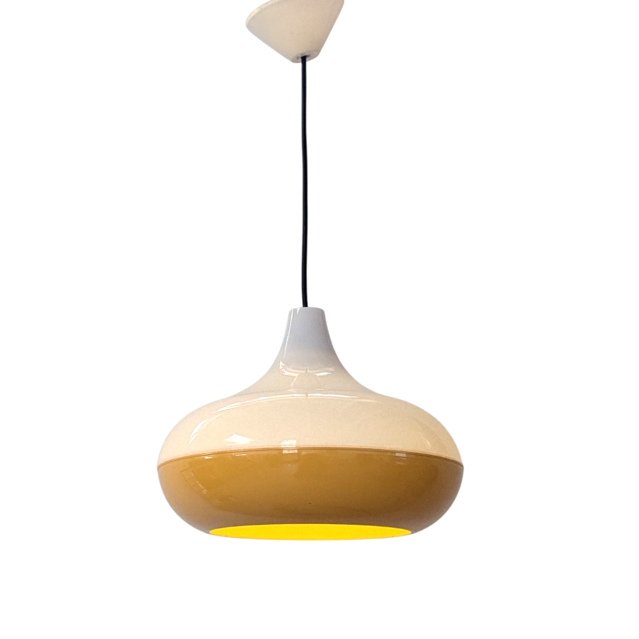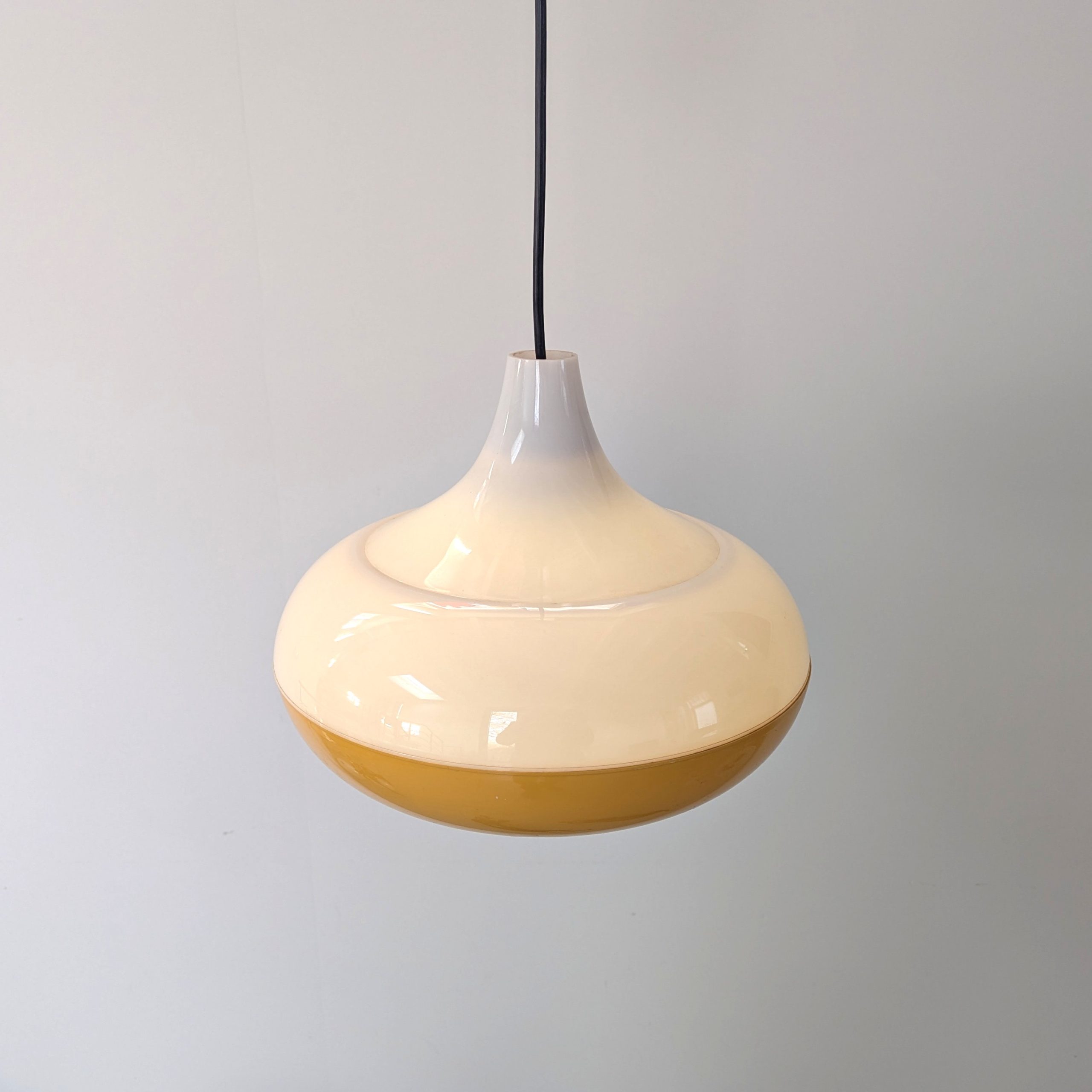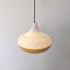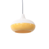 Vintage geel en witte hanglamp van kunststof. De lamp is UFO-vormig en komt uit de jaren ’60. Space Age. Waarschijnlijk een ontwerp van Massive, België.