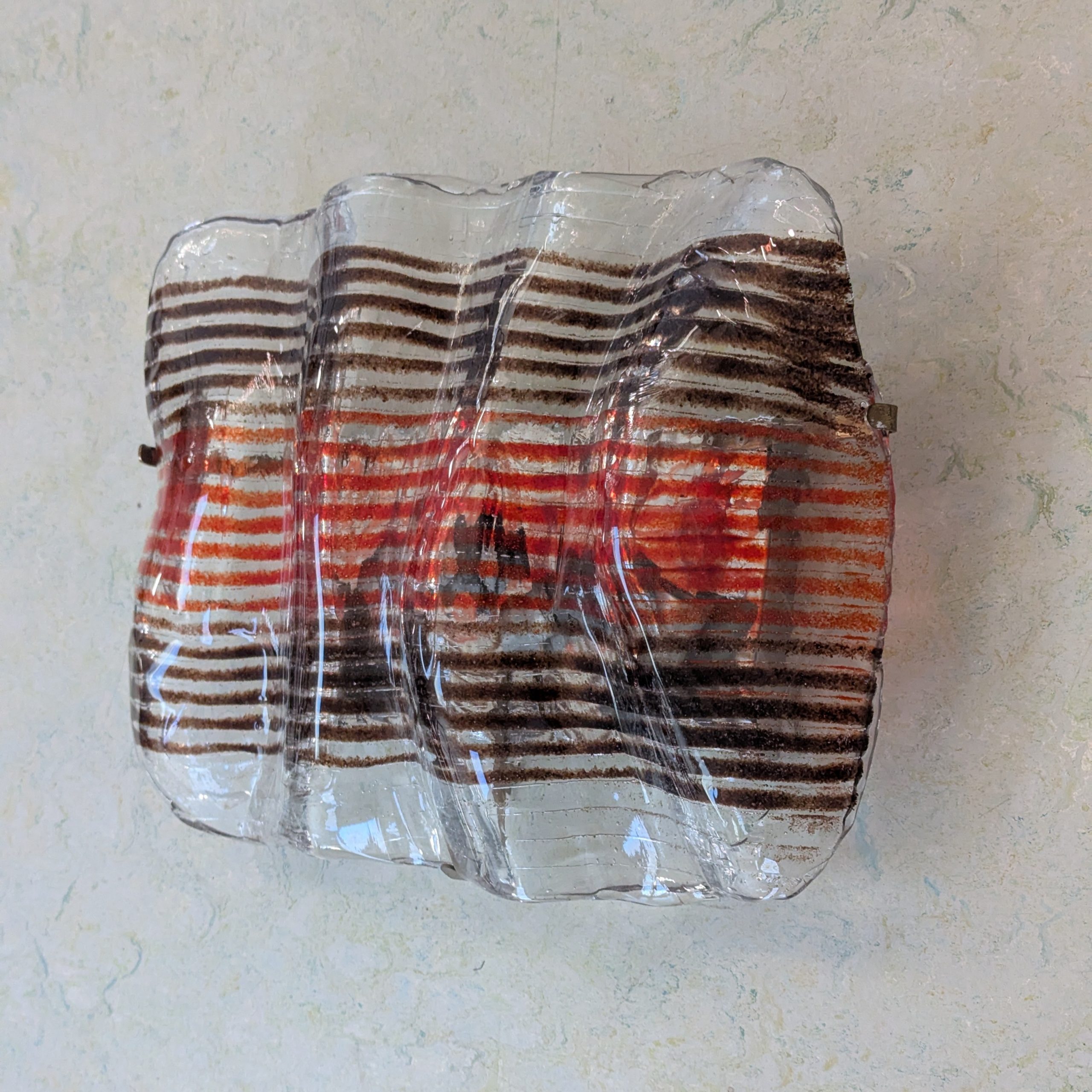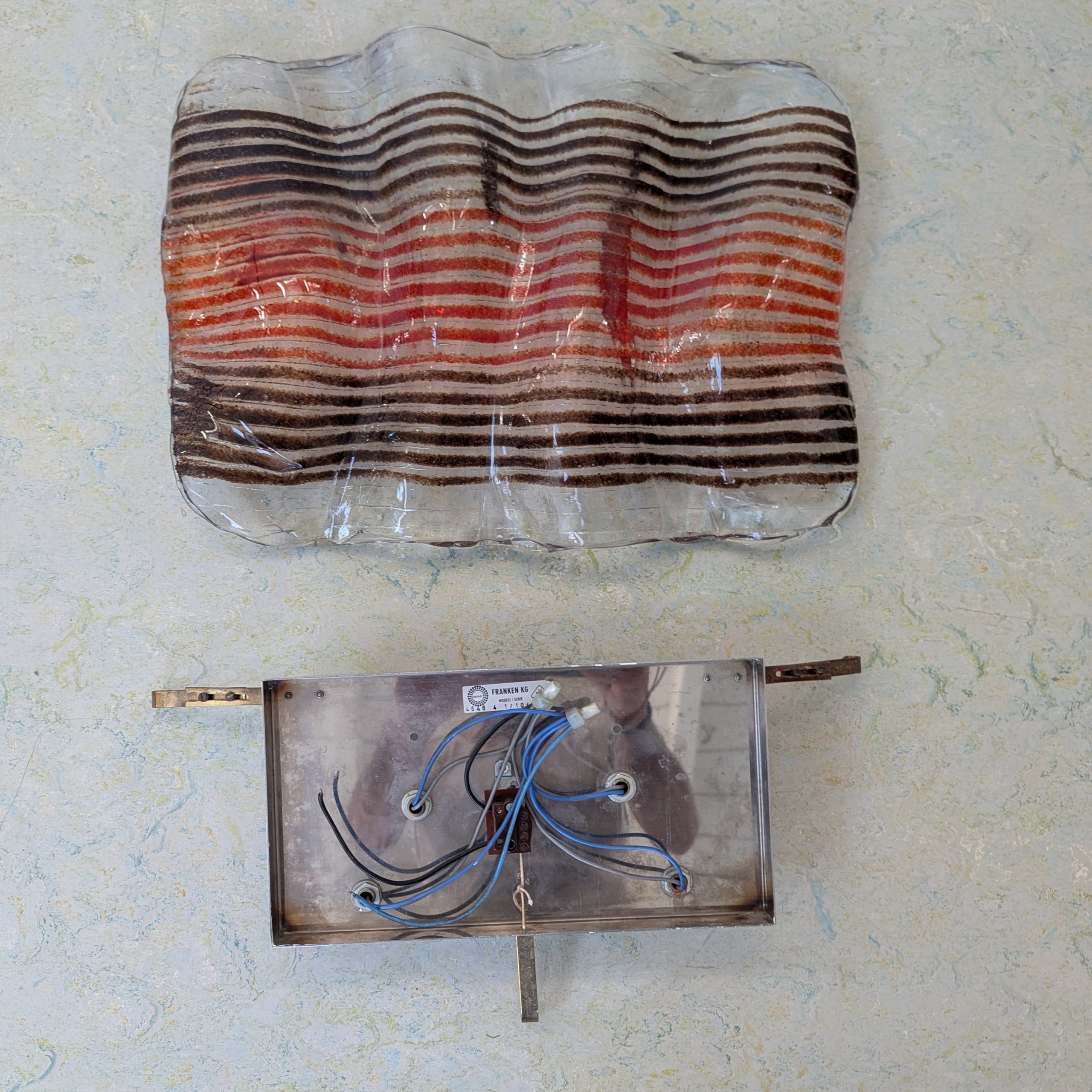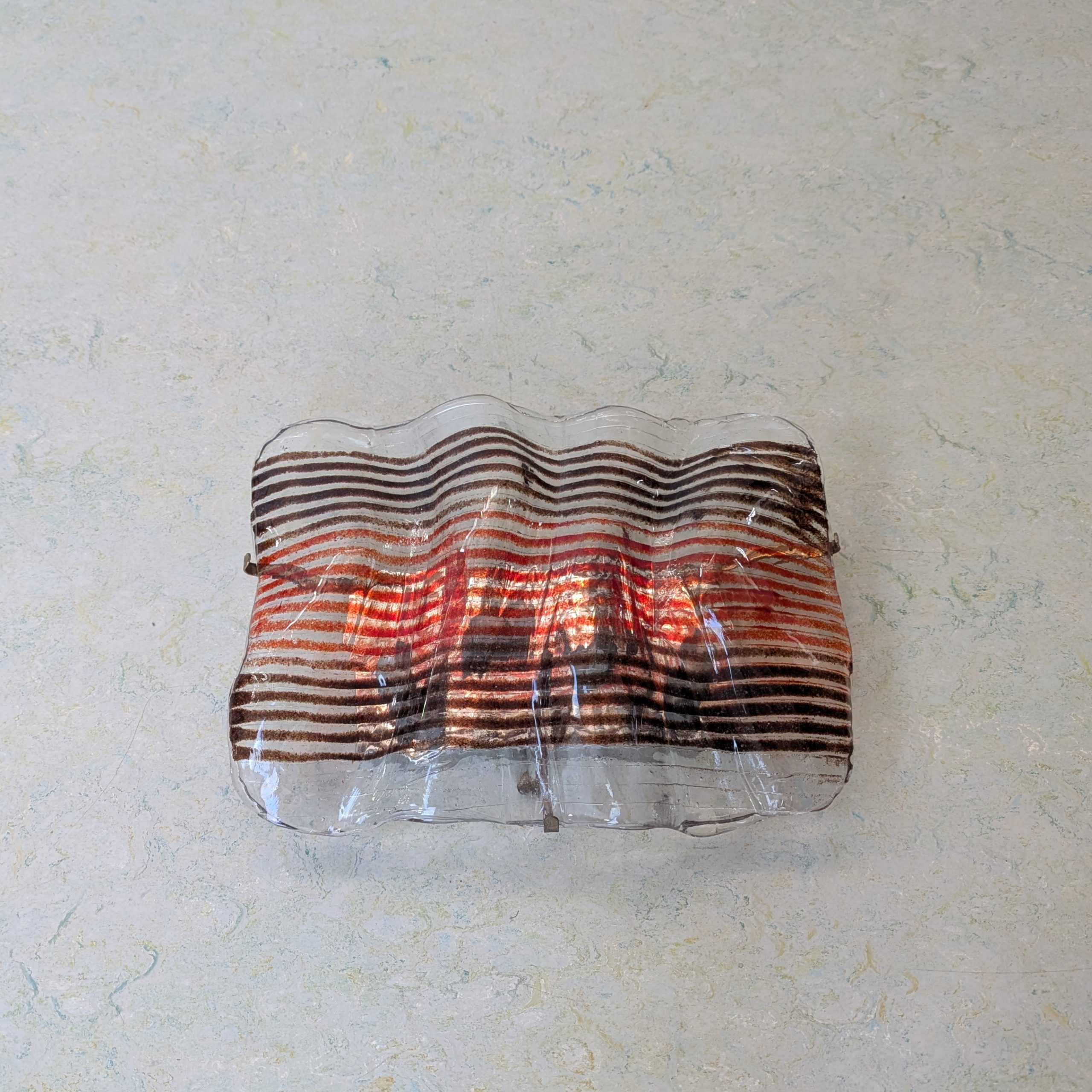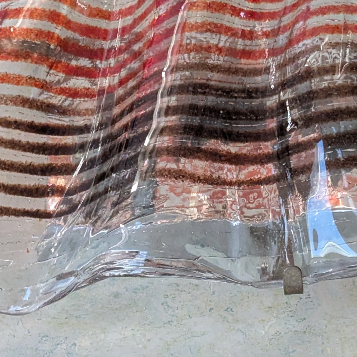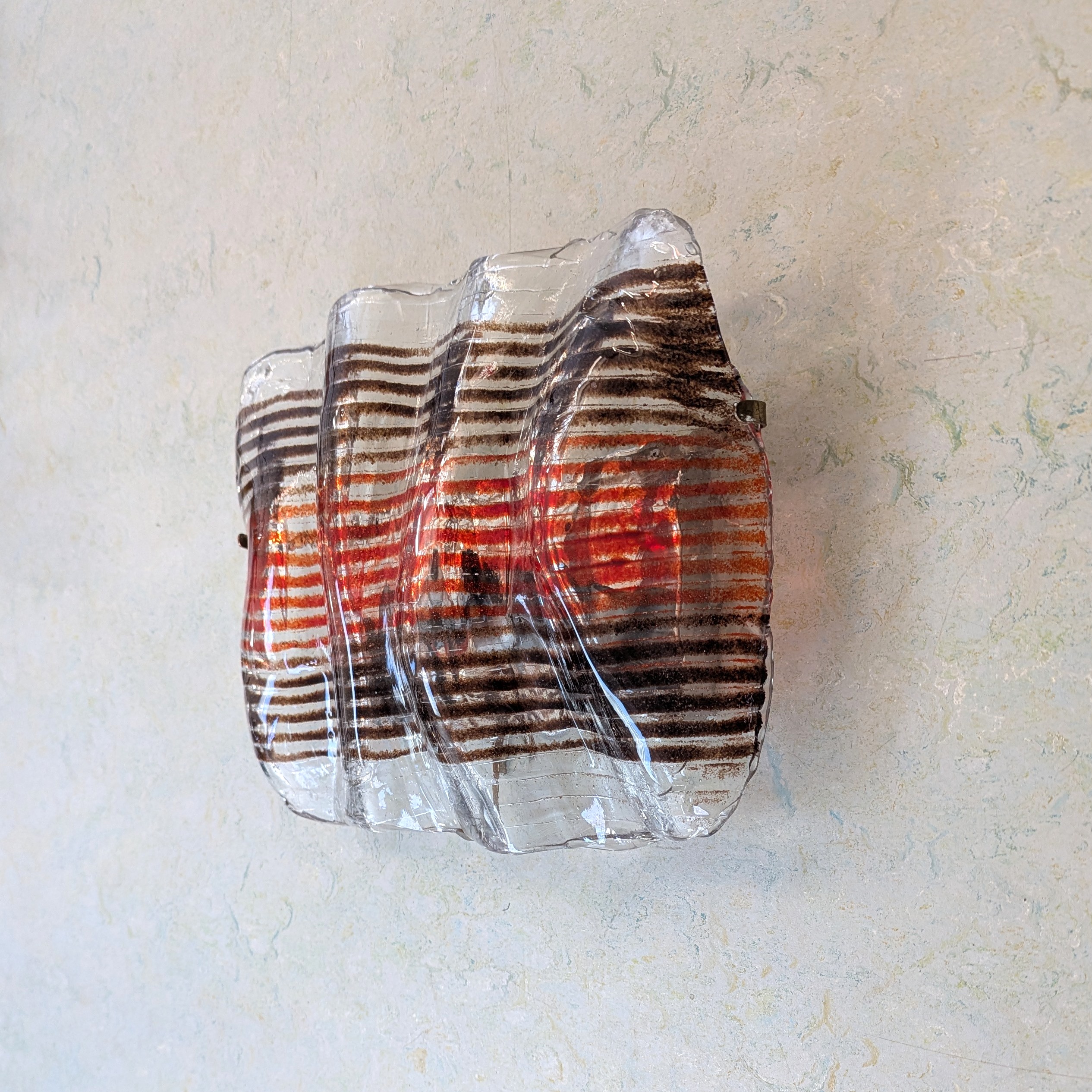 Wandlamp, gegoten glas, rode en naar donker geleurde horizontale strepen. Lamp bestaat uit 1 meermaals gebogen glasstuk, golvend model. Ontworpen door JT Kalmar voor Kalmar Franken KG, Oostenrijk jaren 60. Geeft een prachtig lichteffect. Van hoge kwaliteit, in zeer goede originele staat, metalen vernikkelde houder, koordje/trekschakelaar. Gemerkt met Kalmar sticker.