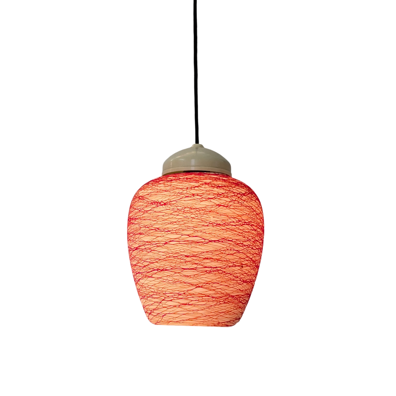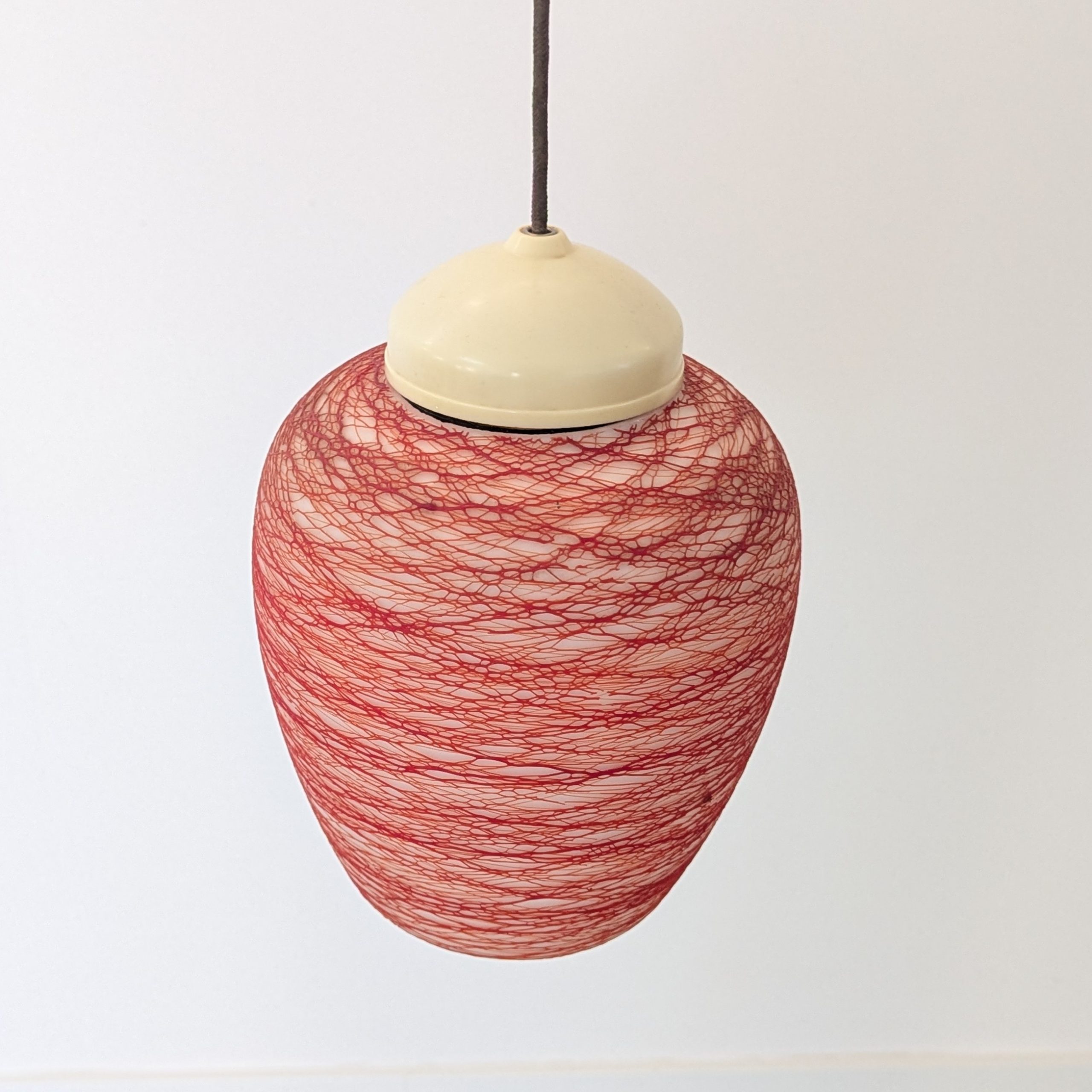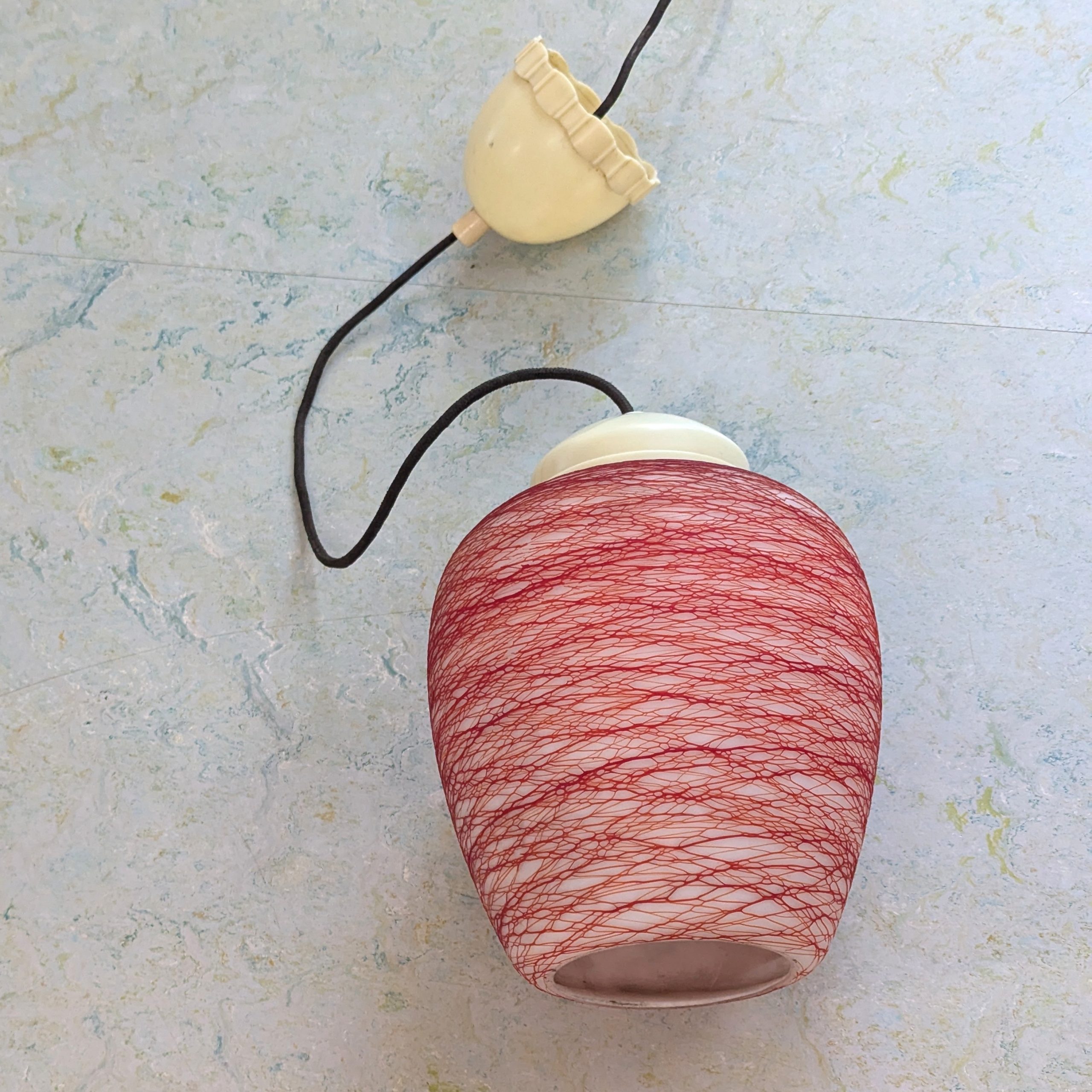Aparte jaren 50 hanglamp, glazen kap met rode glas draden, wit crème bakelieten onderdelen, in originele goede staat en werkend. Waarschijnlijk een lamp van Philips.