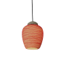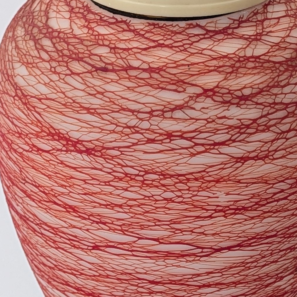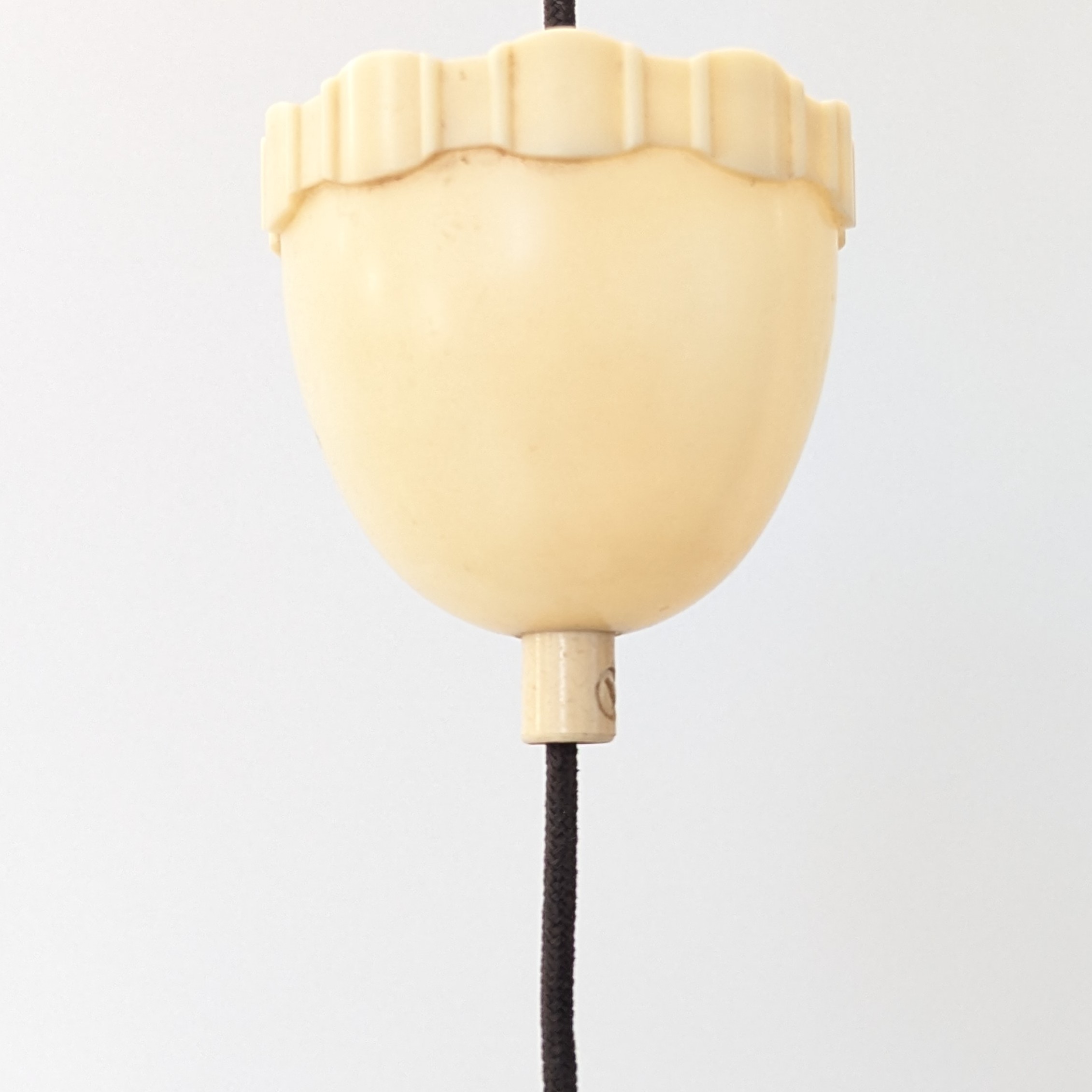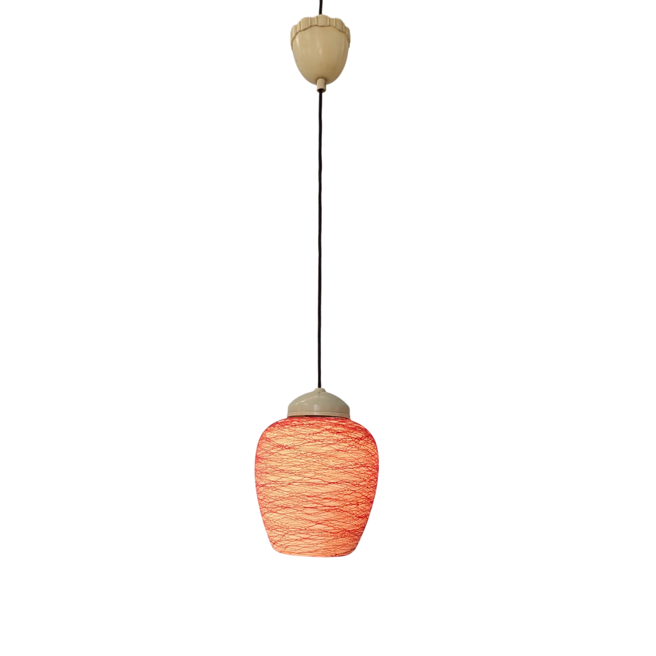 Aparte jaren 50 hanglamp, glazen kap met rode glas draden, wit crème bakelieten onderdelen, in originele goede staat en werkend. Waarschijnlijk een lamp van Philips.