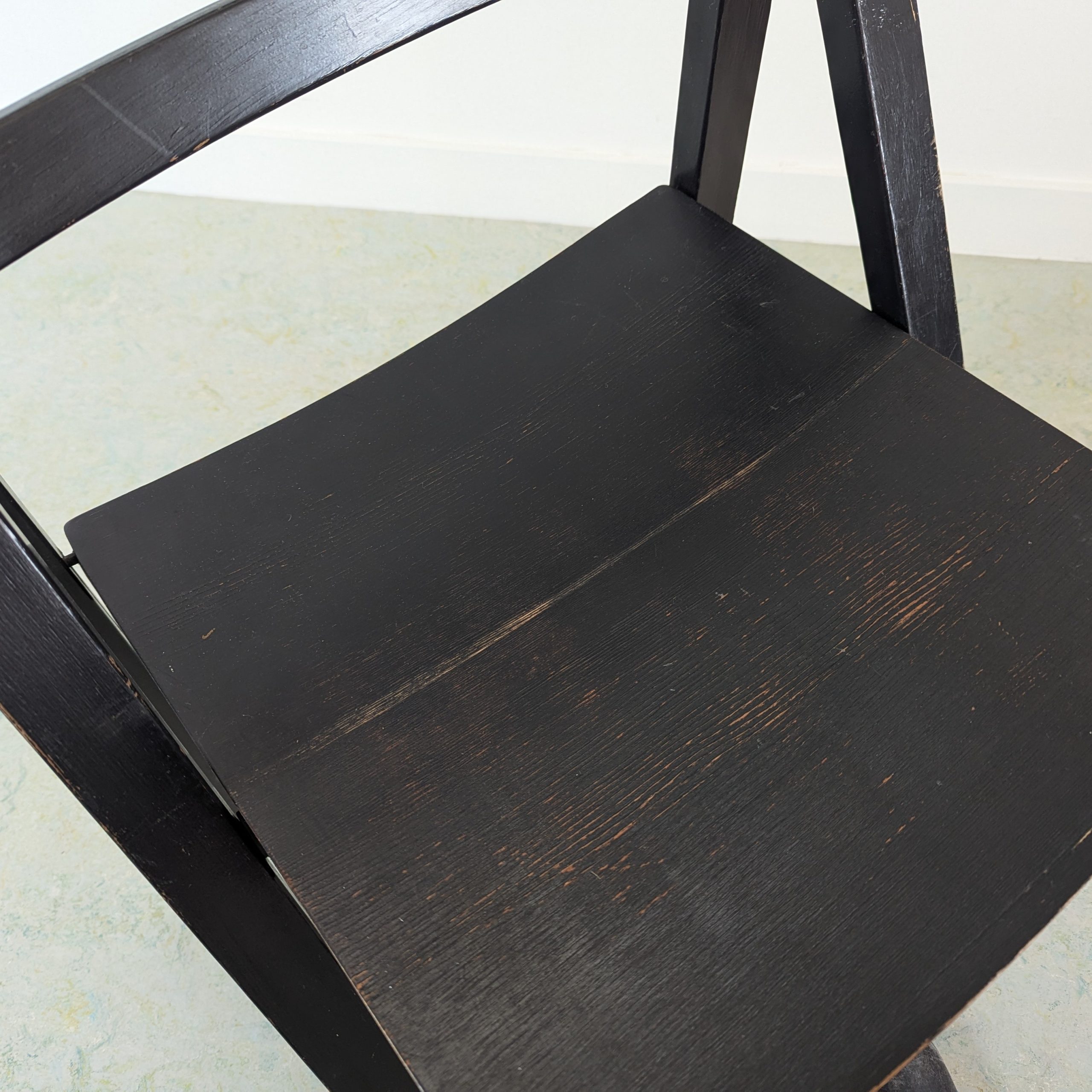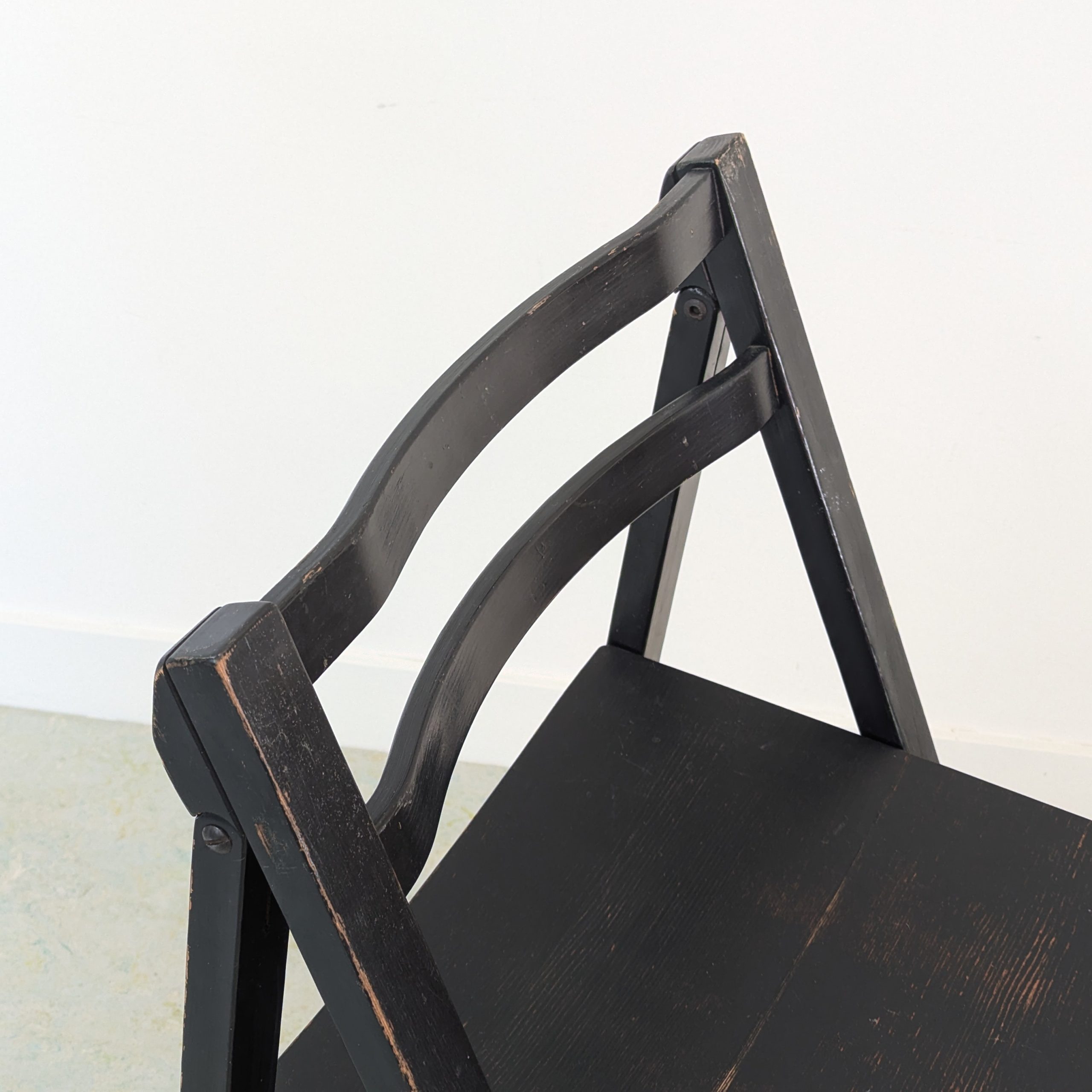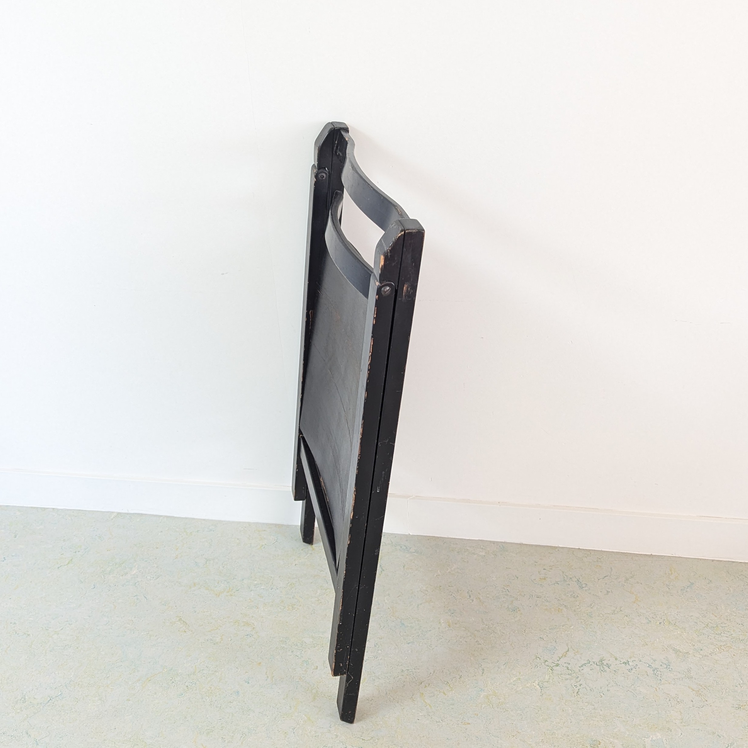 Klapstoel jaren 70, zwart gelakt hout, stevig, weinig sporen van leeftijd en gebruik. Design en productie onbekend, waarschijnlijk onder de naam Alma geproduceerd. Mooi model.