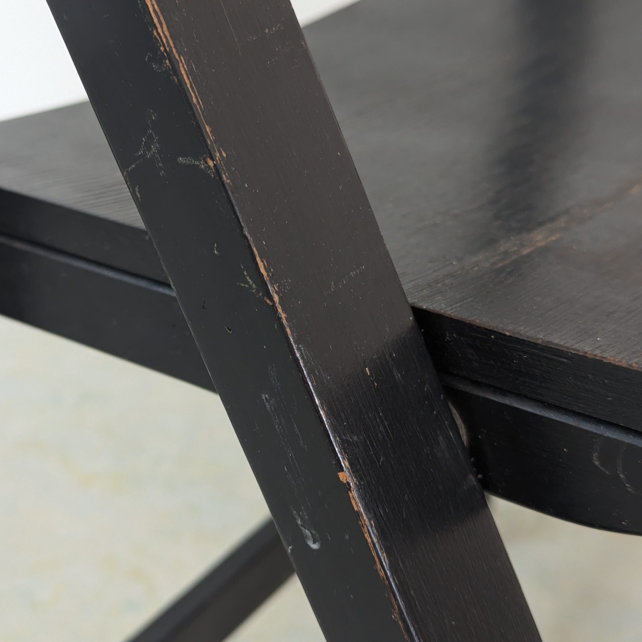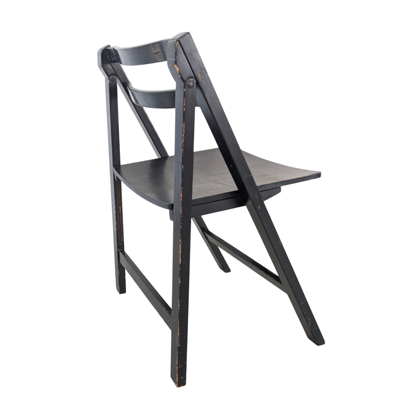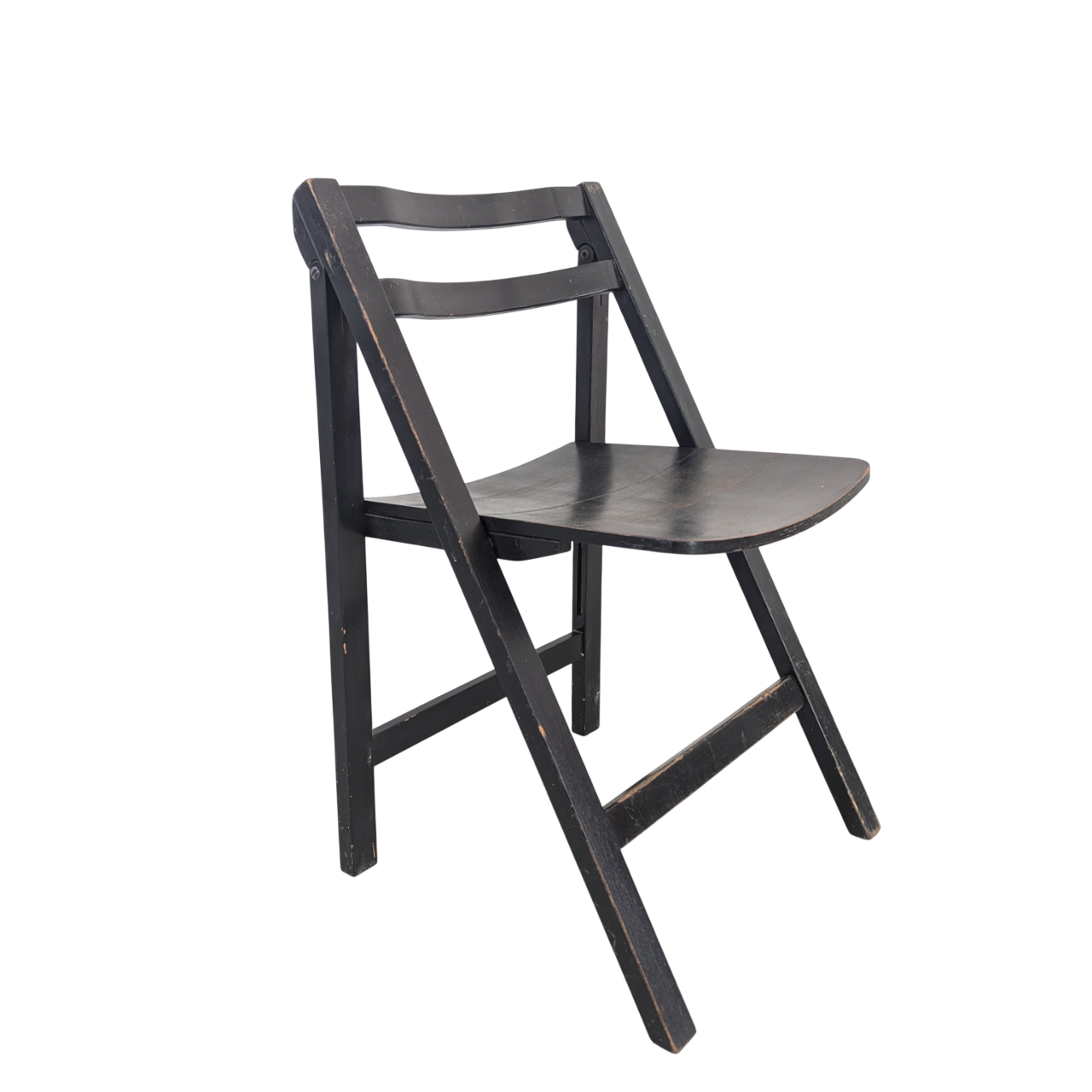 Klapstoel jaren 70, zwart gelakt hout, stevig, weinig sporen van leeftijd en gebruik. Design en productie onbekend, waarschijnlijk onder de naam Alma geproduceerd. Mooi model.