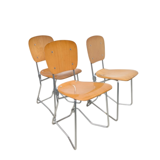 Vintage Alu flex houten Zwitserse stapelbare zitstoelen/conferentiestoelen, 5 stuks. Design Armin Wirth. Gemerkt met het Aluflex-label aan de achterkant. De zittingen van de stoelen zijn inklapbaar, waardoor ze zeer gemakkelijk op te bergen zijn. Aluminium frame en berkenhouten zittingen en rugleuningen, verbindingen zijn niet bij alle stoelen hetzelfde, zie de verschillende verbindingen op de detailfoto’s. Prijs per stuk.