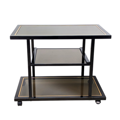 Vintage bar trolley, zwartgelakt metaal, afgewerkt met 23 karaat goud. Bovenblad en het middelste deel dik getint spiegelend glas, bladonderzijde getint doorzichtig. Ontwerp van Roger van Hevel voor Belgo Chrom, België, jaren 1970. Tijdloos ontwerp en van hoge kwaliteit. Functioneel, het middelste deel kan uitschuiven. In goede staat, weinig sporen van gebruik en leeftijd. VERKOCHT