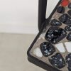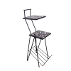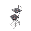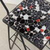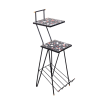 Jaren 50 plantenstandaard of rek, zwart staafijzer en 2 plateaus met een mozaïek van stenen/ kramieken steenvormen. Op één plateau wat cement verdwenen. In goede staat.