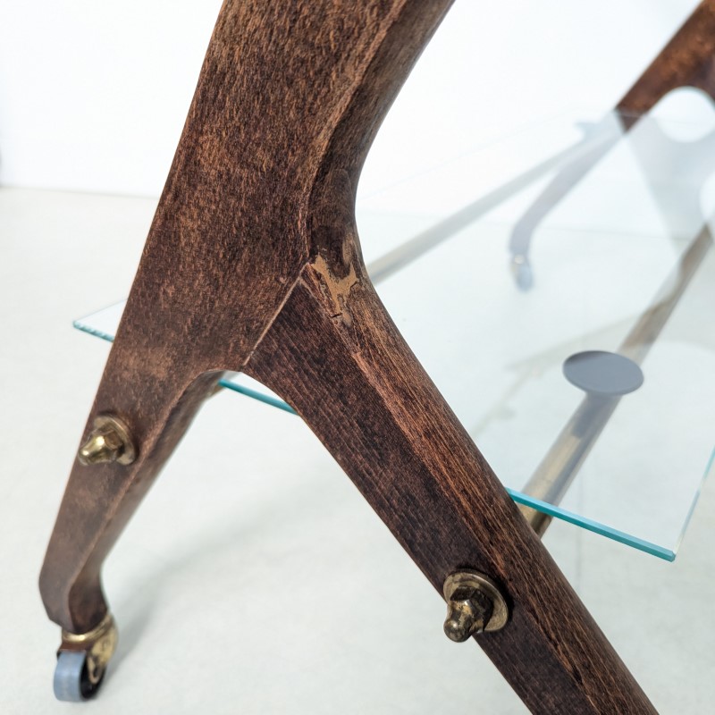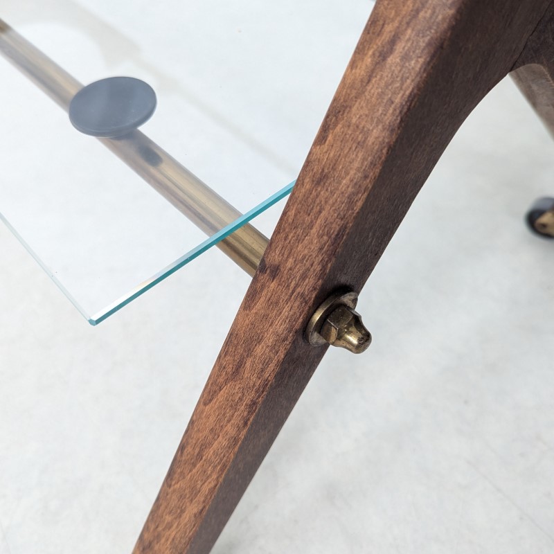 Jaren 50 bijzettafel/trolley met wieltjes en glazen bladen. In een goede staat, een nette reparatie bij een verbinding, weinig sporen van gebruik.