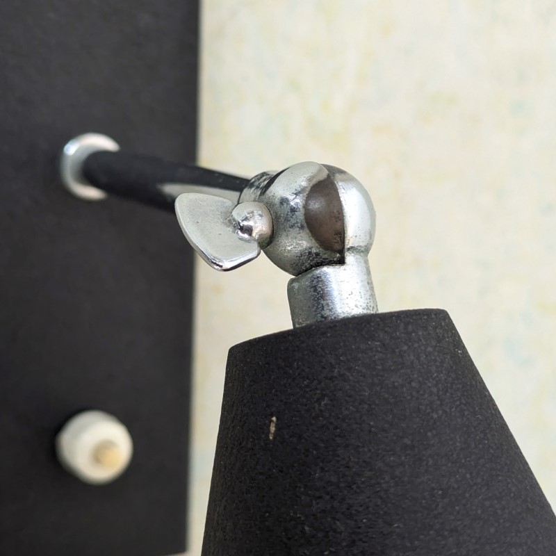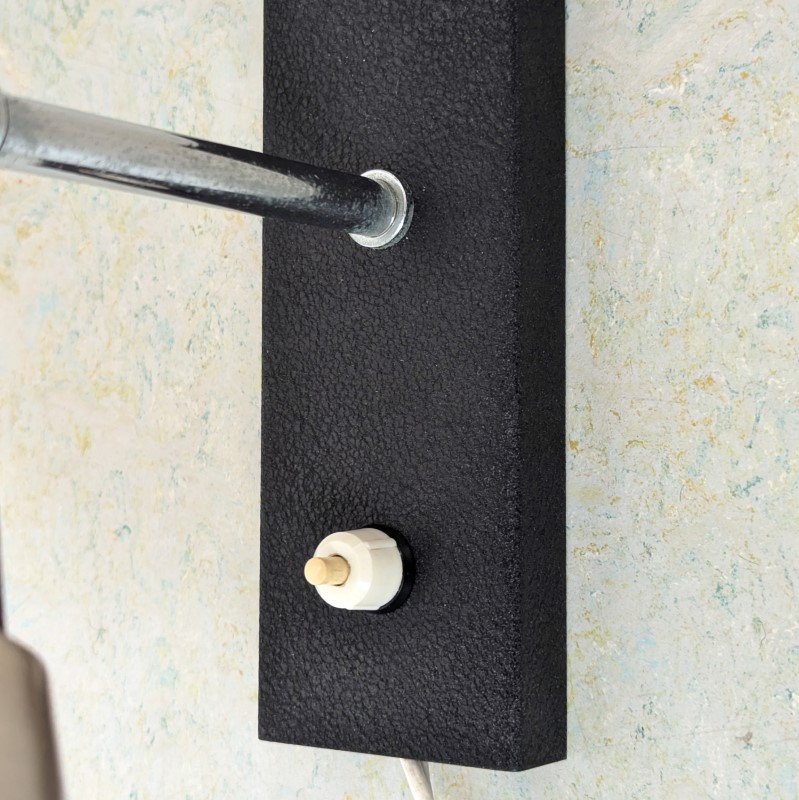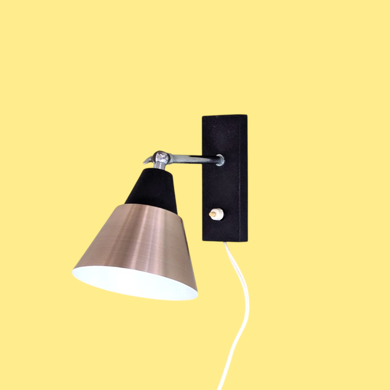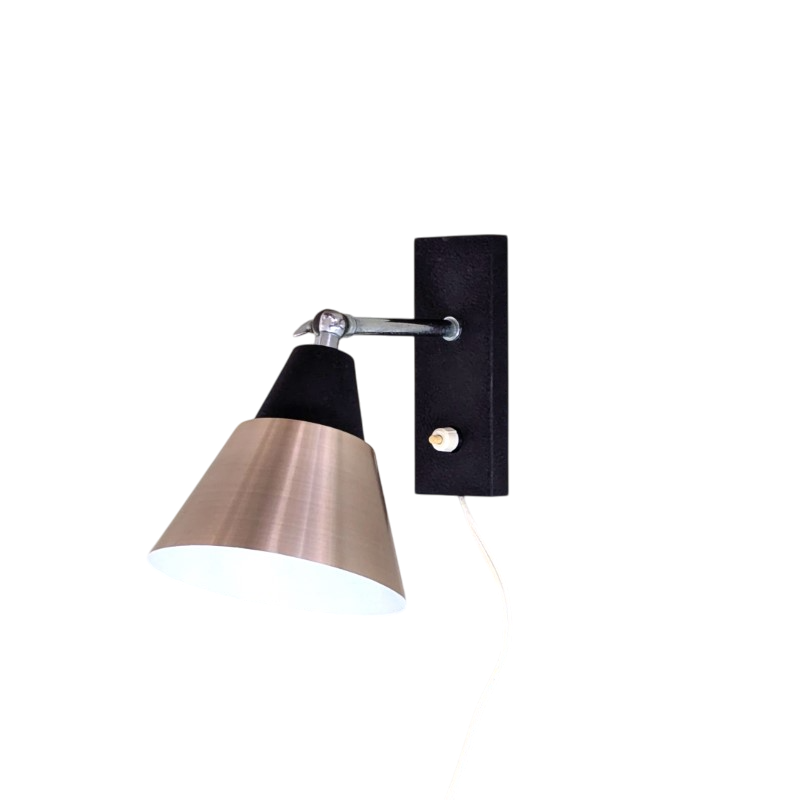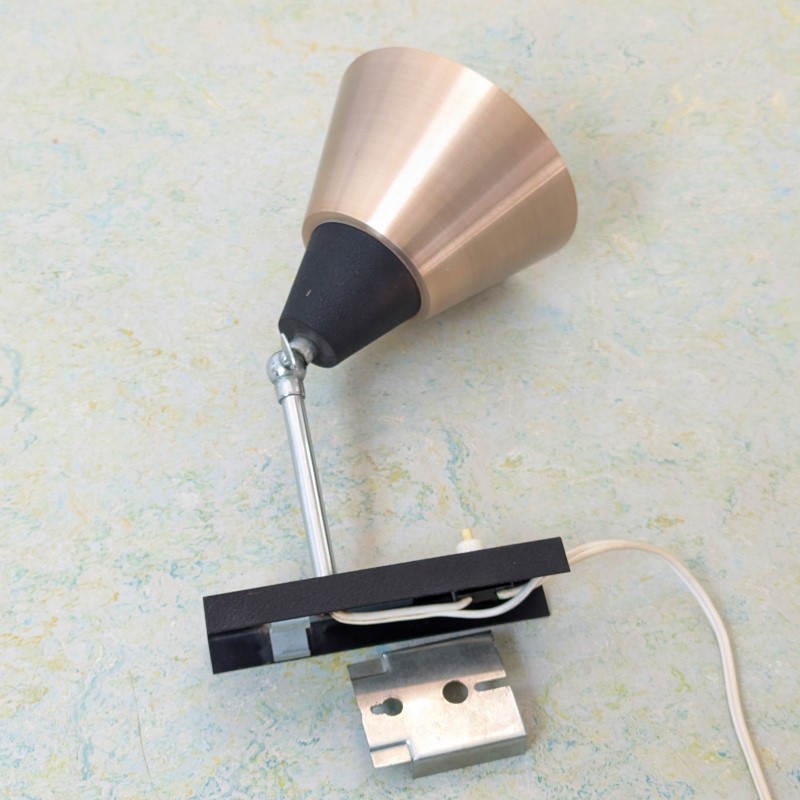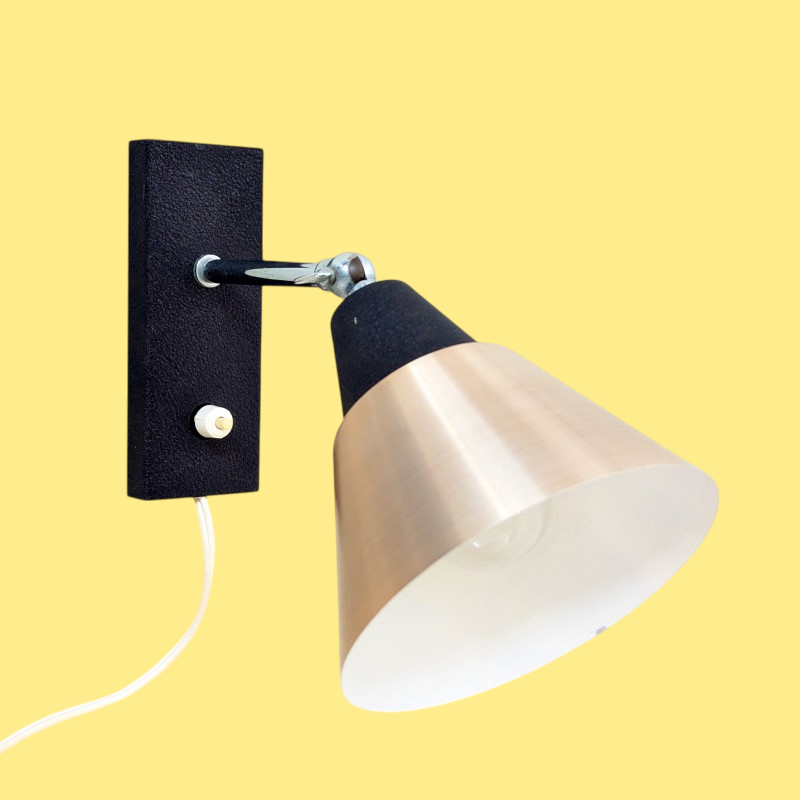 Wandlampje, waarschijnlijk van het merk Hala, uitvoering gekleurd aluminium en zwart metaal. In goede vintage staat, klein tipje aan de rand van het kapje. In originele kleuren en wandhouder met snoer.