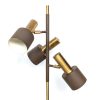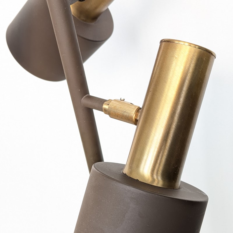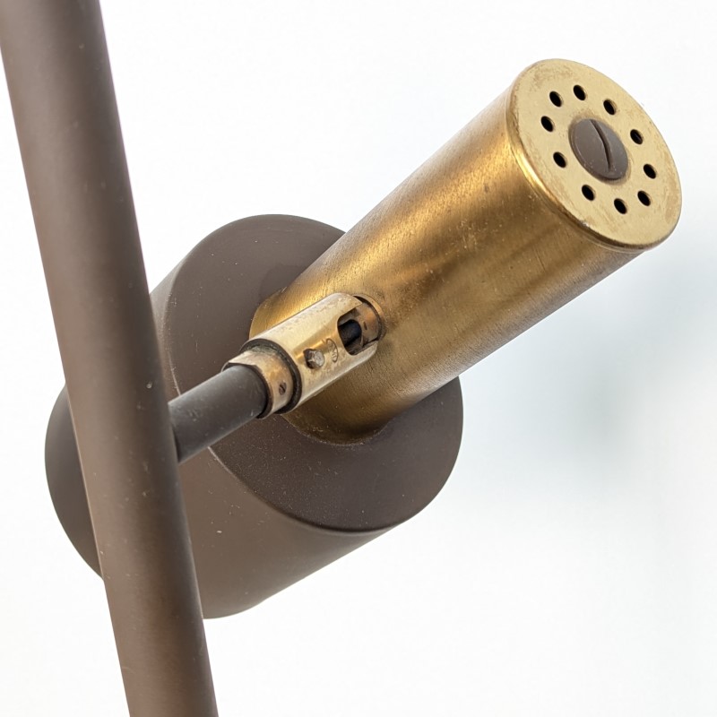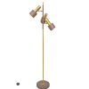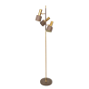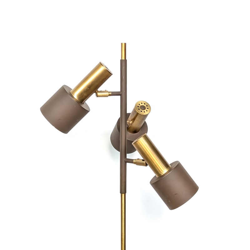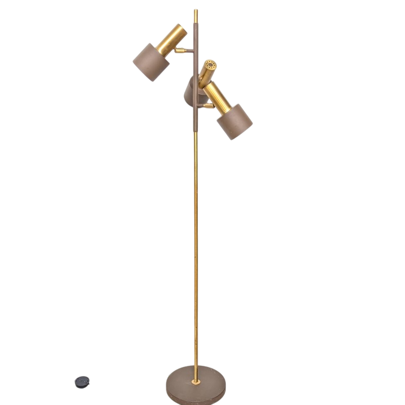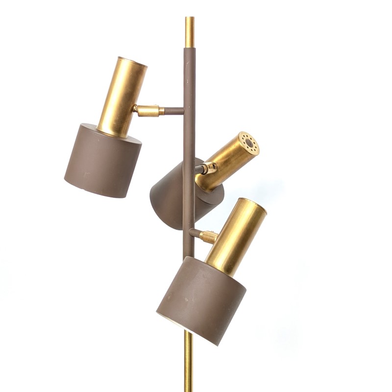 Staande lamp met drie bruin en messing gekleurde spots van metaal, vaste hoogte, spots draaibaar en richtbaar. De lamp verkeert in een goede vintage staat. Wordt ook toegeschreven aan OMI, Koch en Lowy. Een 4-standen voet schakelaar. VERKOCHT