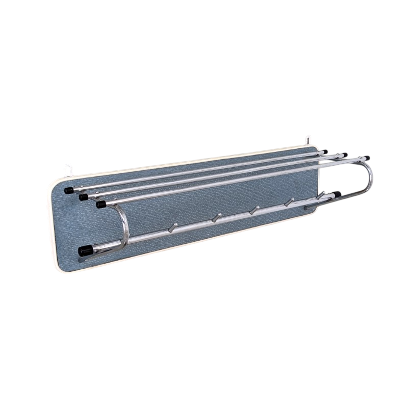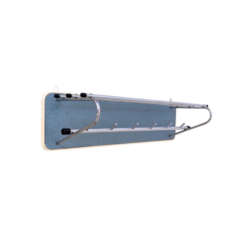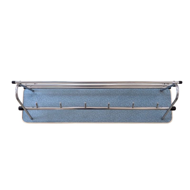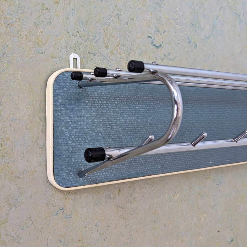 Jaren 50/60 kapstok, houten frame omtrokken met skai en een kunststoffen rand, chroom met rubberen doppen. Hoedenplank, 6 haken. In een goede staat.