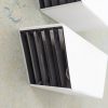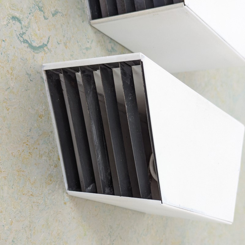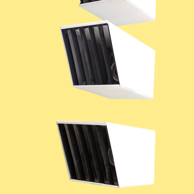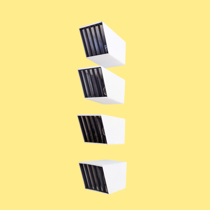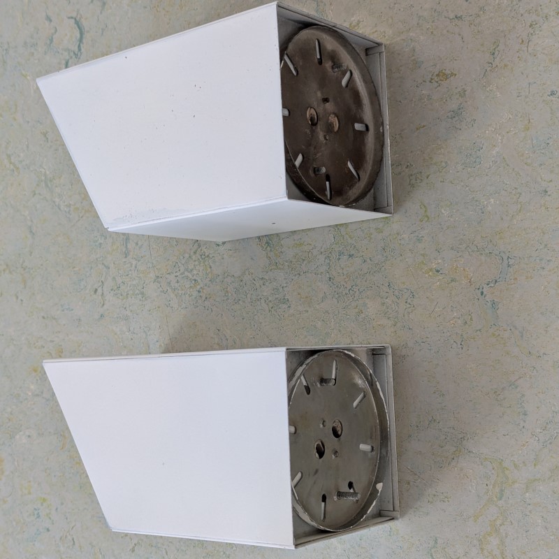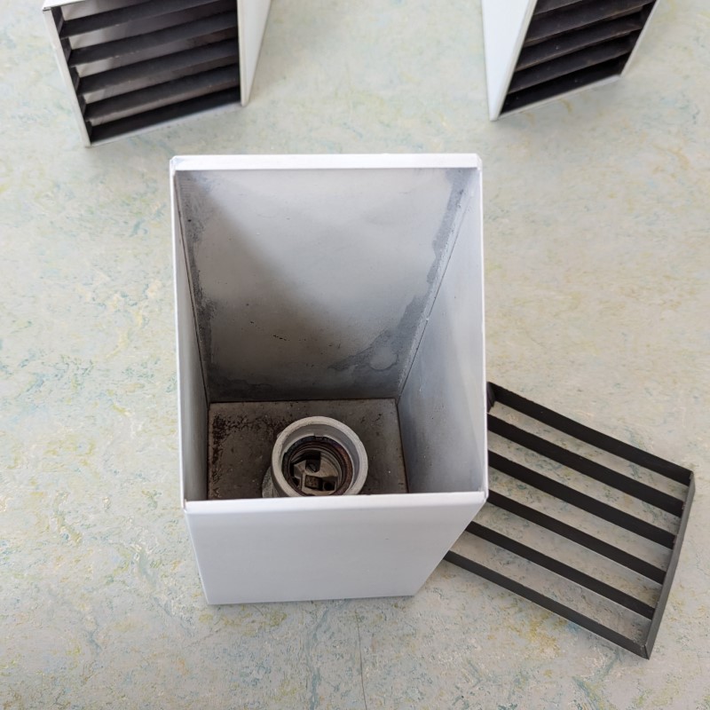 Spots van Philips Jaren 60. Vierkante modellen met rooster, schuin afgewerkt. Wit/creme en een zwarte rooster, hier daar wat leeftijd gebonden sporen, zie de foto’s. Aluminium en metaal.