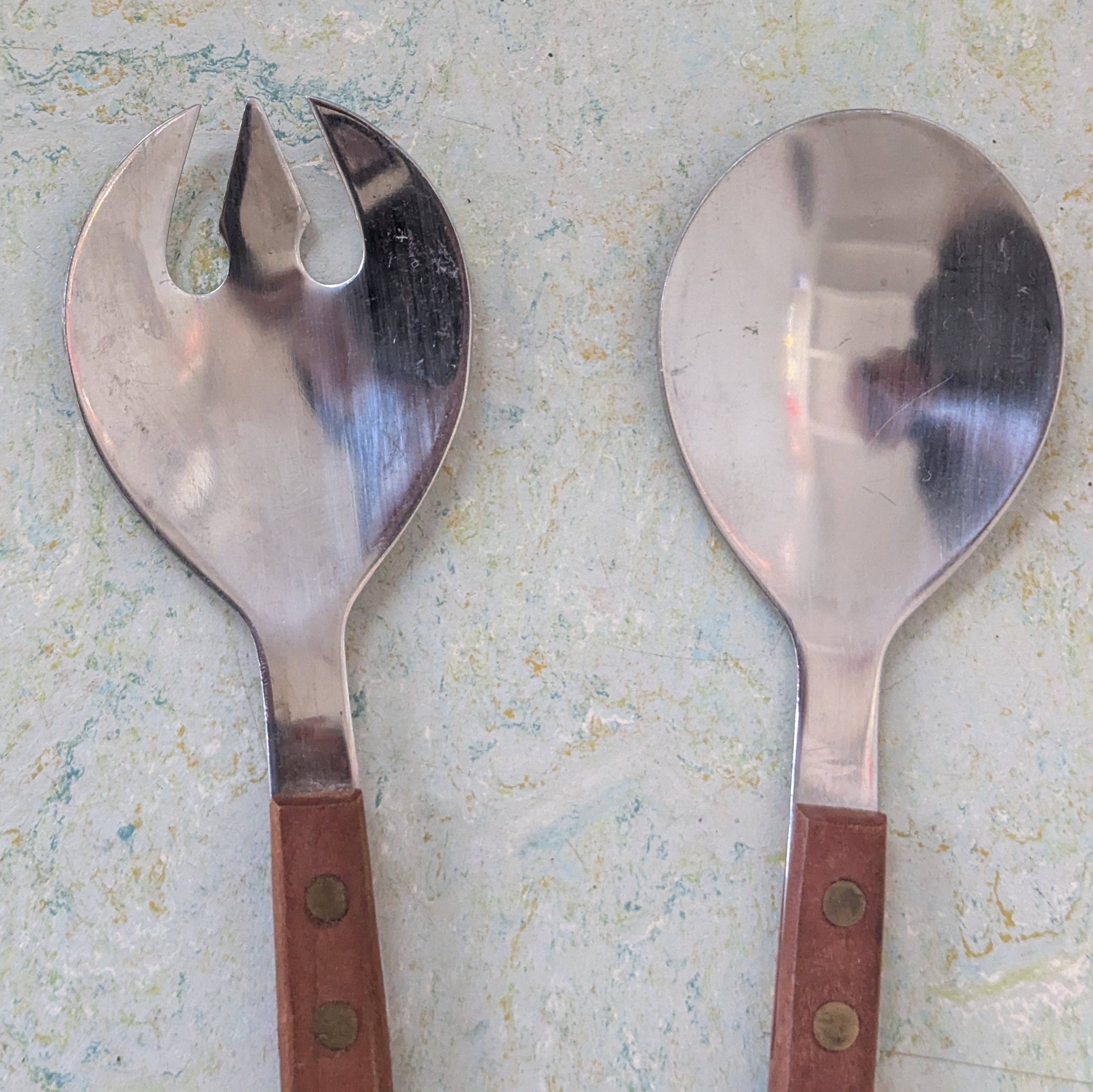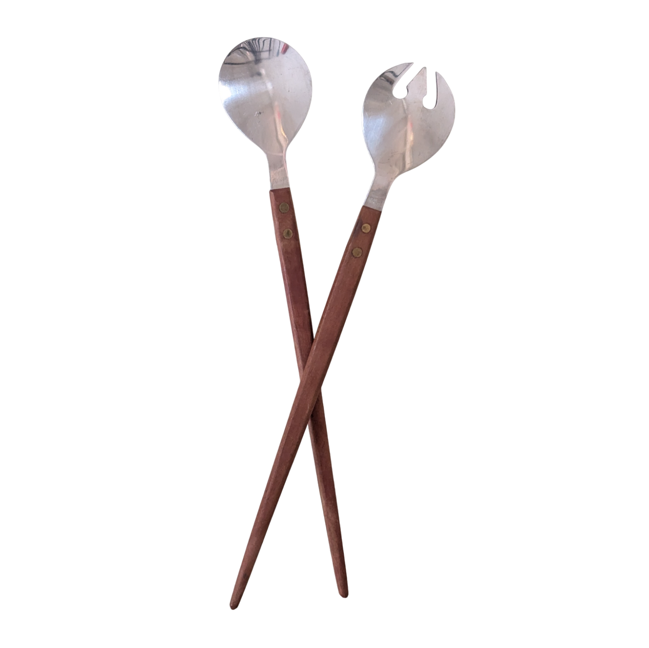 Slabestek- slacouvert, stainless steel en taps aflopend teak. Prachtige vormgeving. Jaren 60