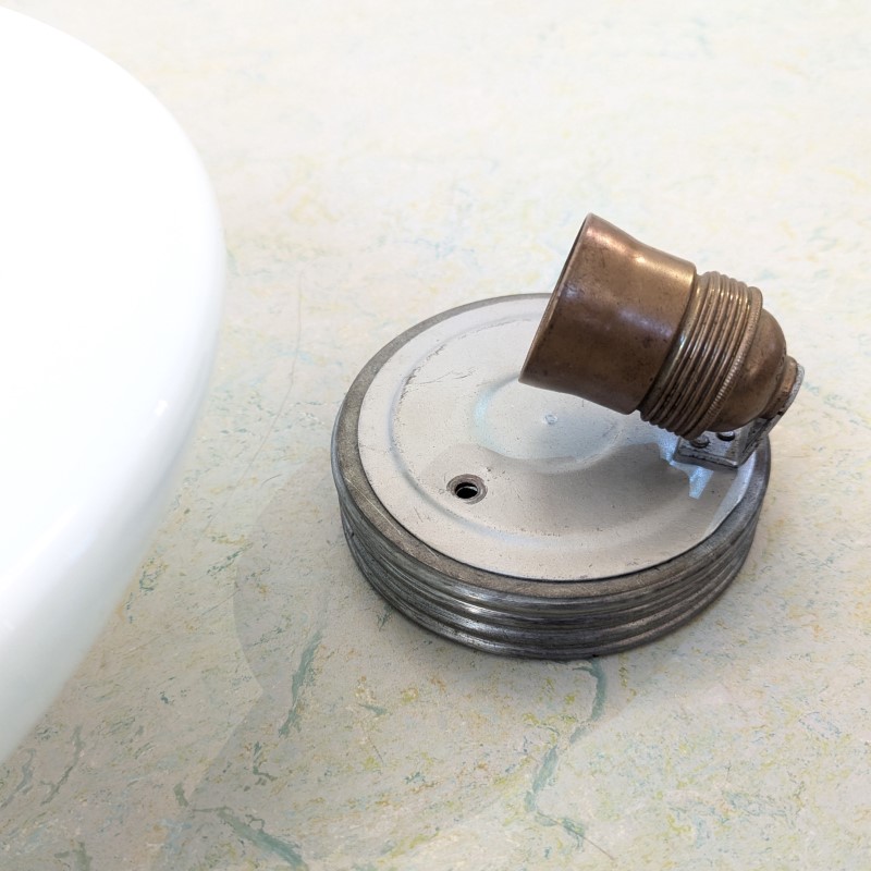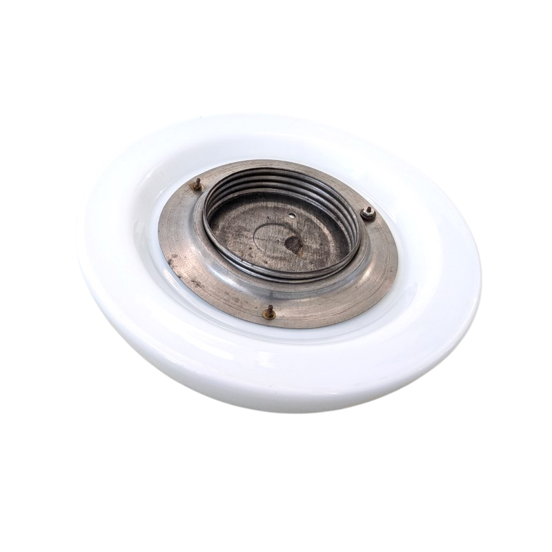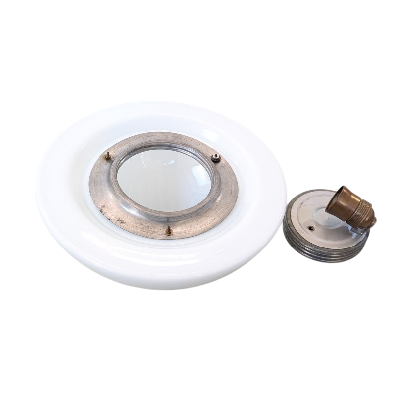 Plafondlamp Hamolite, vernikkelde messing plafondplaat met schroefdraad, wit opaal glazen kap, ontwerp Frans Hamers, Amsterdam ca.1932. Niet gemerkt. In goede staat.