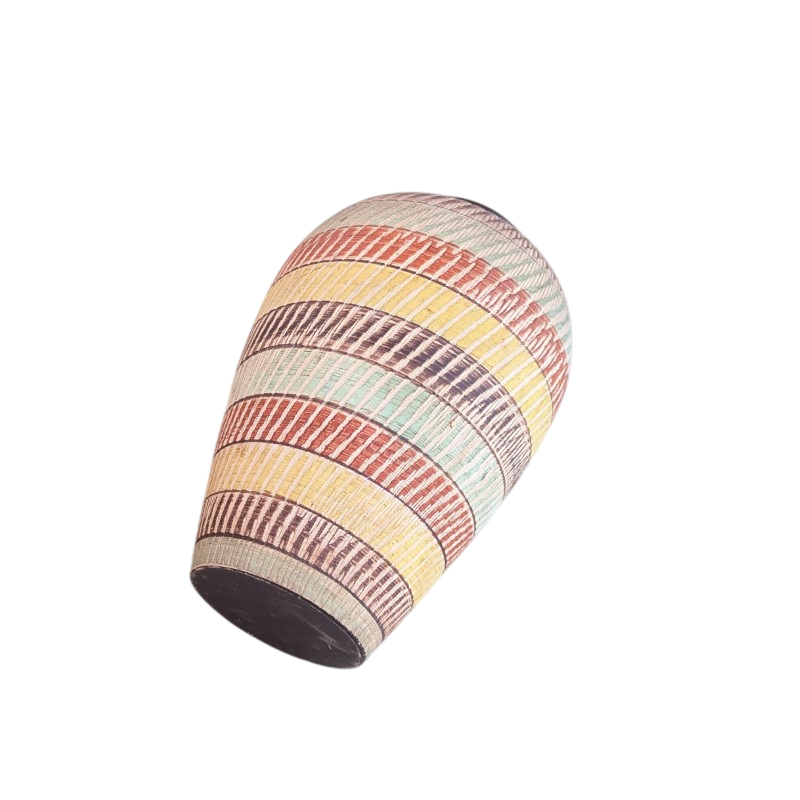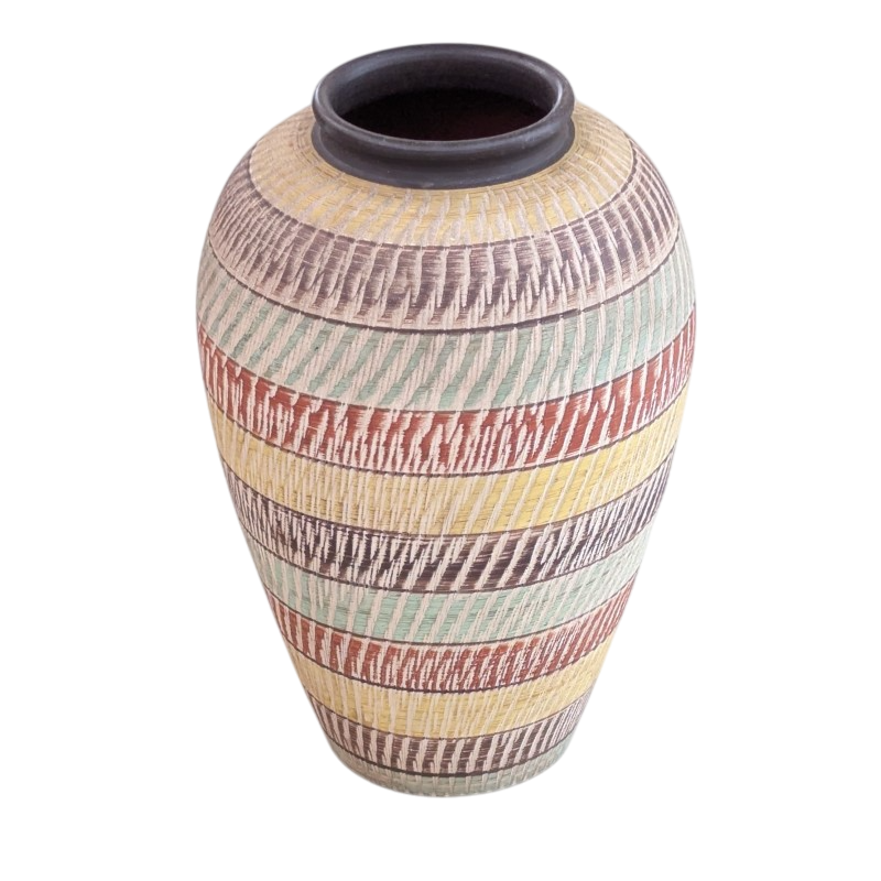 Dumler & Breiden sgraffito vaas uit de jaren vijftig/zetig. Grote vaas van keramiek, geproduceerd in West Germany, gemerkt ‘Handarbeit’ . Decoratief en kleurrijk.