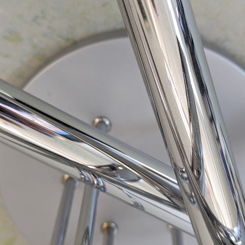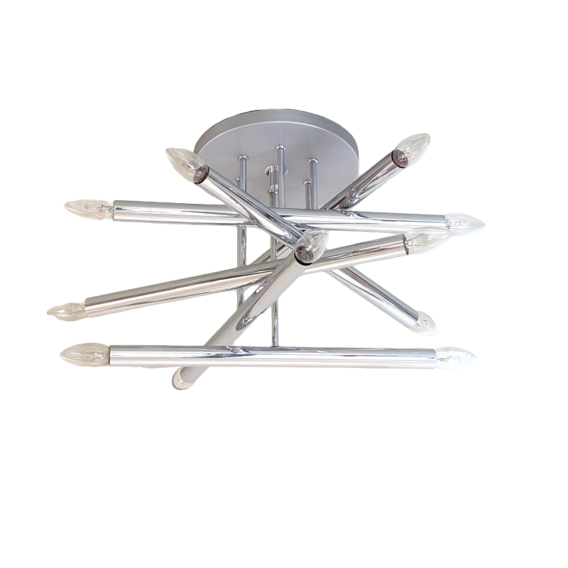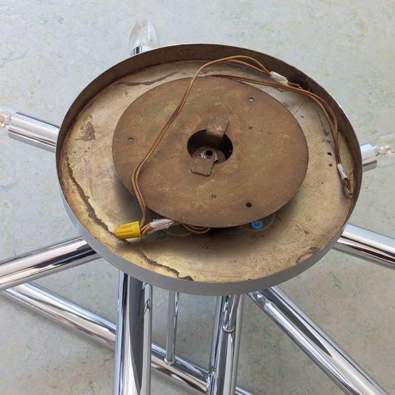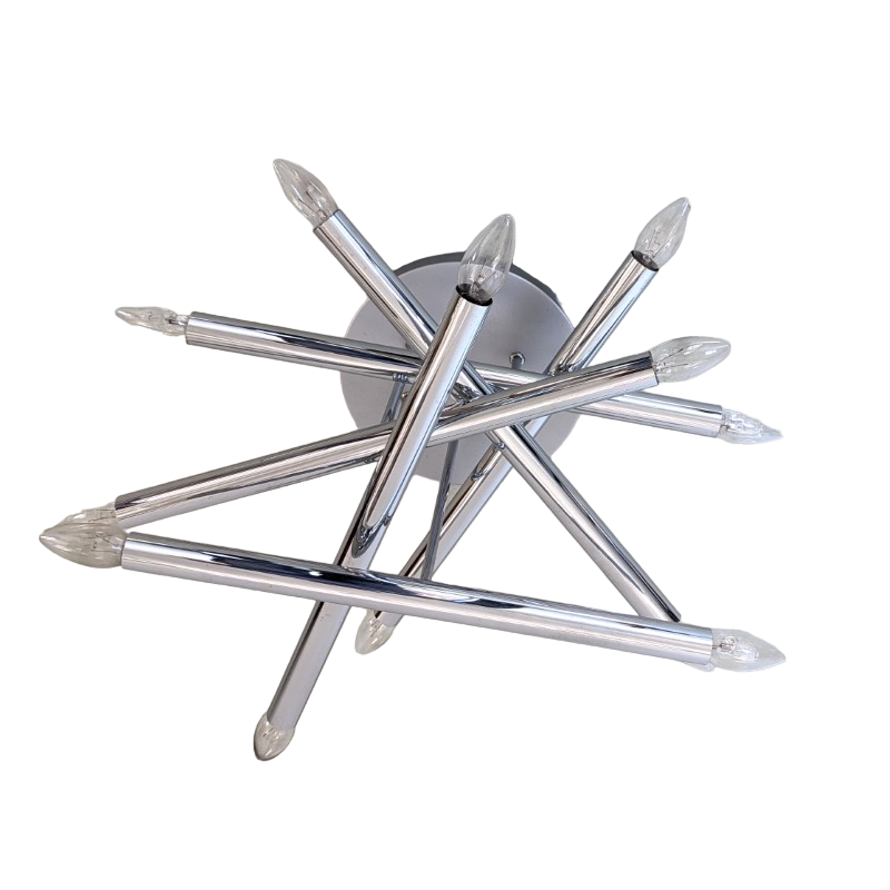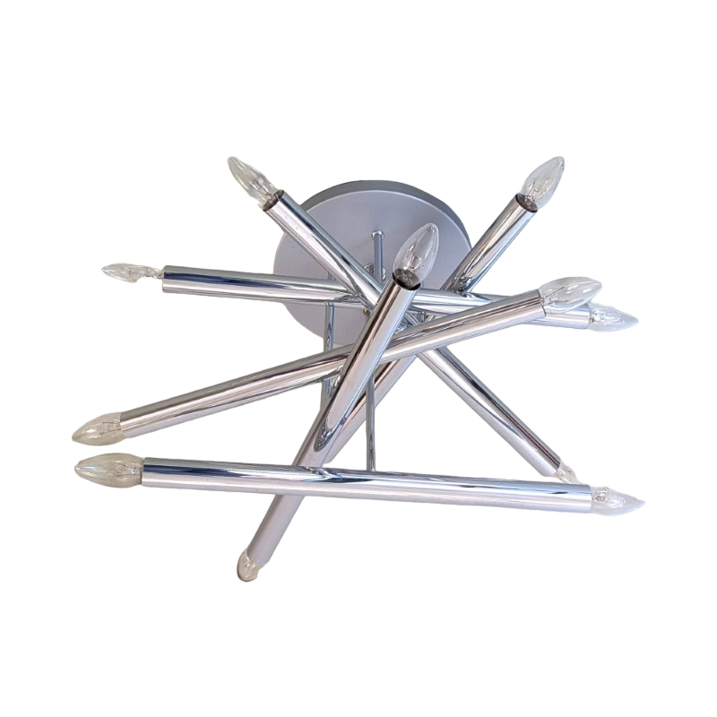 Zeer mooie en aparte plafondlamp jaren 70. Waarschijnlijk een ontwerp van Sciolari. Zes verchroomde buizen voor in totaal 12 gloeilampen op een grijs hamerslagverf metalen houder. Kleine fittingen, ook geschikt voor spaarlampen en led verlichting. In goede staat.