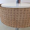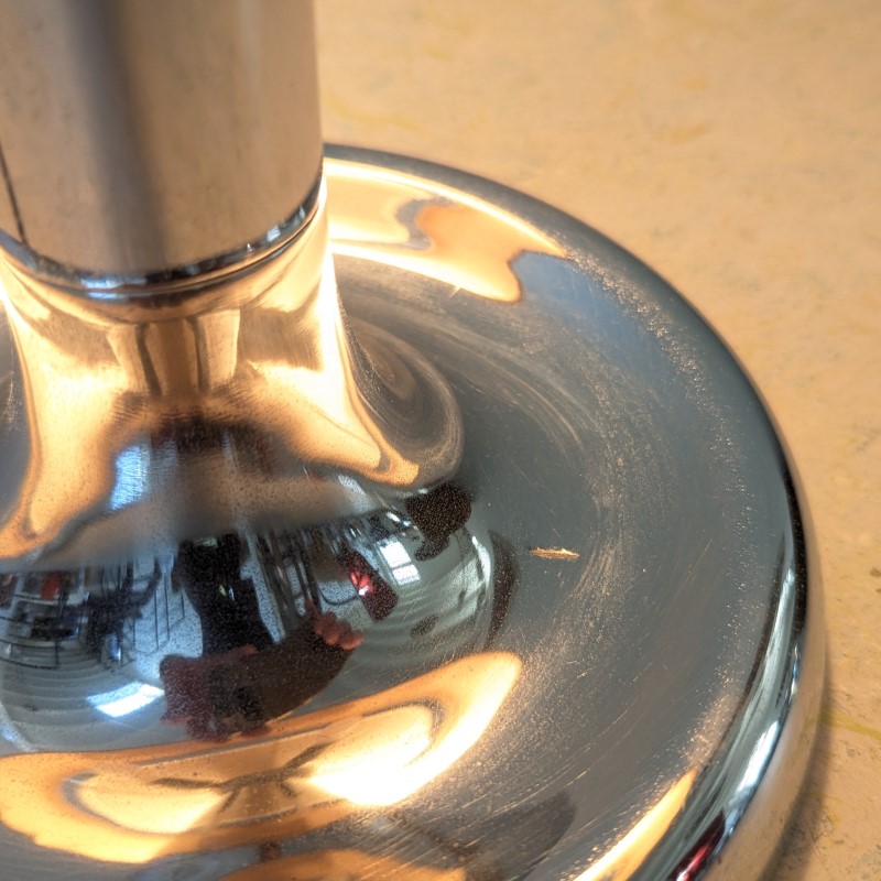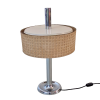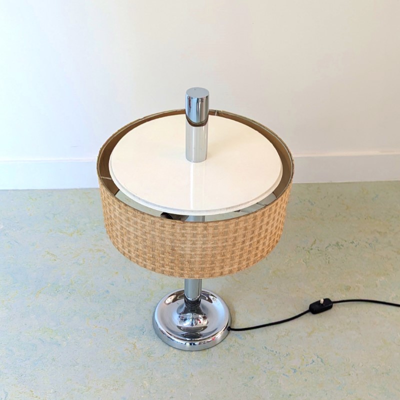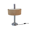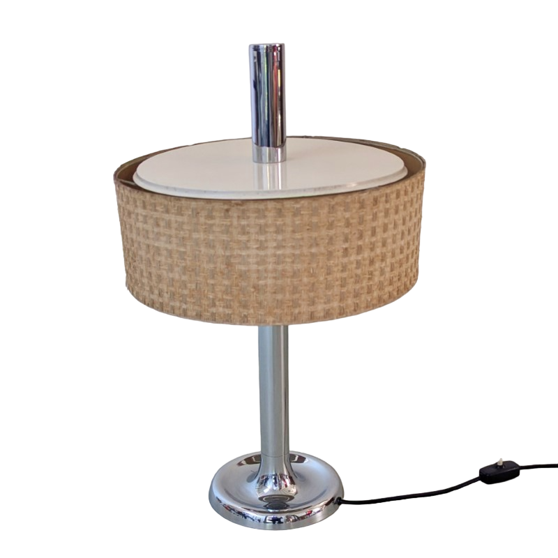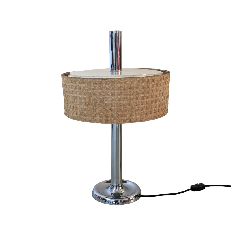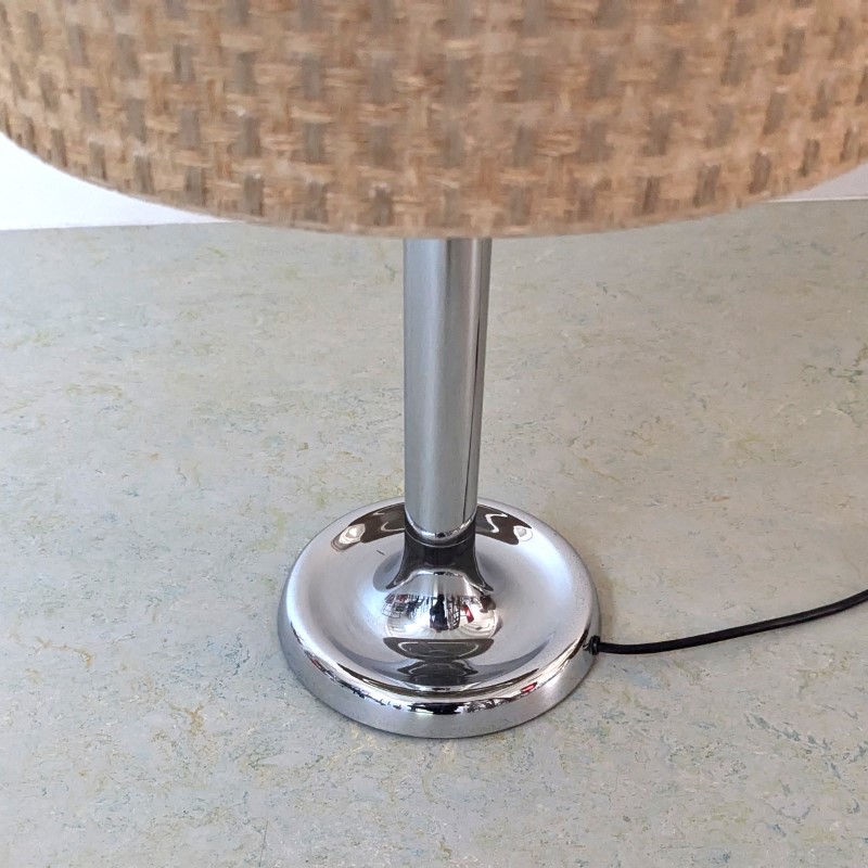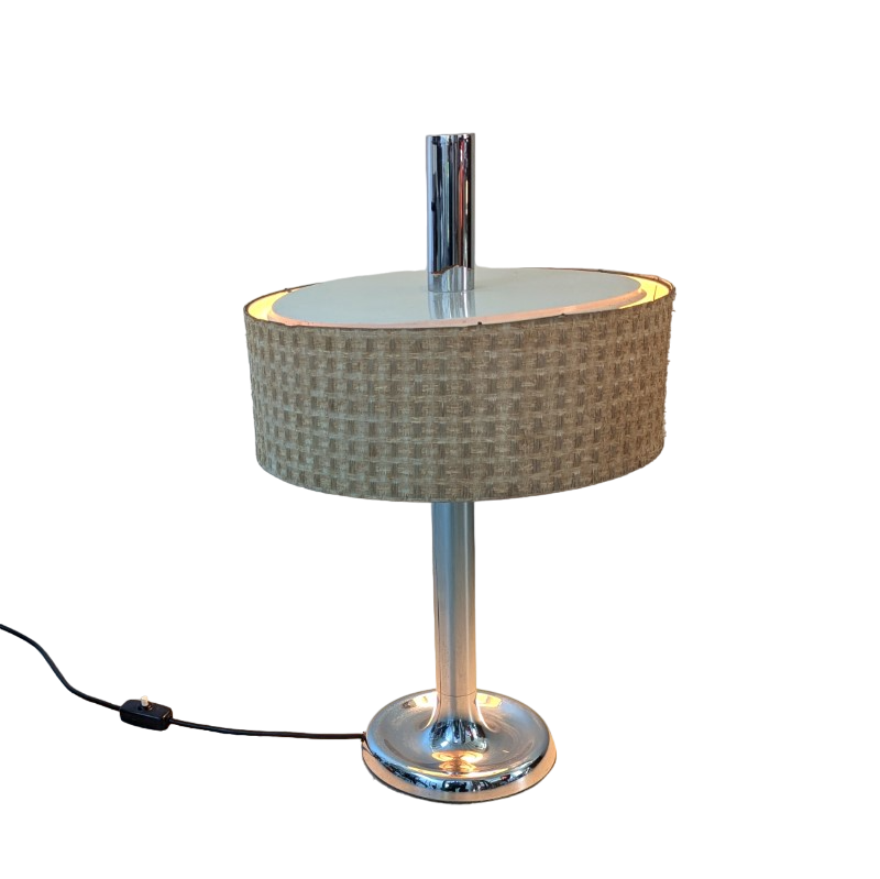Tafellamp met verchroomde voet en stang, met een mooie typische jaren 60/70 kap met linnen structuur. Klein deukje in de voet, zie detail foto. Schakelaar op de stroomdraad.
