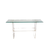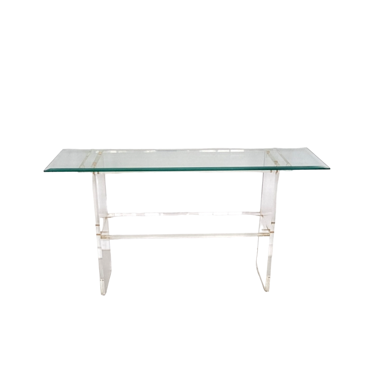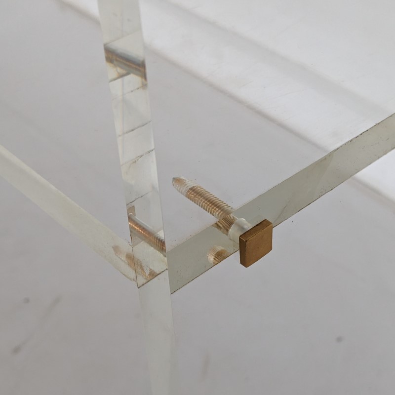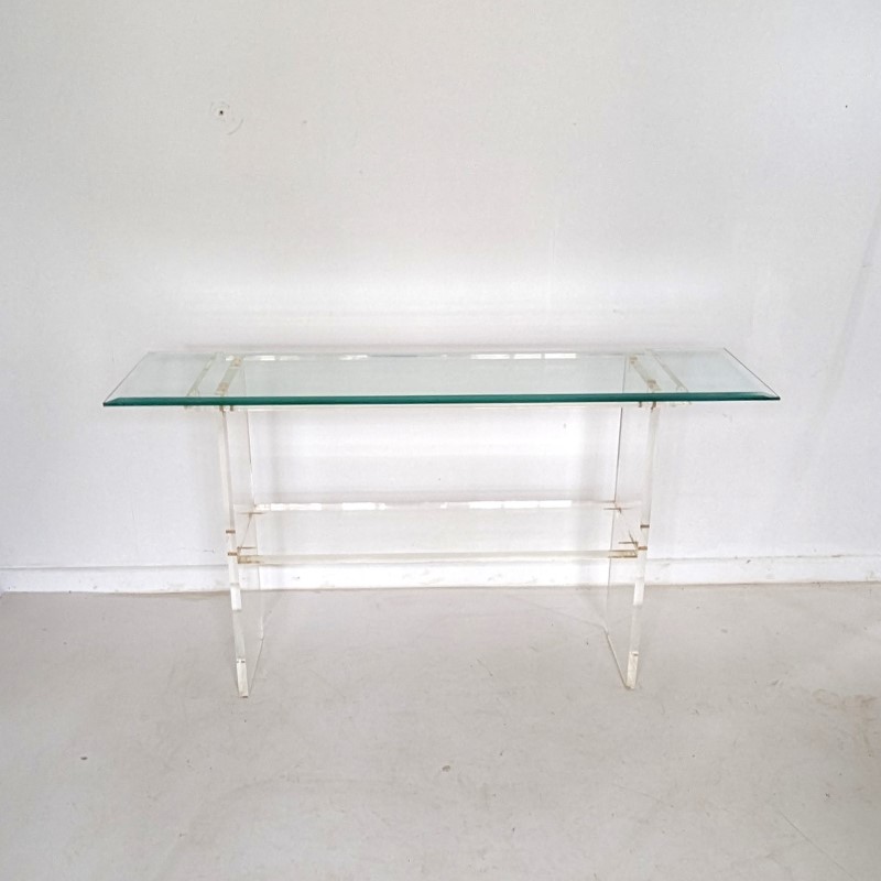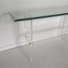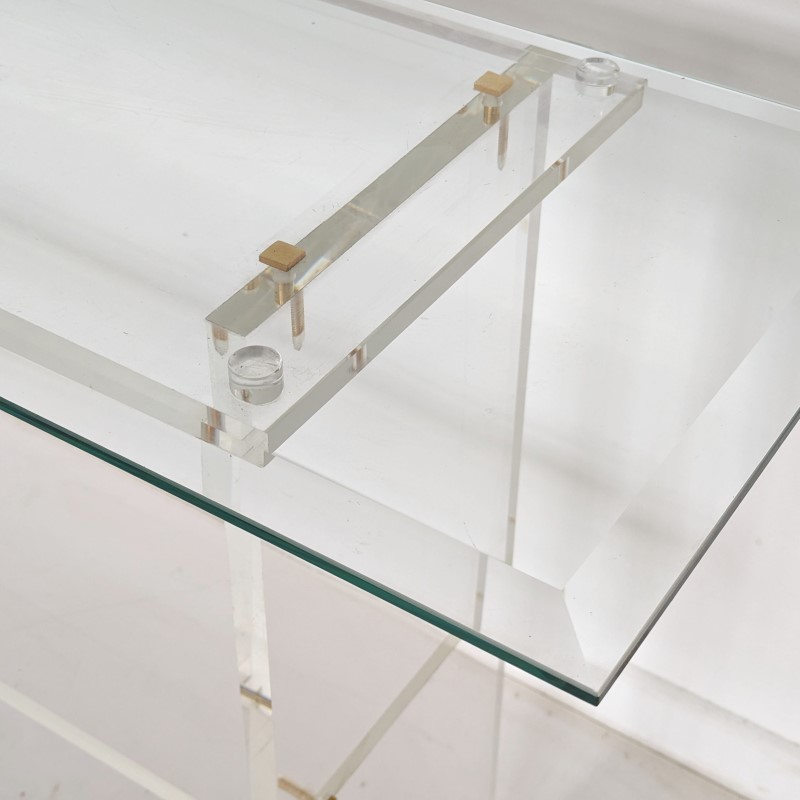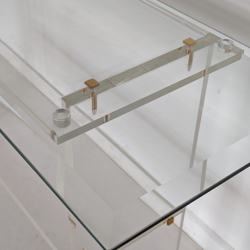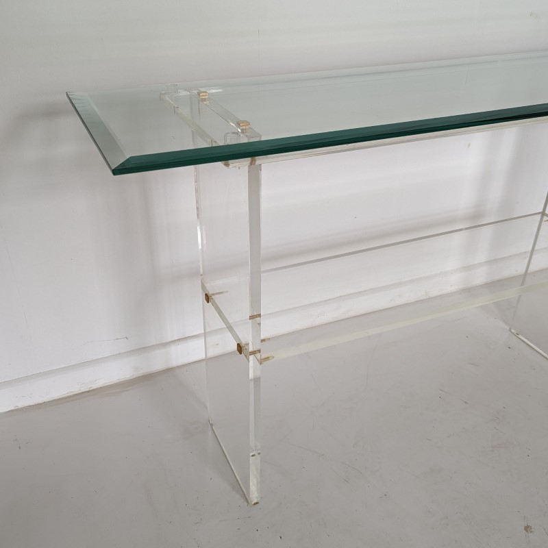 Vintage Italian jaren 70 perspex side table – console – wandtafel, met facet geslepen glazen top plaat, onderdelen van messing. Typische jaren 70/80 vormgeving in Hollywood Regency stijl. Het perspex en het glas hebben lichte gebruikssporen.