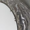 Jaren 60 wandspiegel met verlichting. Glazen kap met spiegelglas verlijmd. Jaren 60, waarschijnlijk geproduceerd bij Duitse firma Wila. Matzwarte wandplaat met één grote fitting Het glas met reliëf geeft een apart effect op de omgeving. Glas heeft op de bevestigingsrand 2 chips, is niet zichtbaar en geen invloed op de bevestiging. Spiegelglas heeft hier en daar aan de buitenrand wat weer, zie de foto’s.