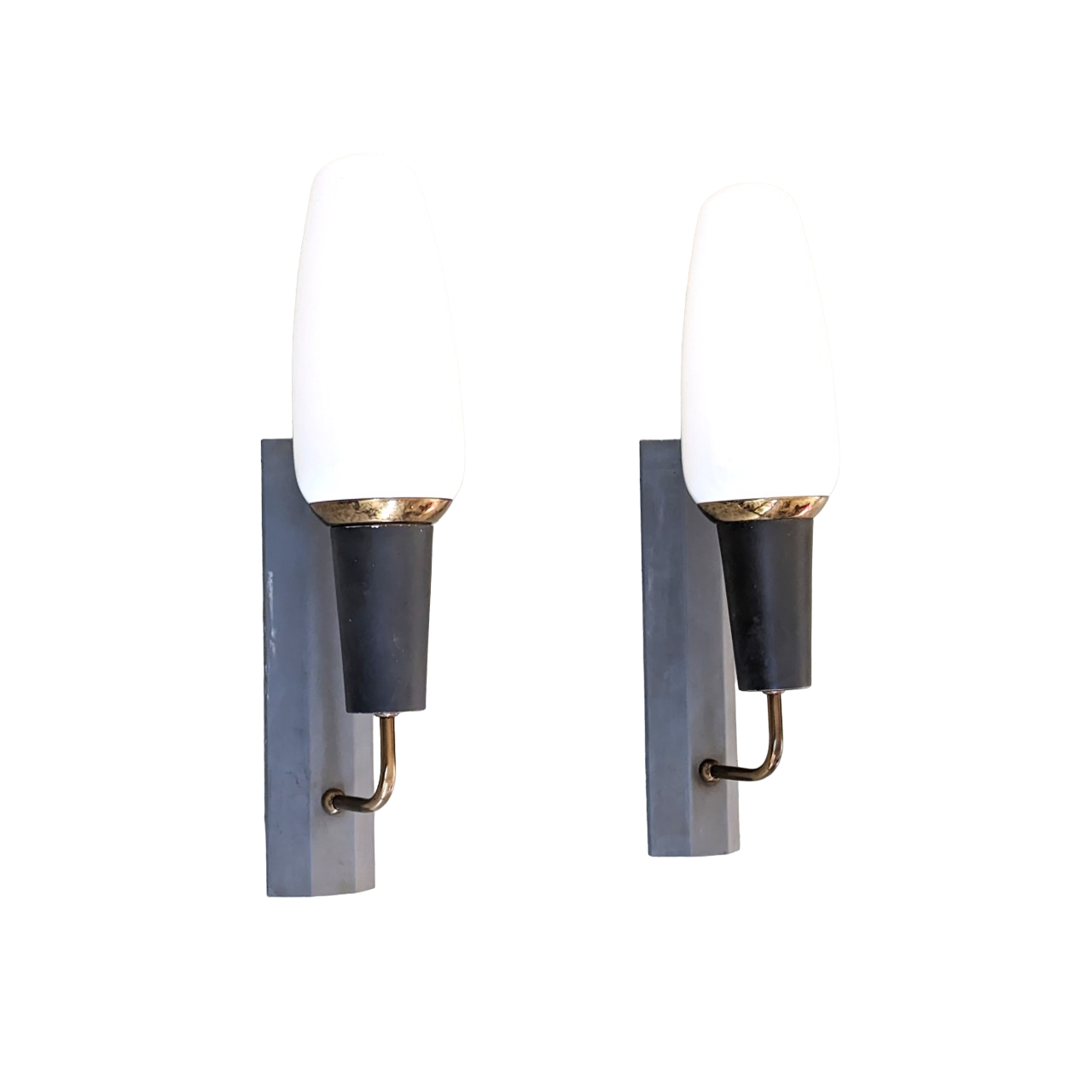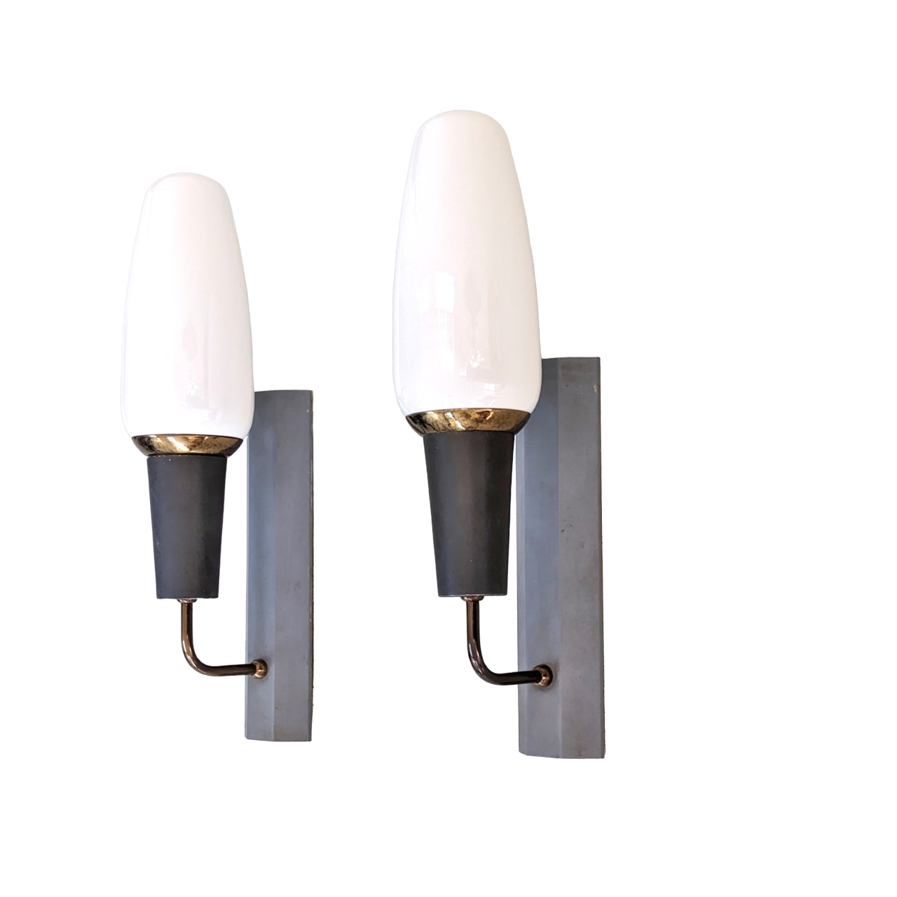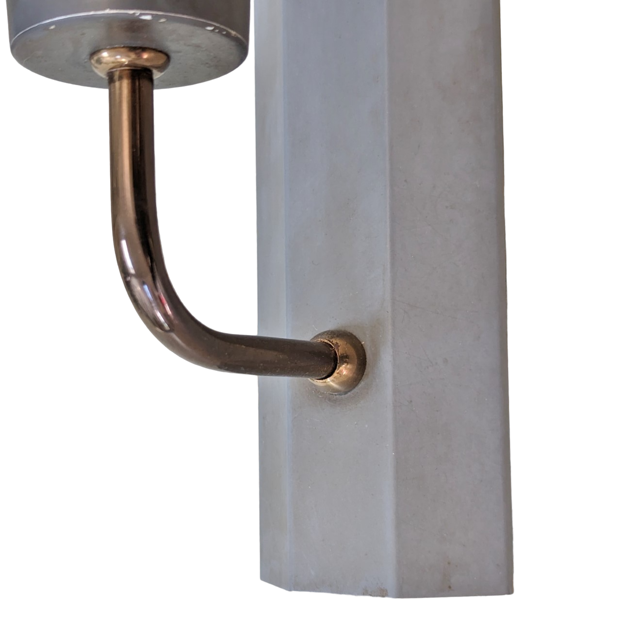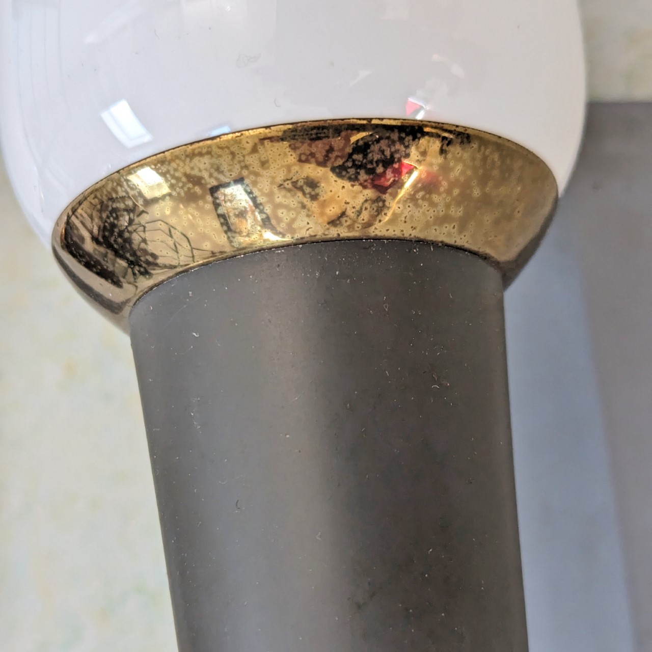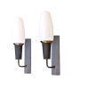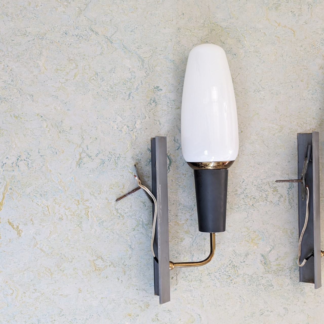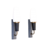 Jaren 50 wandlampen van Philips, waar de gloeilamp een onderdeel is van de vormgeving. Aluminium, messing. Of deze gloeilamp nog te verkrijgen is mij niet duidelijk, heb het  niet kunnen achterhalen. Originele wandbevestigingen aanwezig. Normale vintage conditie, weinig gebruikssporen.