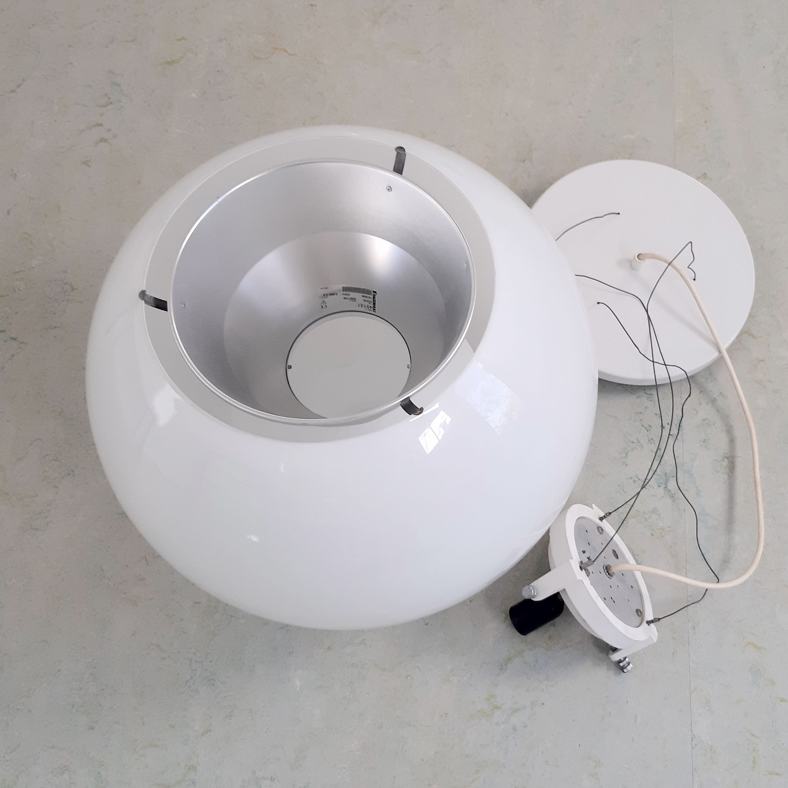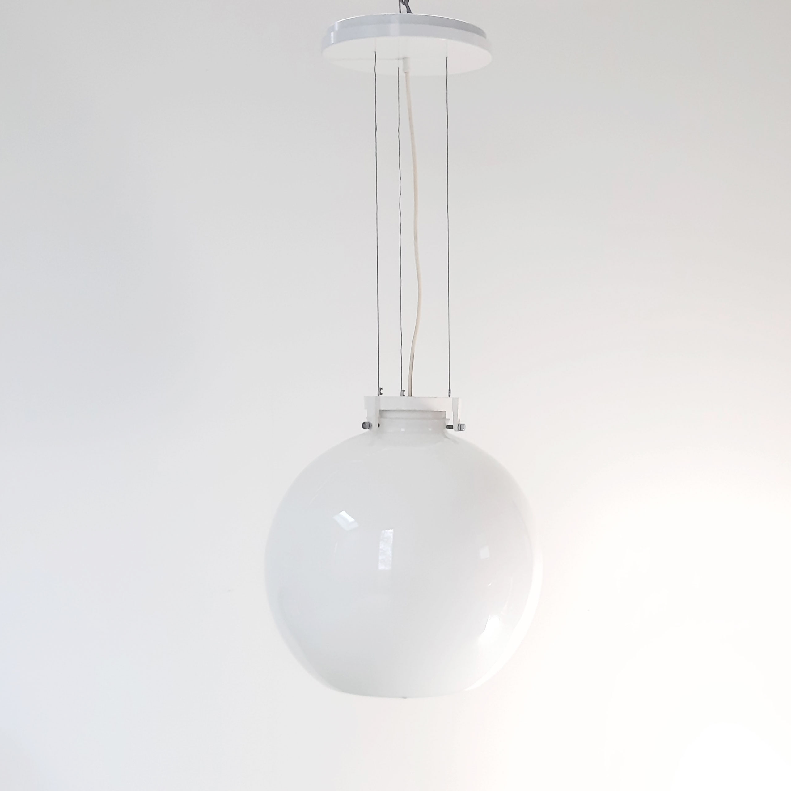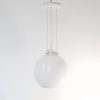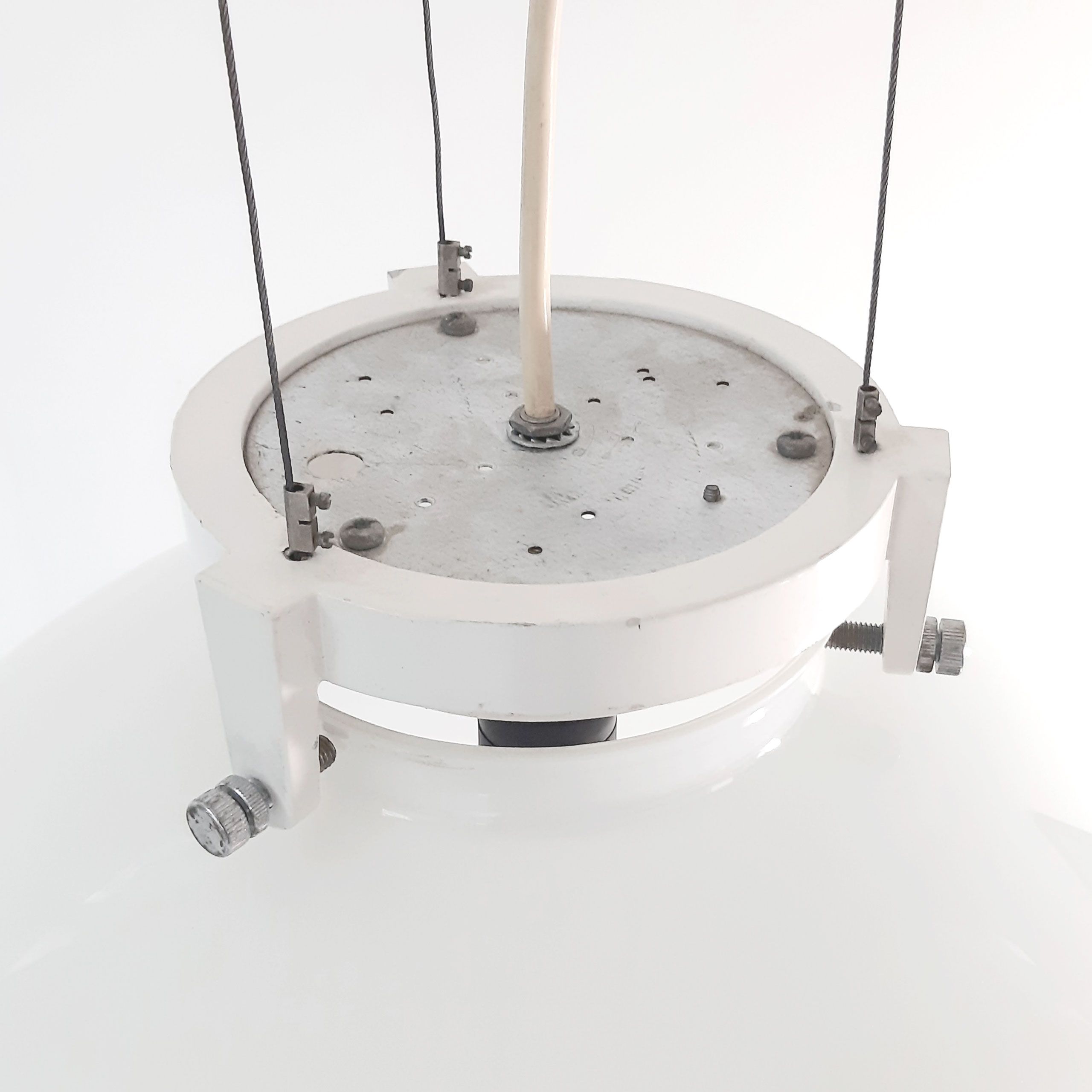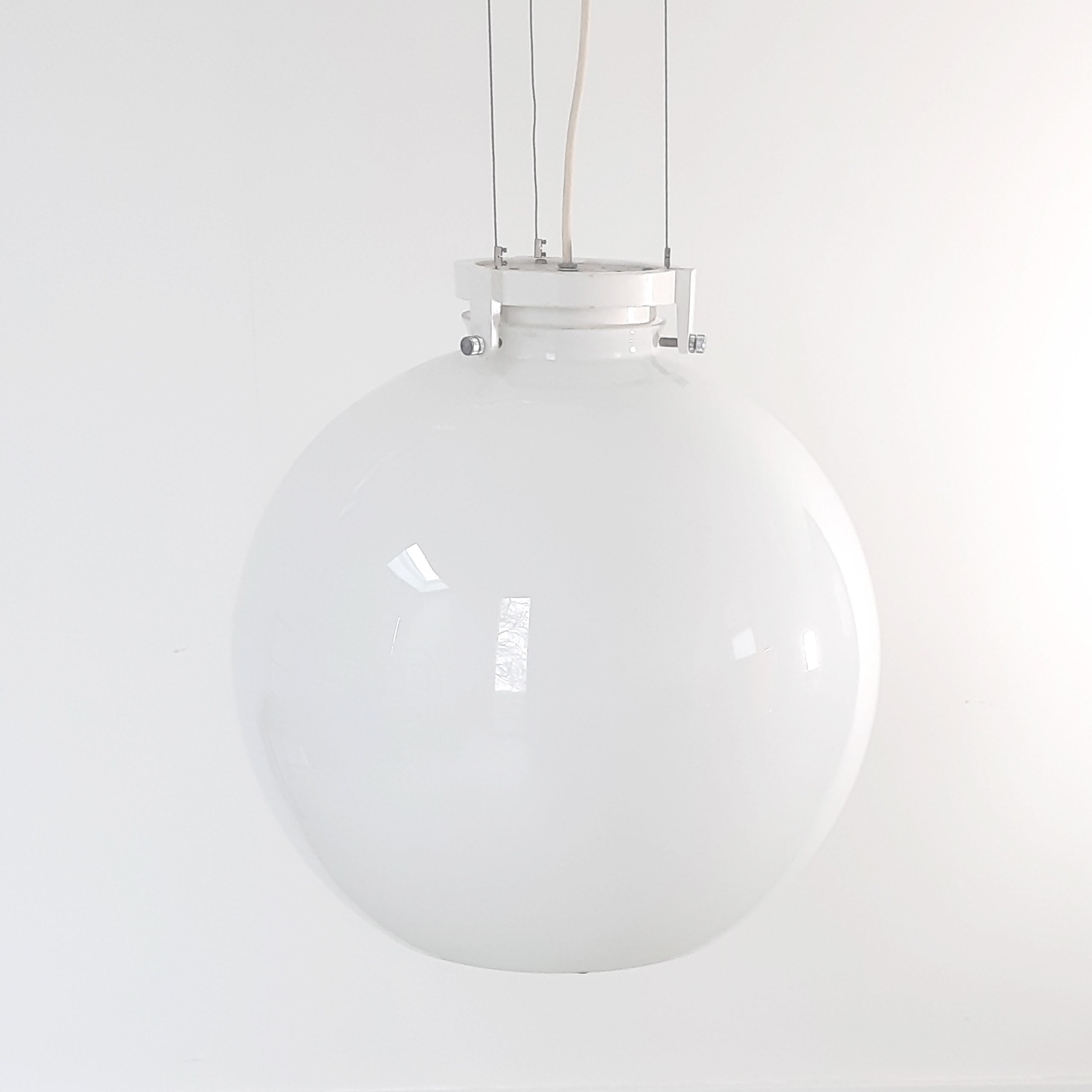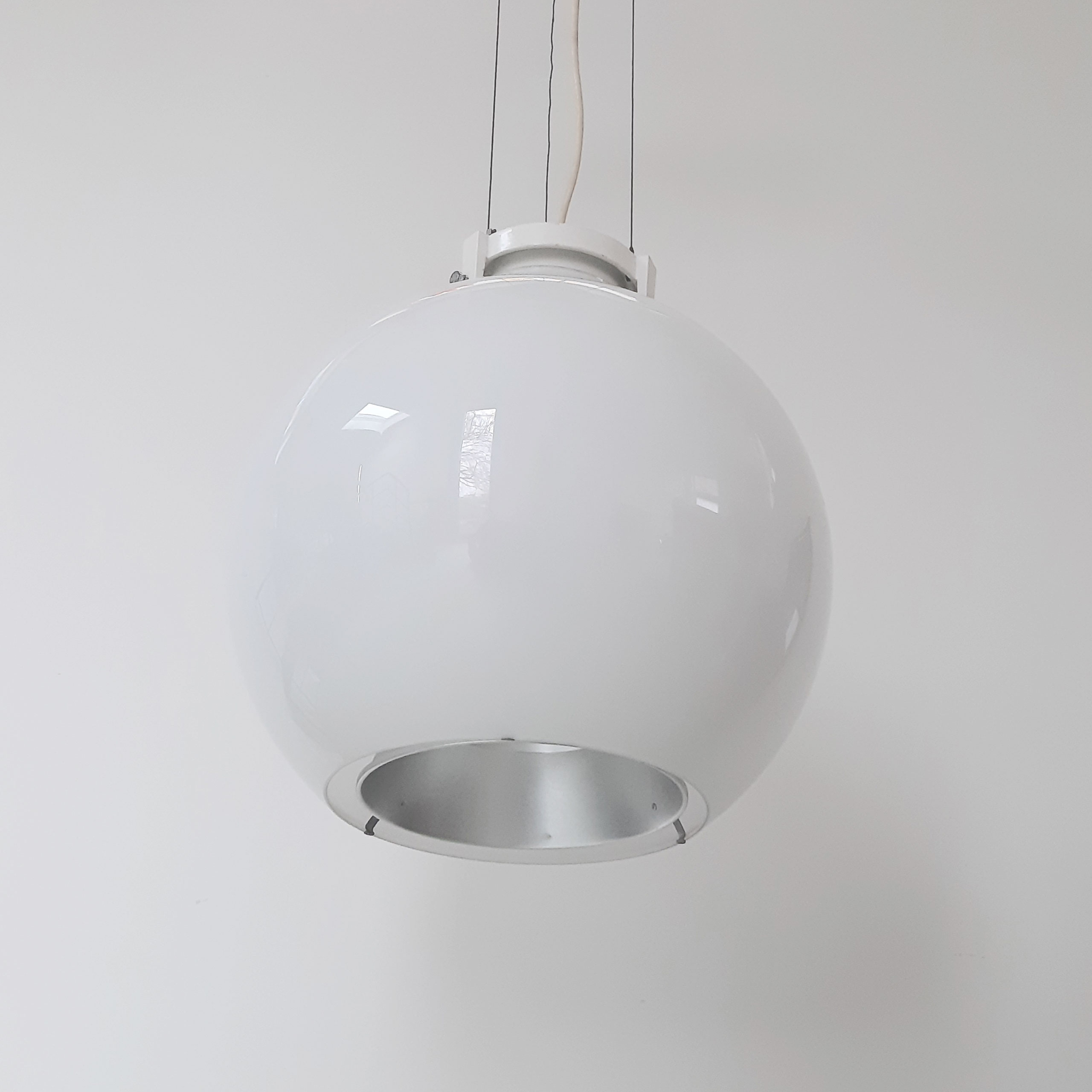 Enorme grote bollamp uit de jaren 80, metalen plafondplaat, staaldraad, gietijzeren glashouder en opaal glas. Onderkant van het glas is open en daar is een verchroomde spot in verwerkt. Gemerkt.